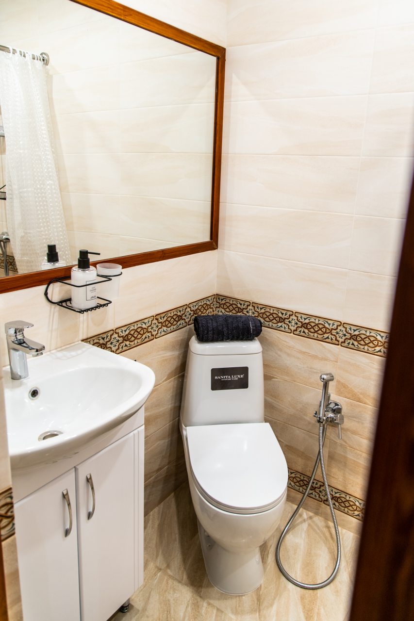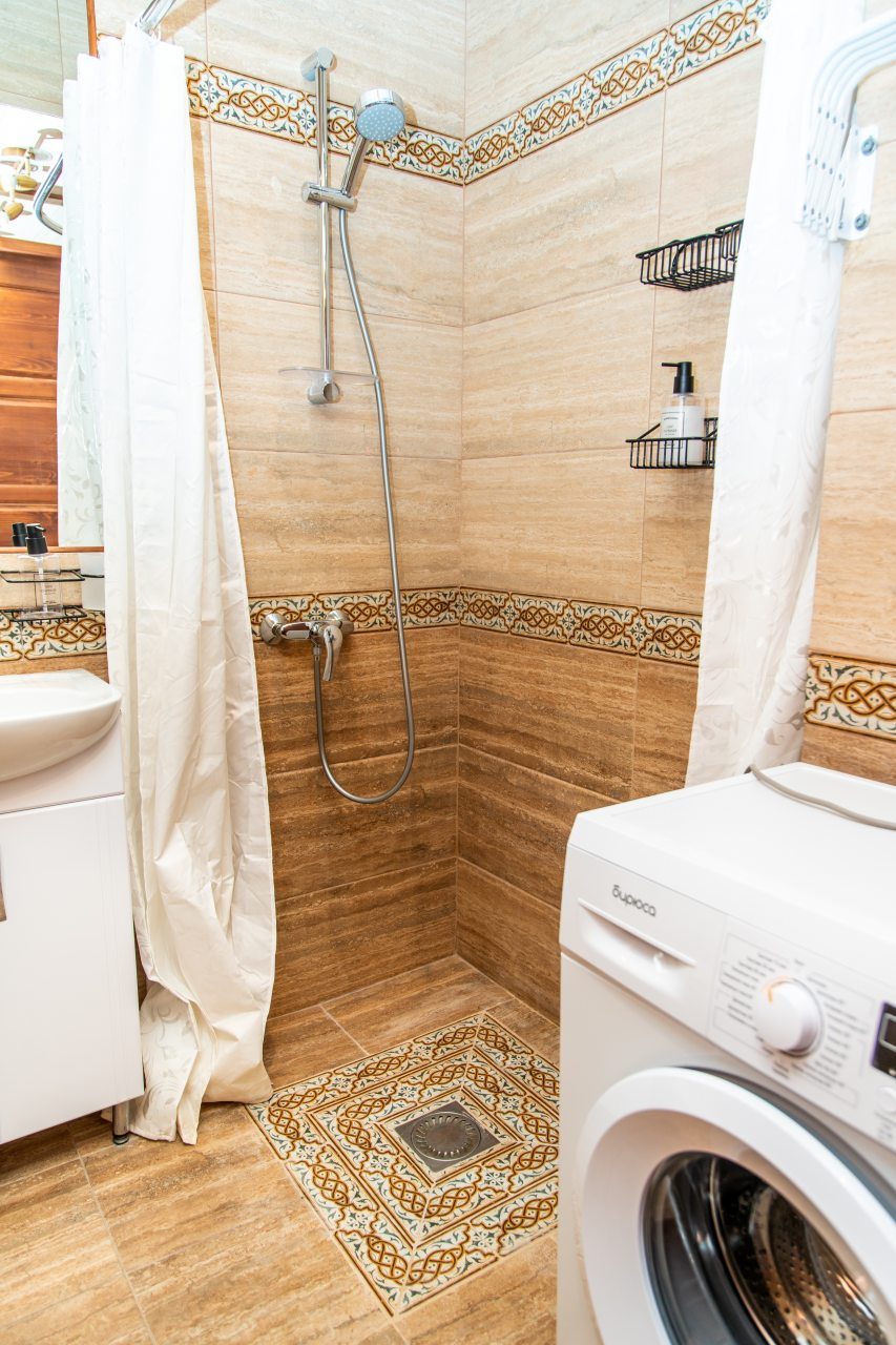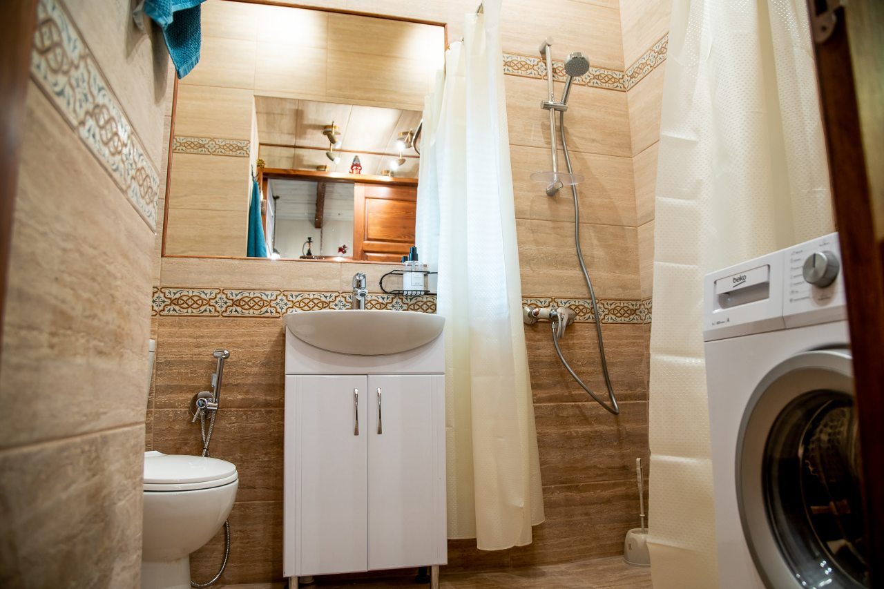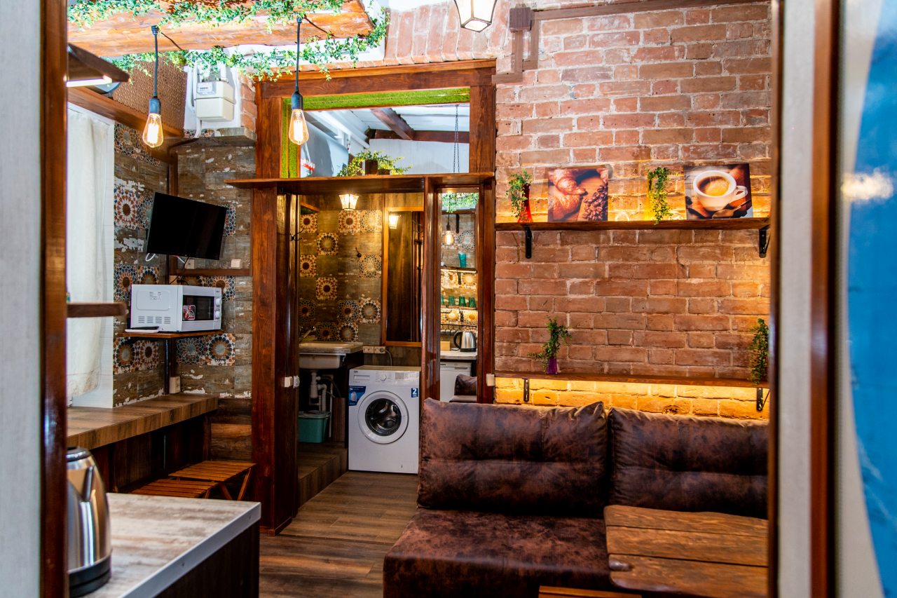 В гостевом доме предусмотрена вся нужная мебель, а также балкон, отопление, ванная комната с феном, есть стиральная машина. На крыше размещена веранда.