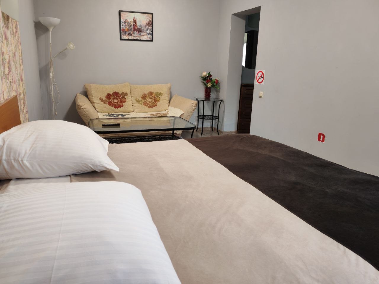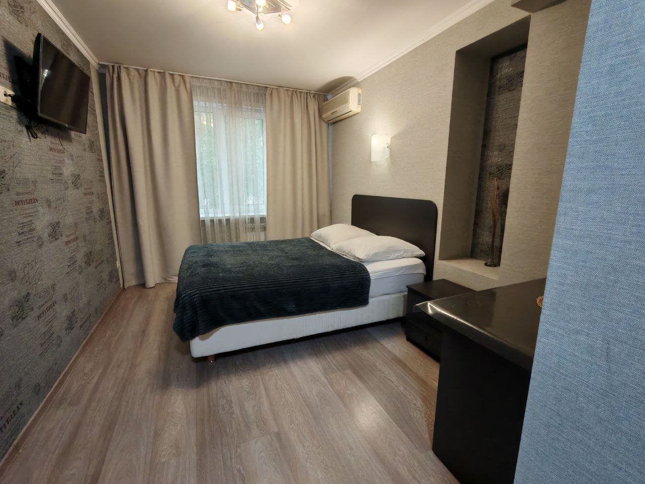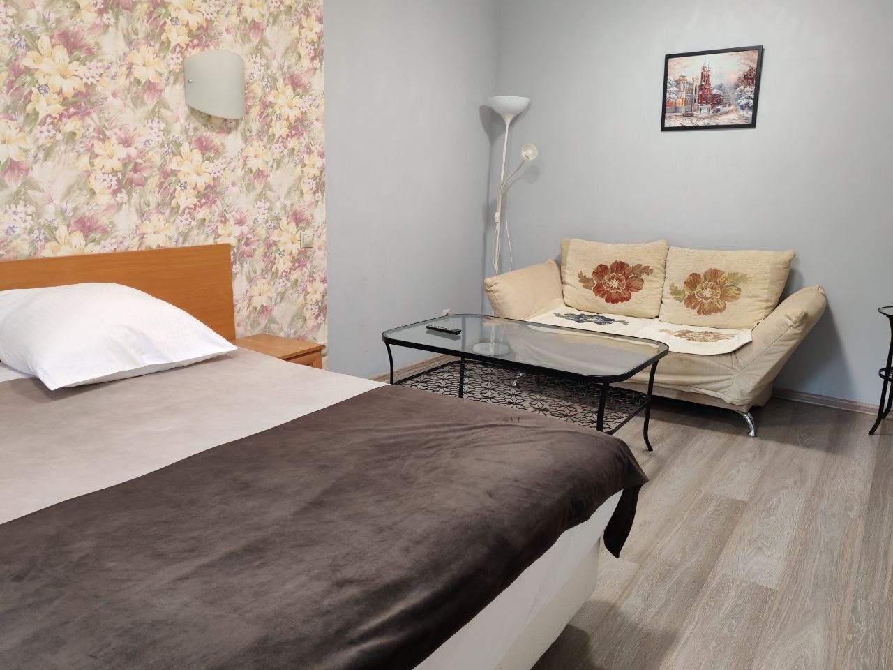 Отель удобно расположен в жилом доме ,рядом остановки общественного транспорта ,близость магазинов ,вежливый персонал ,есть кухня с посудой с плитой ,микроволновкой ,что очень удобно ,имеется холодильник ,в общем всё устраивает ,и стоимость проживания ,рекомендуем .
