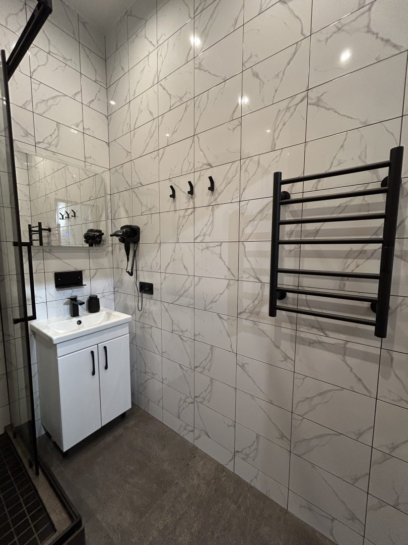 В апартаментах есть всё необходимое: кухня с большим количеством техники и посуды, гладильные принадлежности, сушилка для белья, мобильный кондиционер, в коридоре есть стиральная машина на 2 квартиры