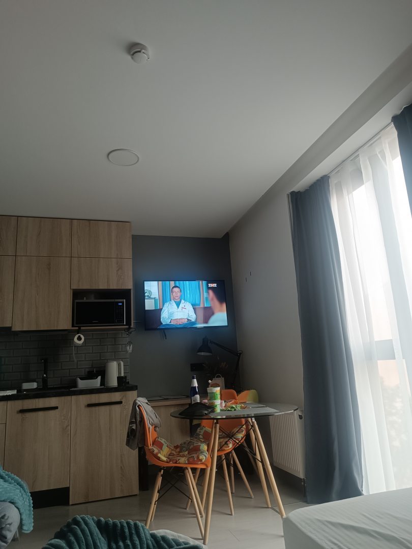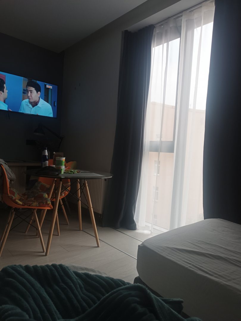 Красивый номер со всем необходимым для отдыха. Прекрасное, белоснежное белье, комфортный для сна матрац, хорошо оборудованный кухонный уголок с хорошей посудой и столовыми приборами, минимальный продуктовый набор. Просторная душевая комната с новой сантехникой, стиральная машина со вложенной капсулой для стирки. На первом этаже зона еды и отдыха на любой гастрономический вкус. Вдоль здания первые этажи - это кафе, магазины, где можно недорого и вполне сносно поесть и купить продукты..