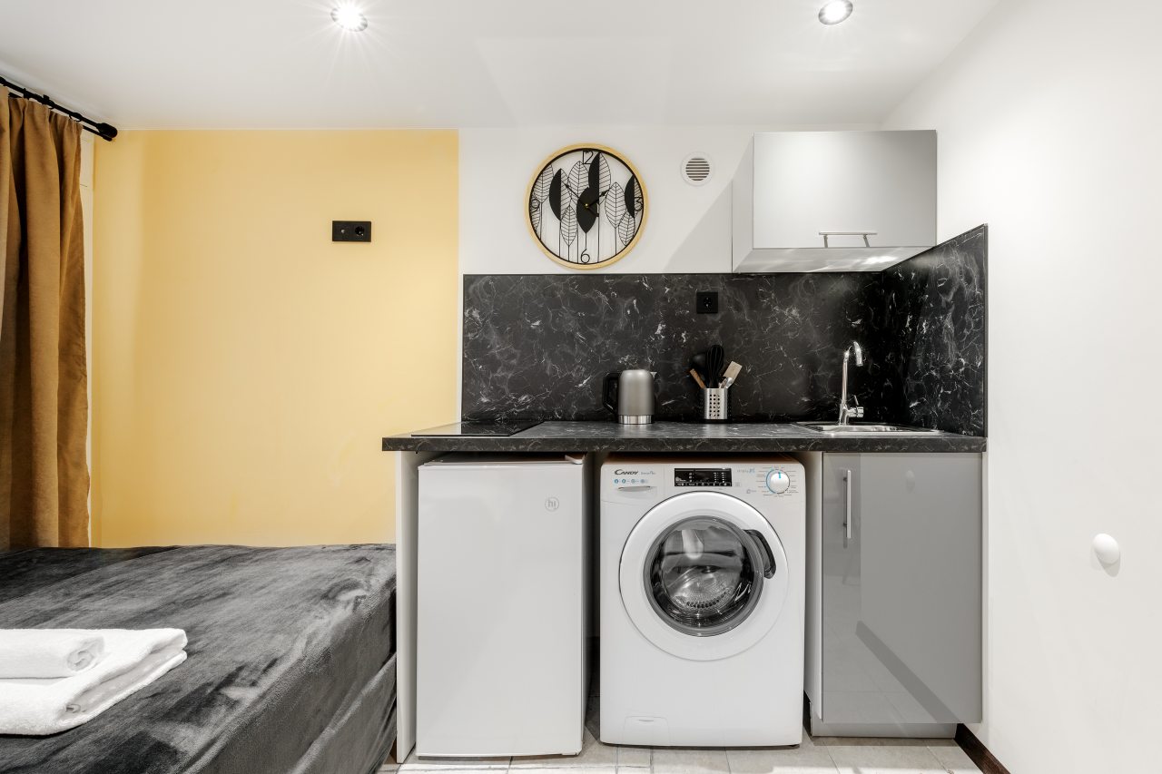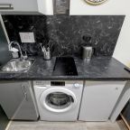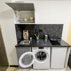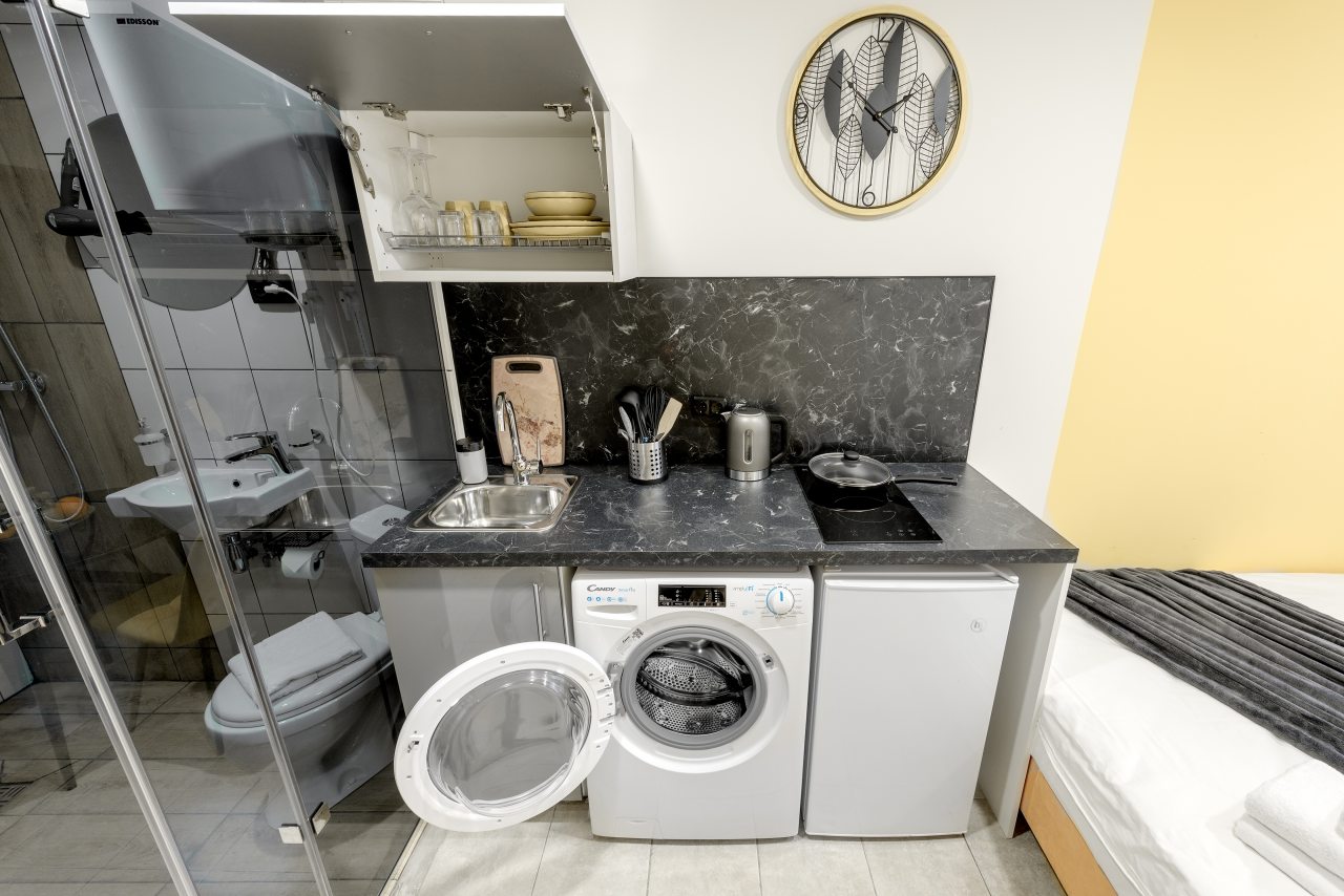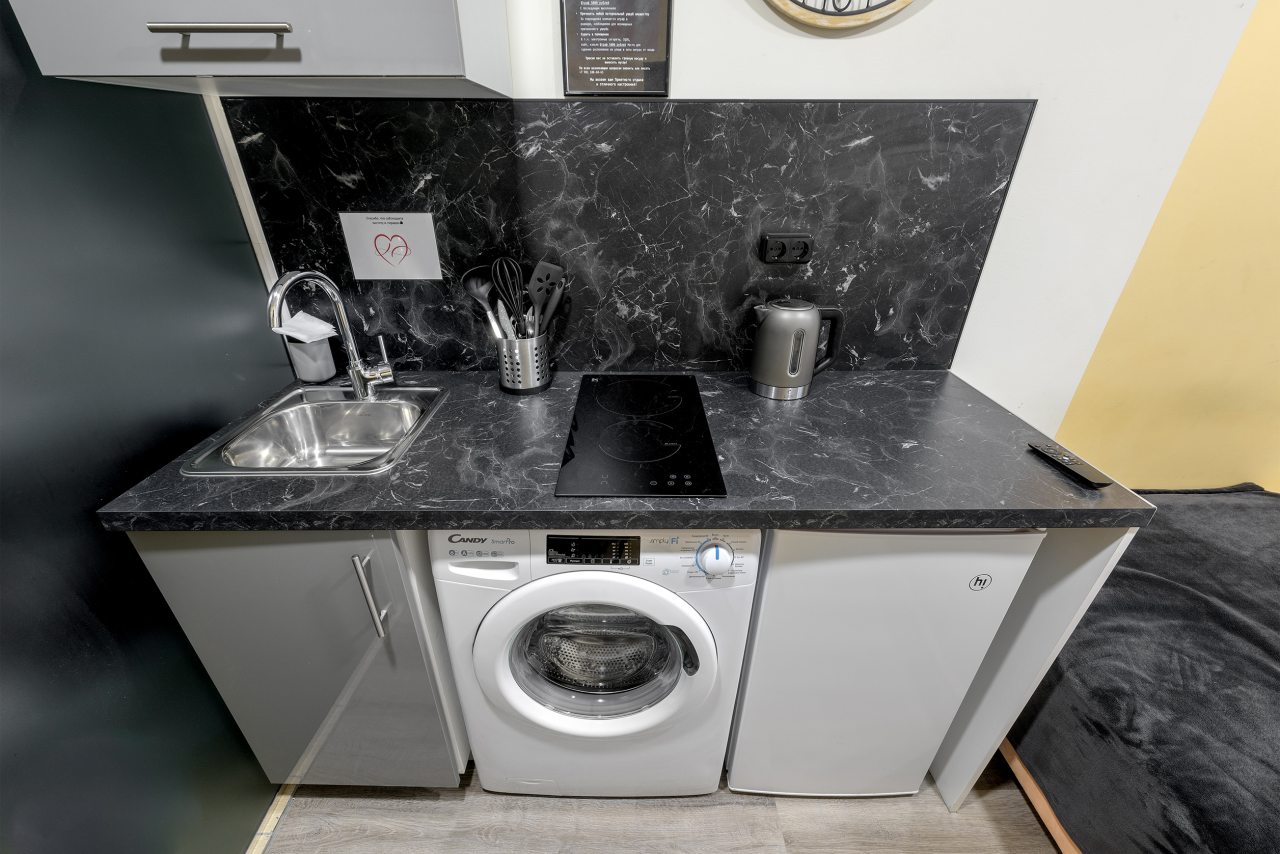На кухне вы найдется посуду, варочную панель, столовые приборы, чайник и холодильник. На этаже есть микроволновая печь в общем пользовании. Рядом есть множество заведений и магазинов.