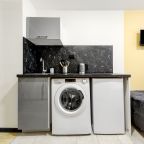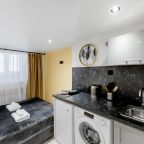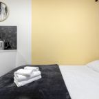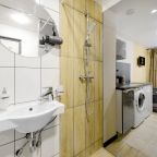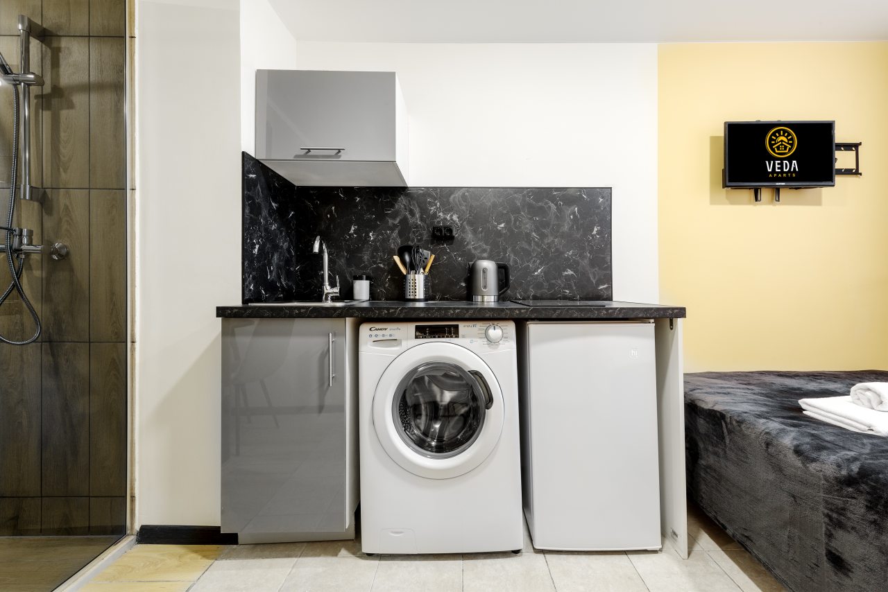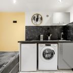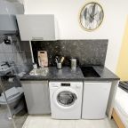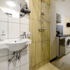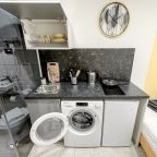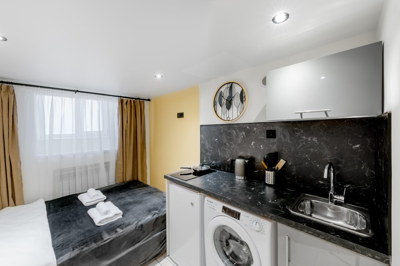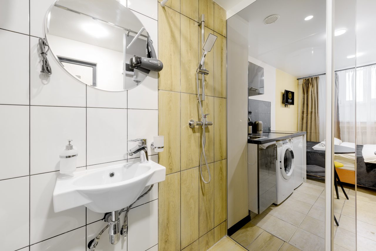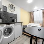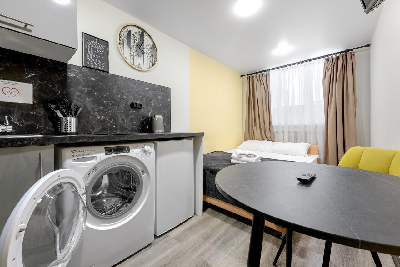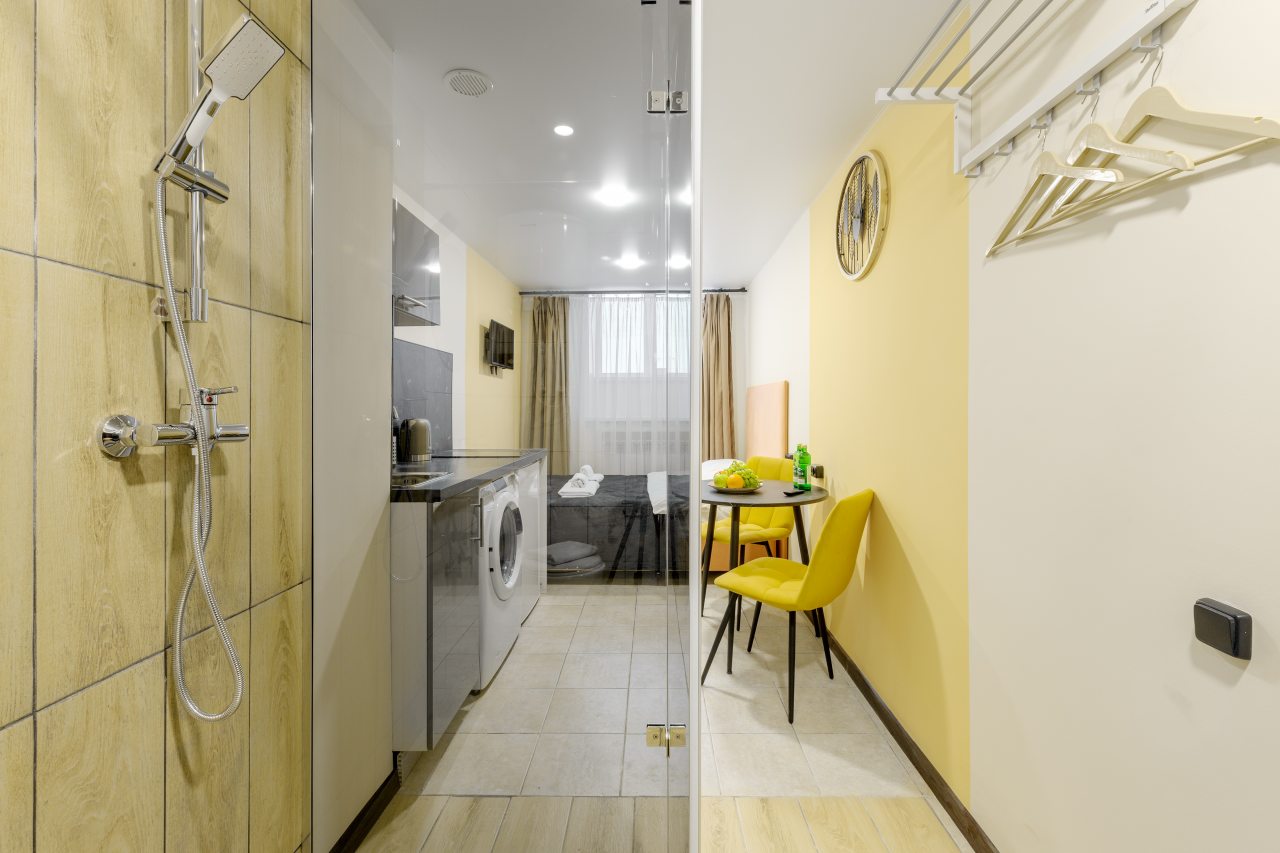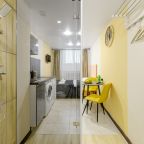 Очень яркие и новенькие апартаменты! Очень приятно в таких гостить. Все чисто, отличная техника на кухне. Все работает исправно. Необычная ванная комната только. Очень маленькая и по сути в самой комнате расположена.