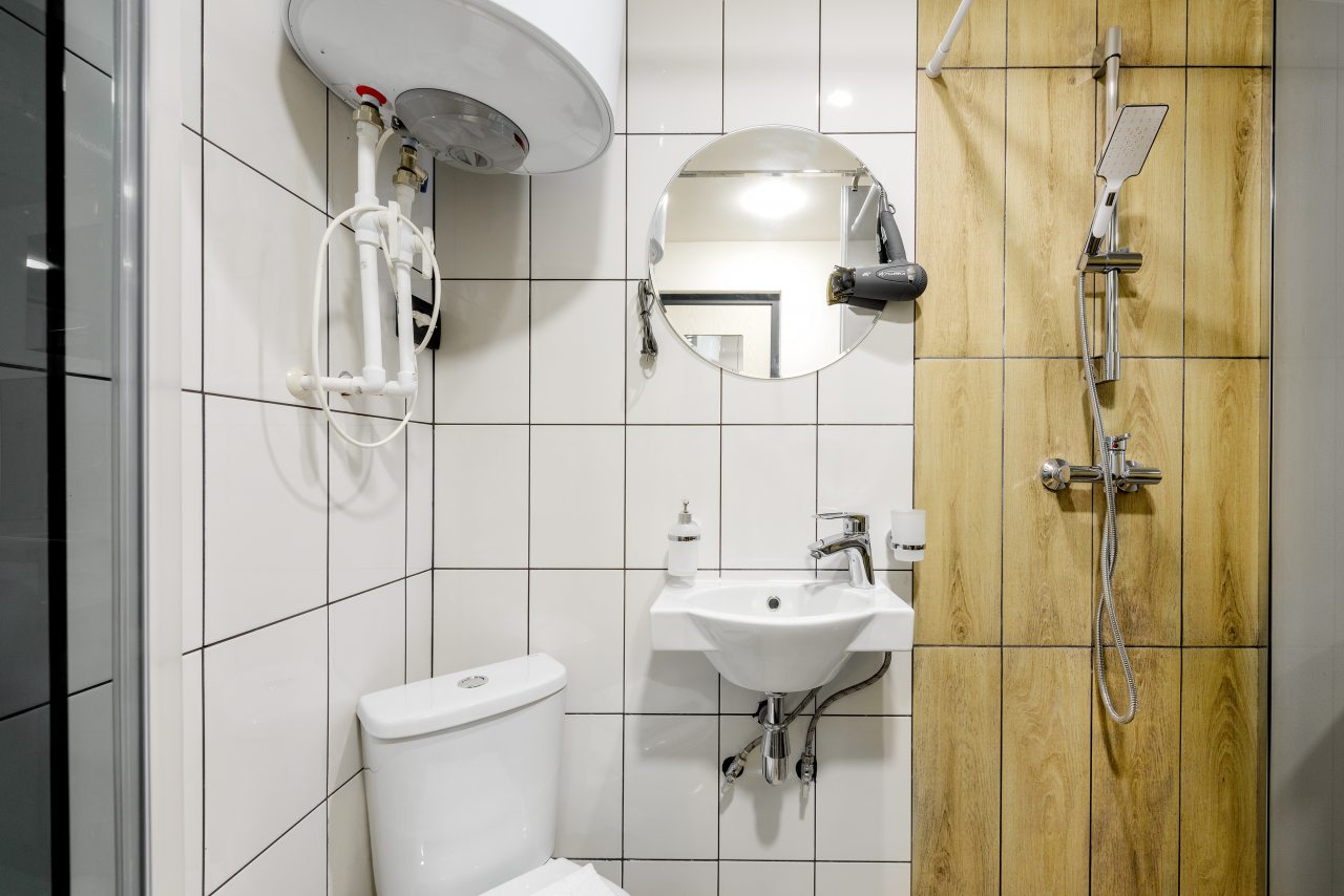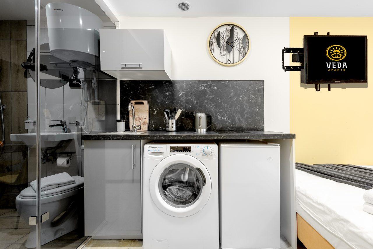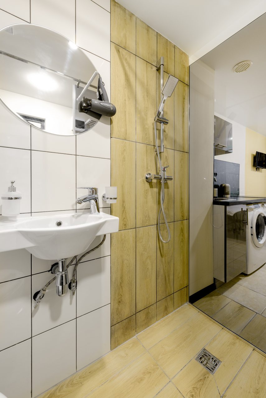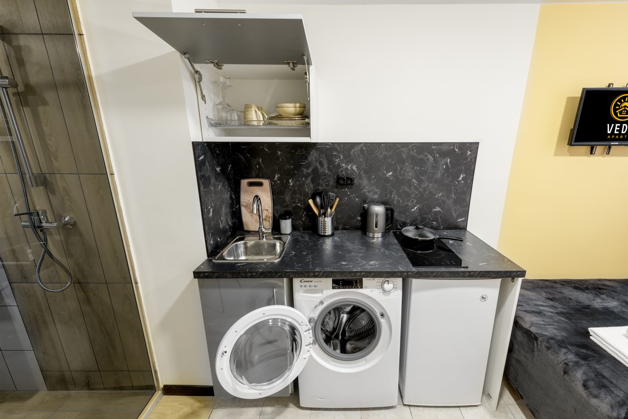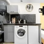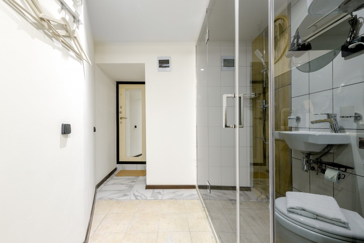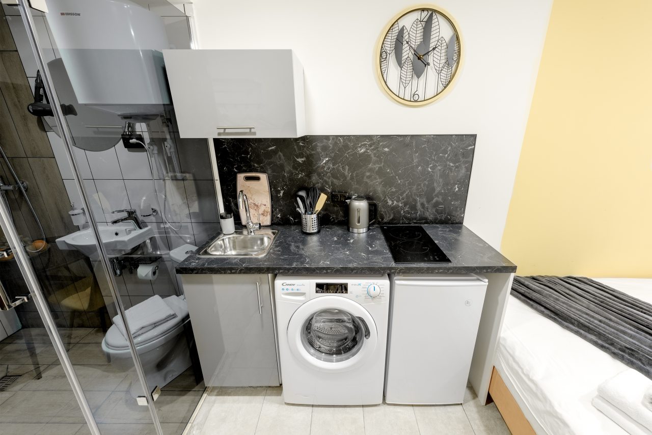 Очень яркие и новенькие апартаменты! Очень приятно в таких гостить. Все чисто, отличная техника на кухне. Все работает исправно. Необычная ванная комната только. Очень маленькая и по сути в самой комнате расположена.