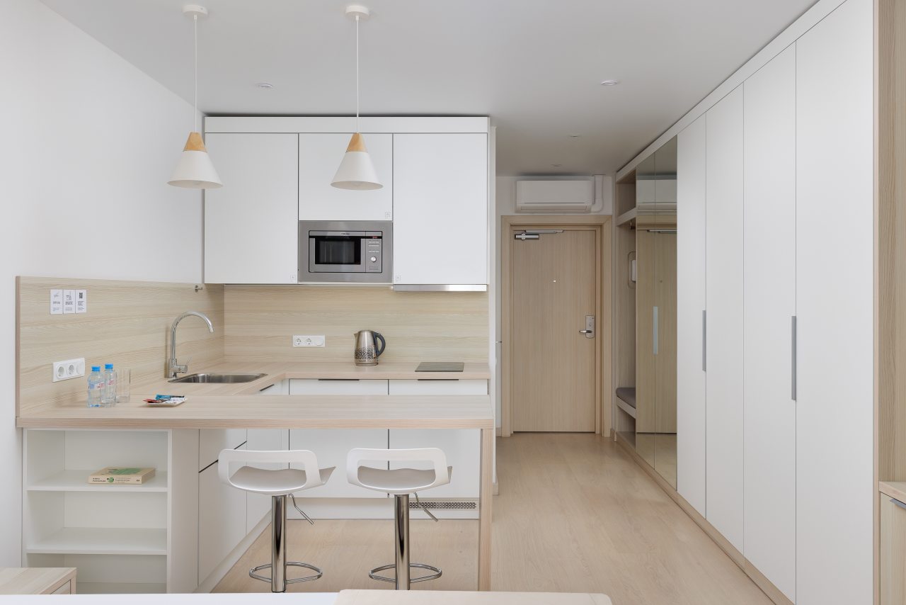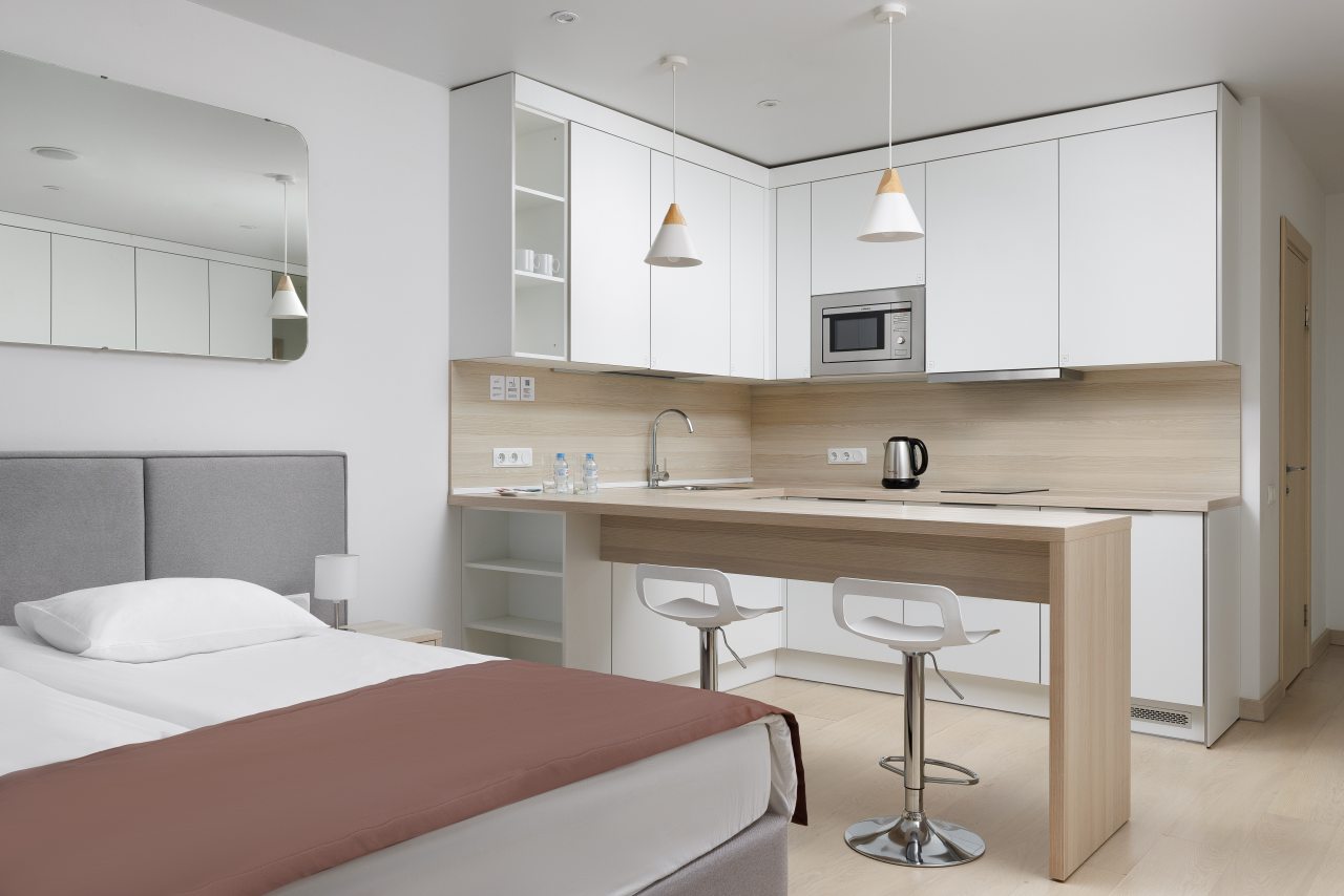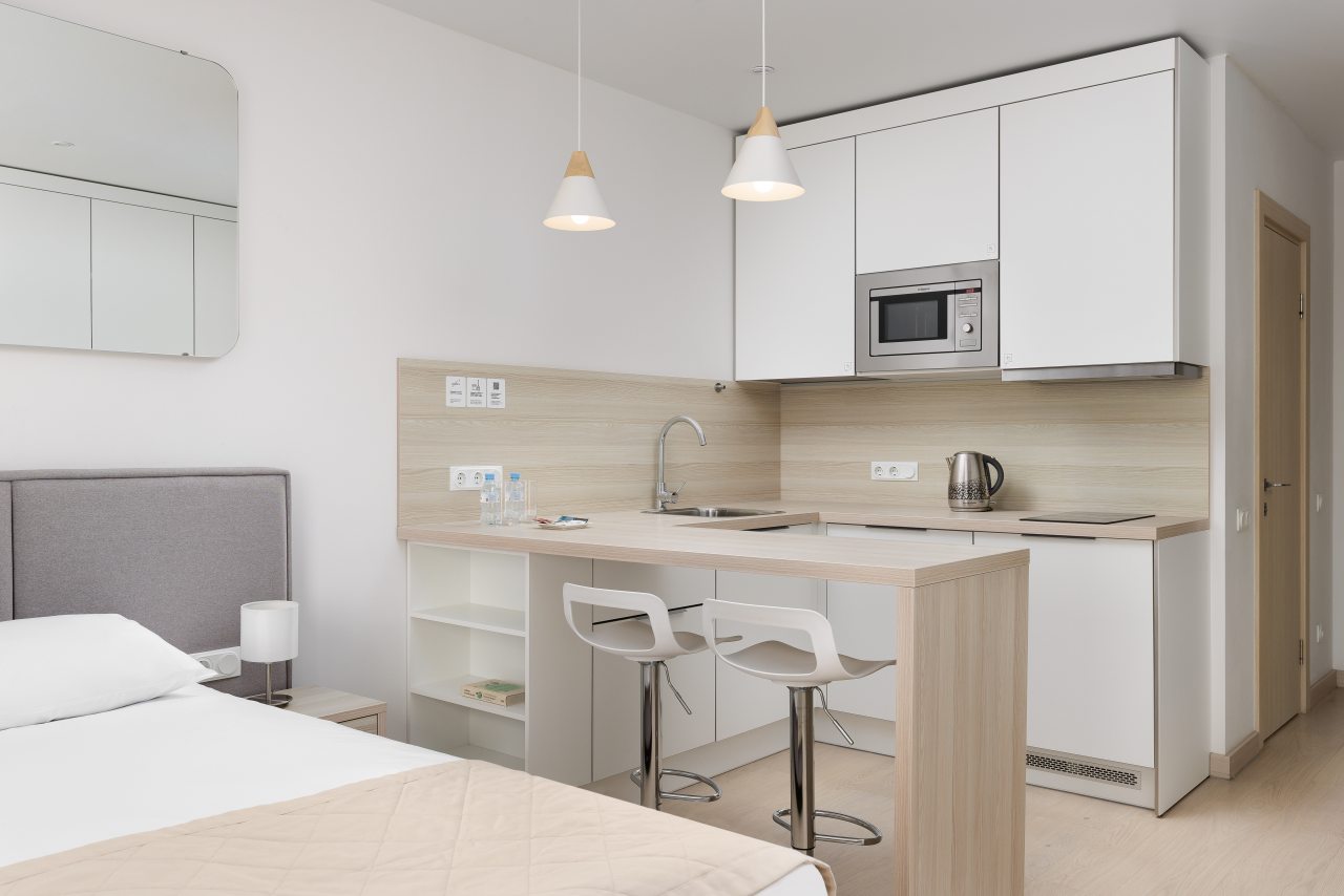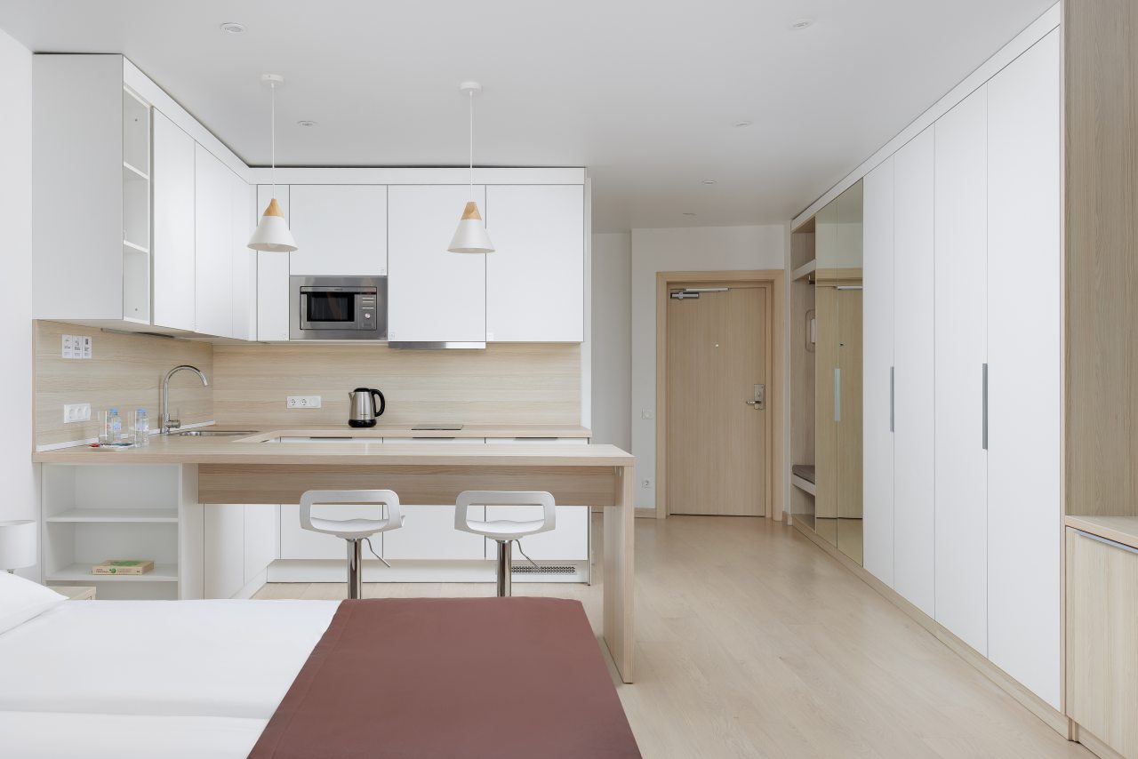 В планировку помещений входит собственная кухня с гарнитуром, электрической плитой, чайником, холодильником и микроволновой печью. На территории работает лобби-бар, в пешей доступности кафе и продуктовые магазины.