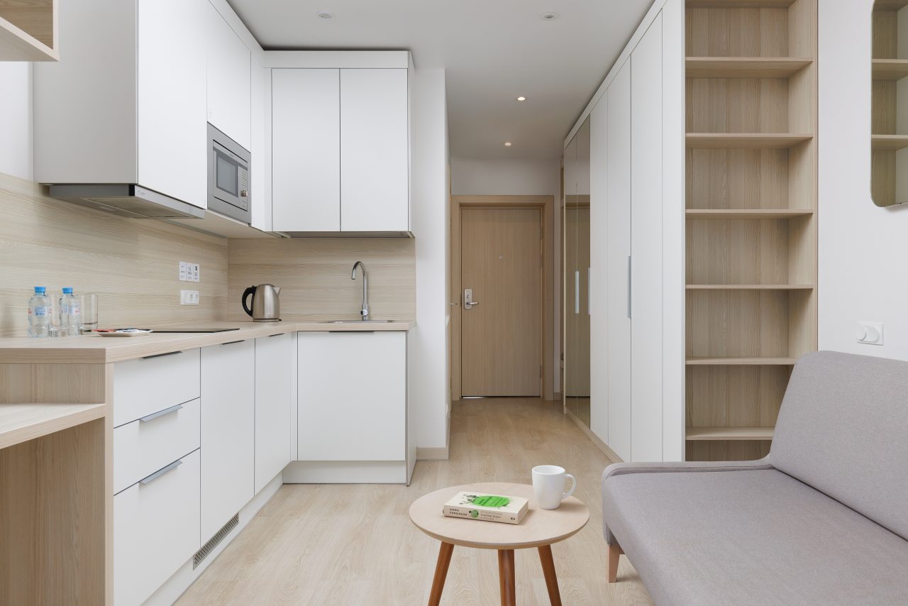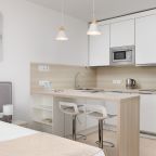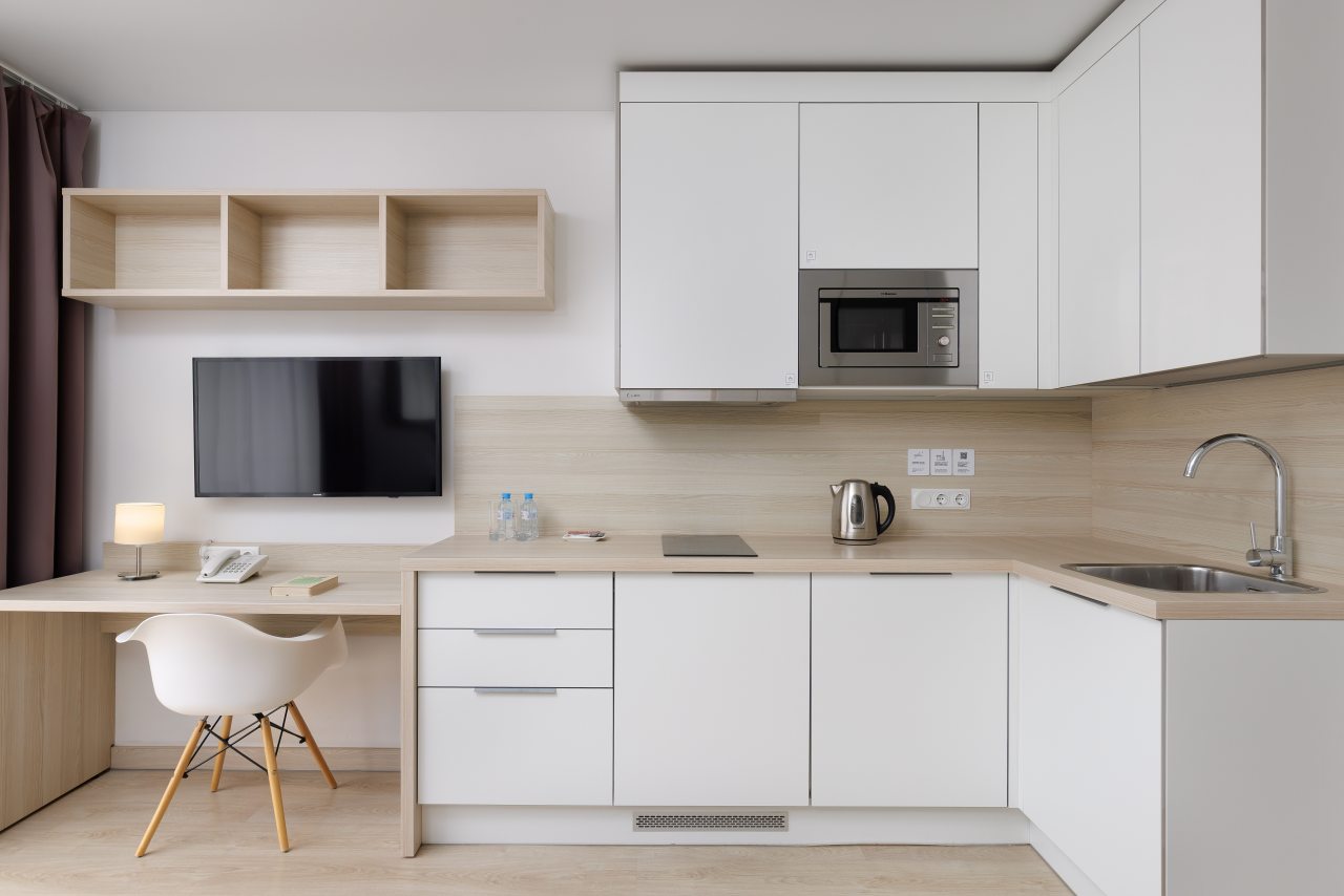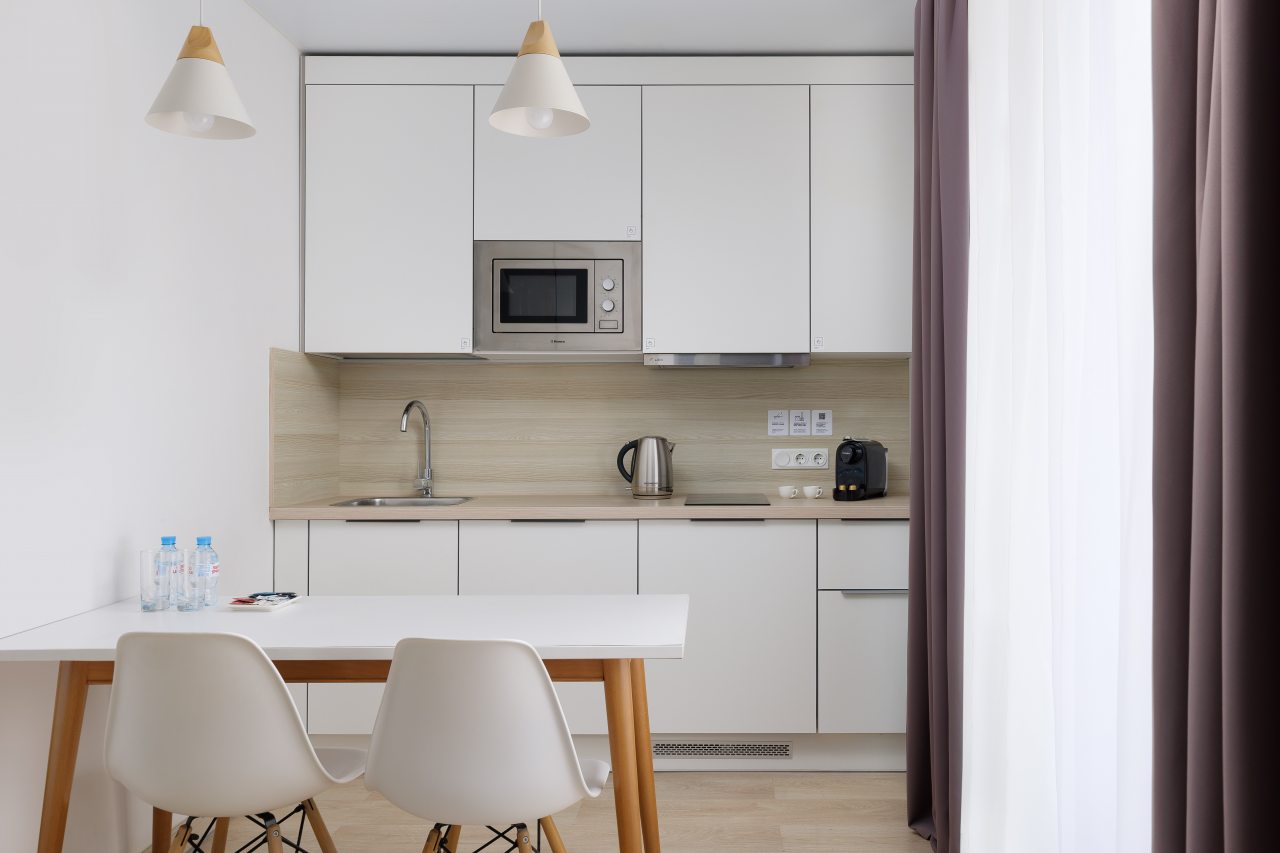 В планировку помещений входит собственная кухня с гарнитуром, электрической плитой, чайником, холодильником и микроволновой печью. На территории работает лобби-бар, в пешей доступности кафе и продуктовые магазины.