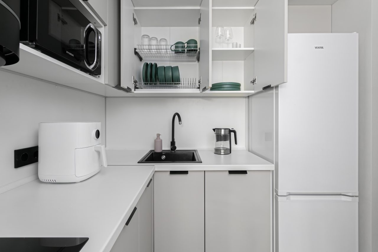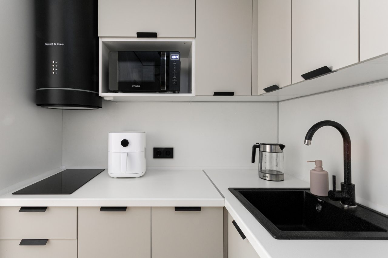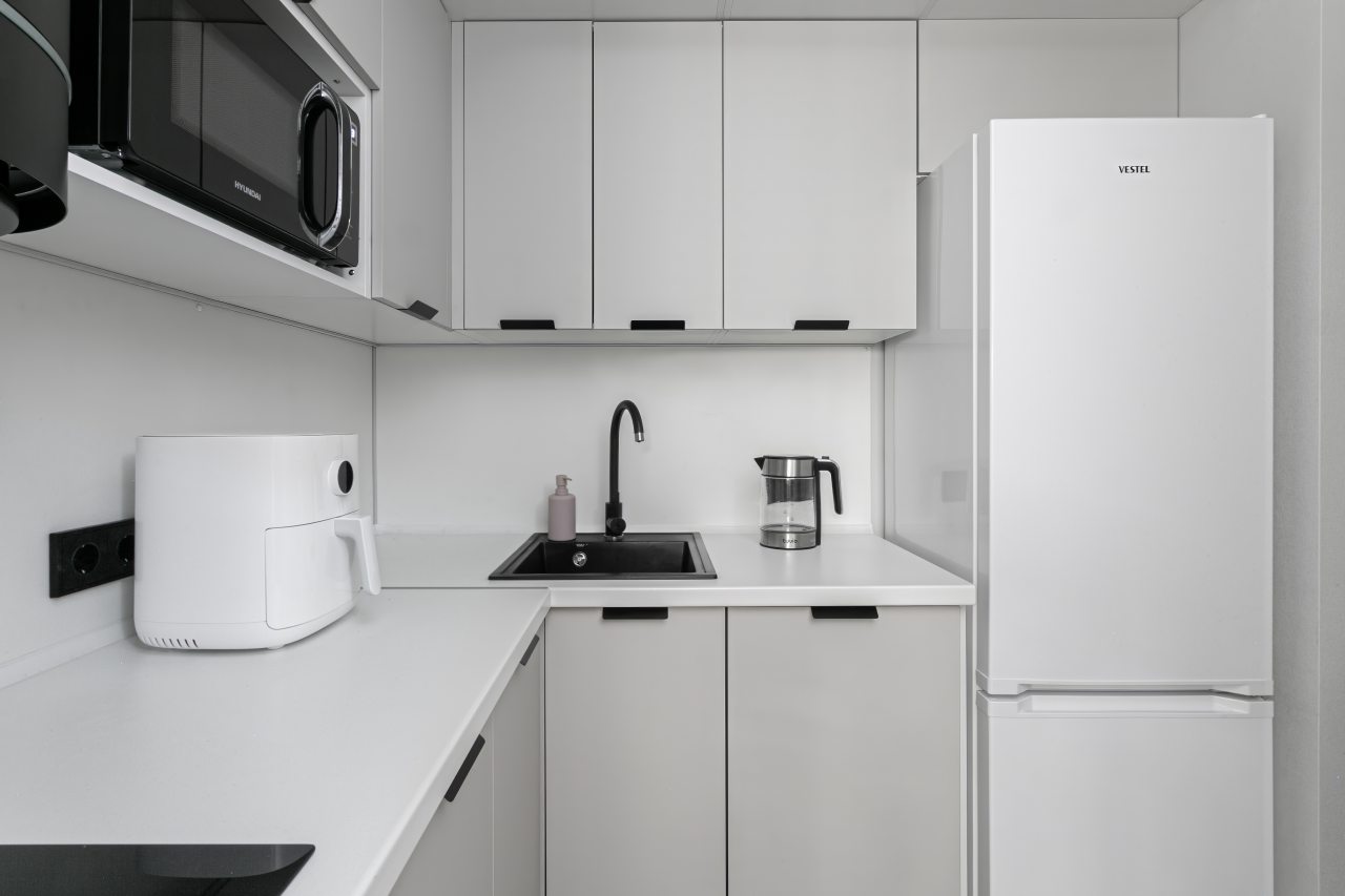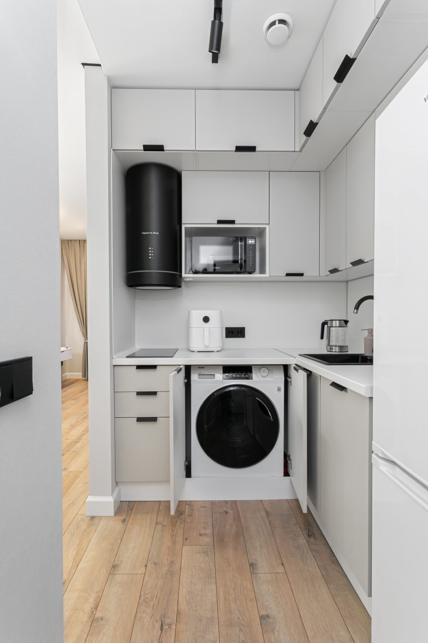 Кухонная зона укомплектована гарнитуром, электрочайником, холодильником, микроволновой печью, варочной панелью, стиральной машиной, вытяжкой.