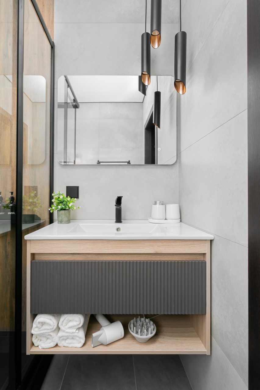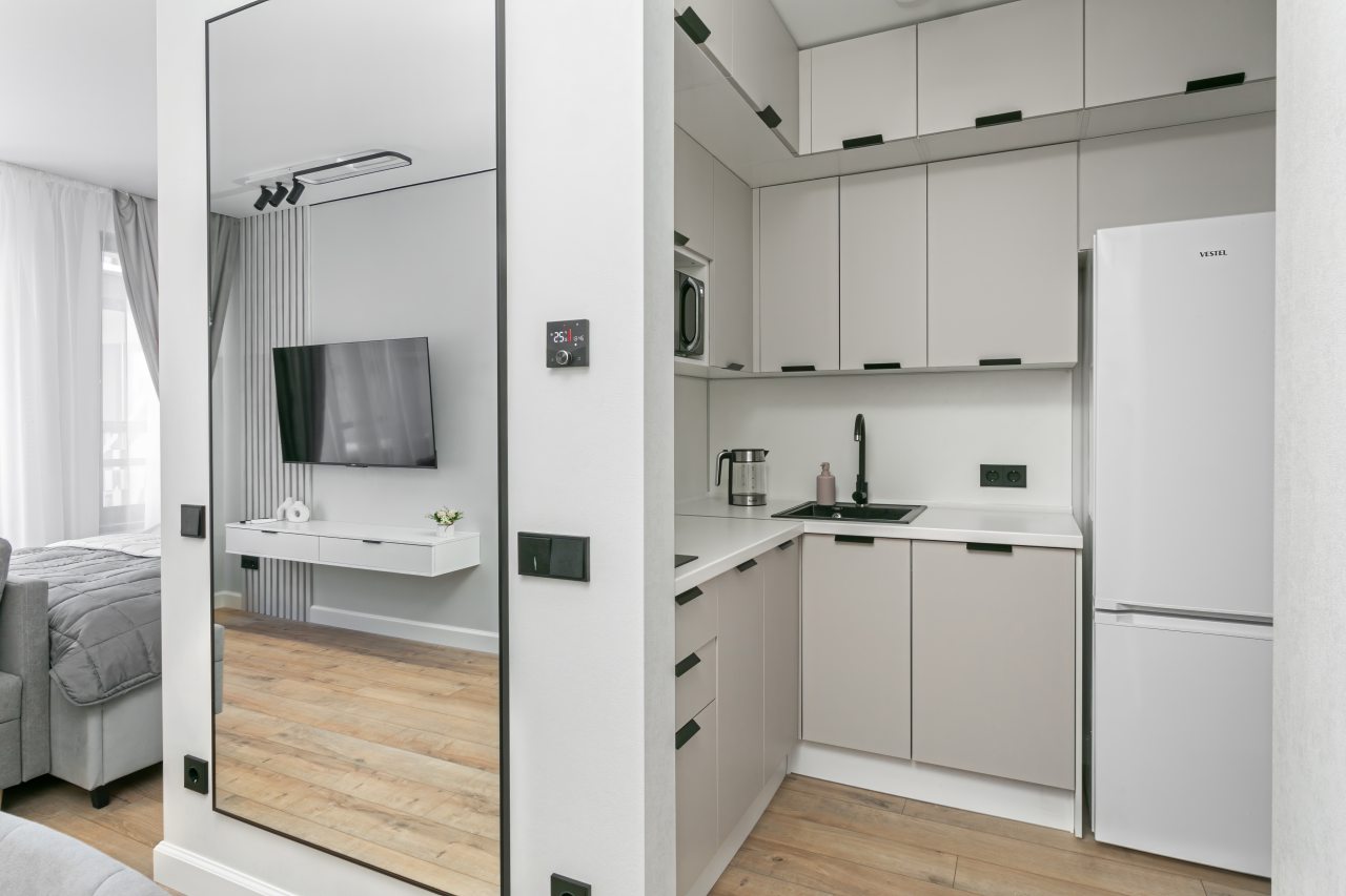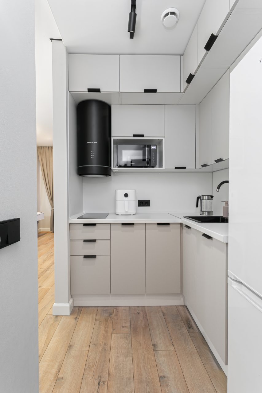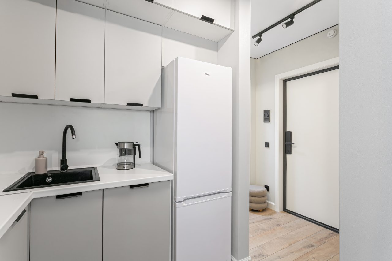 Кухонная зона укомплектована гарнитуром, электрочайником, холодильником, микроволновой печью, варочной панелью, стиральной машиной, вытяжкой.