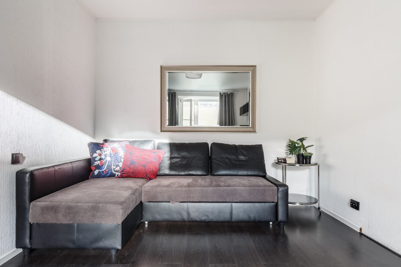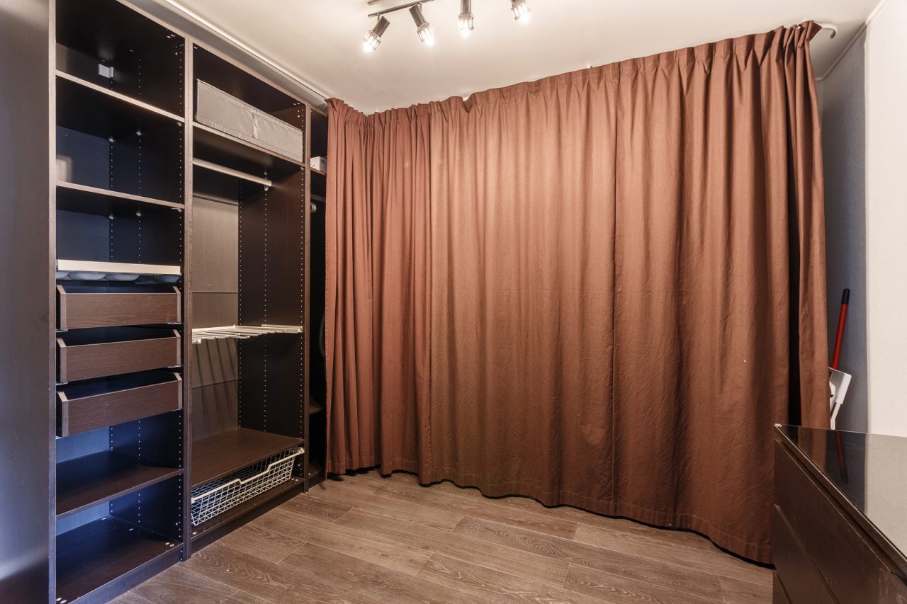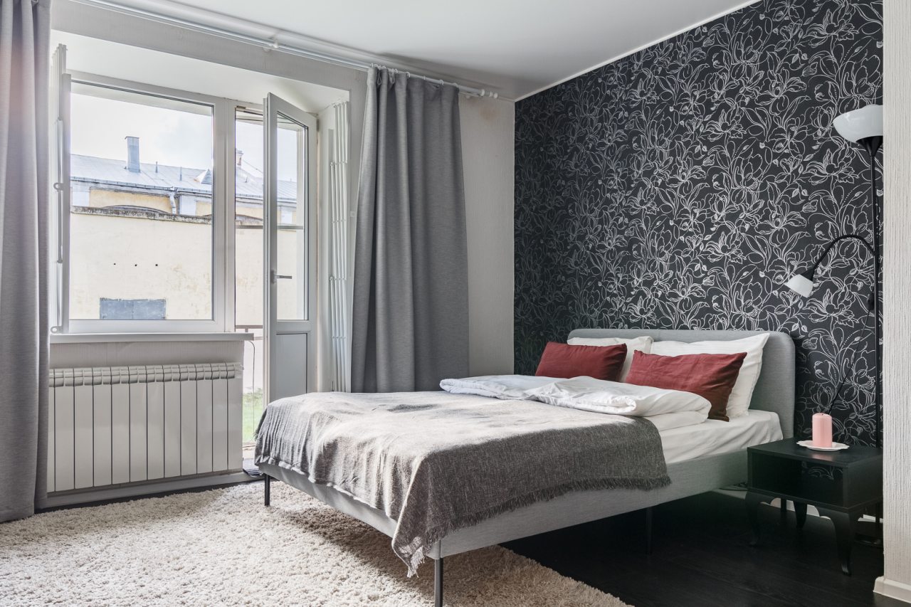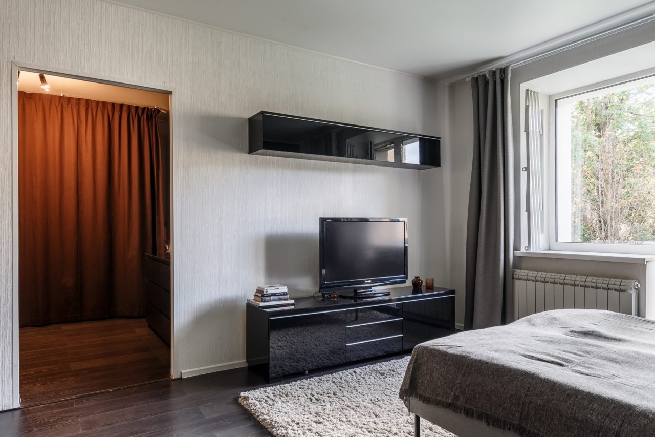Внутри — удобная кровать, мягкий диван, плотные шторы, балкон, телевизор, вместительная гардеробная, большая ванна, стиральная машина.