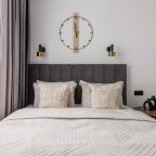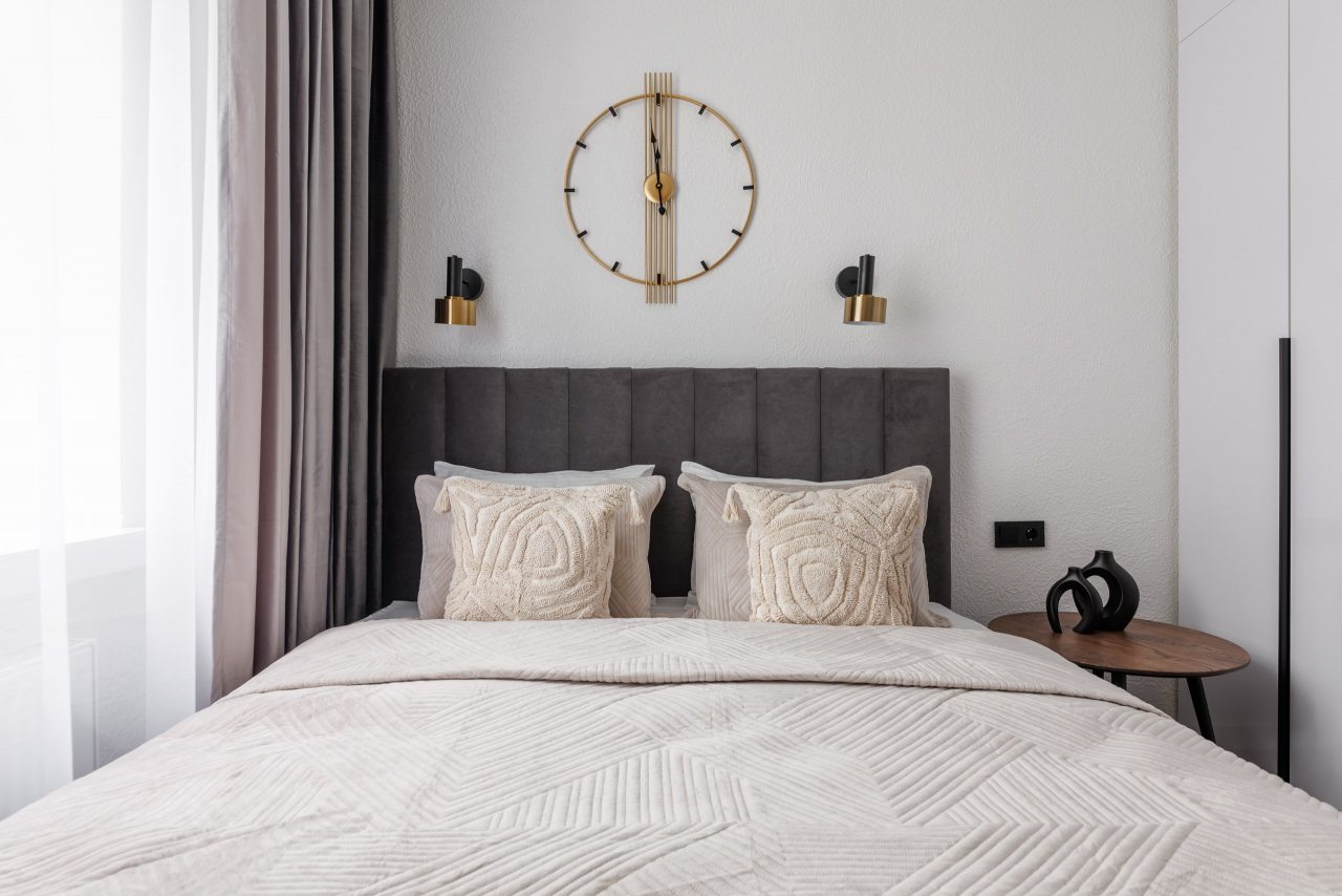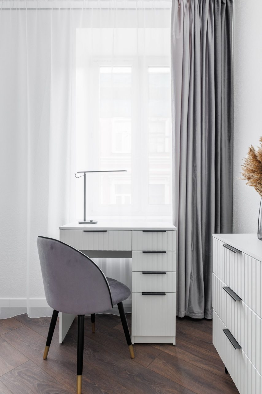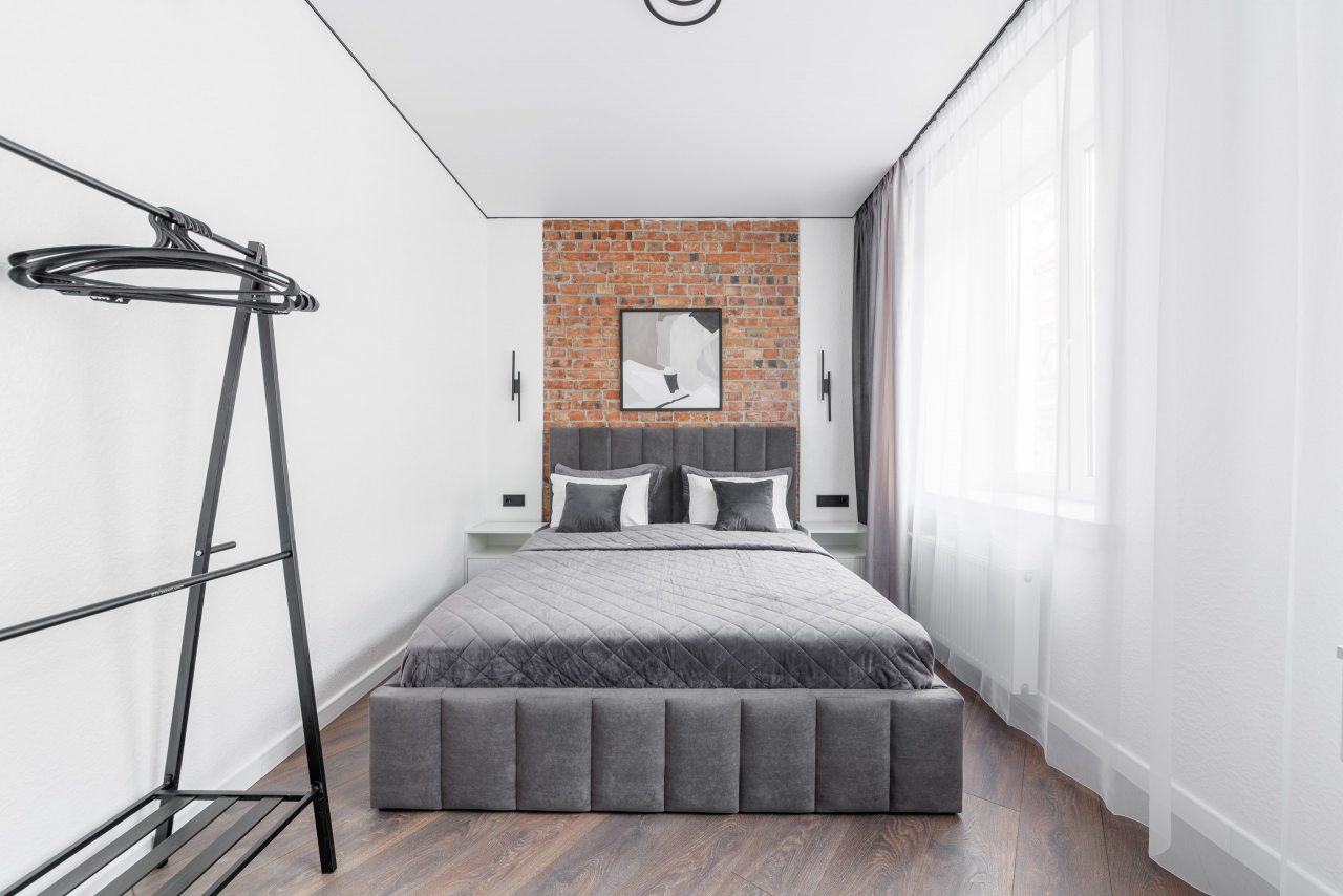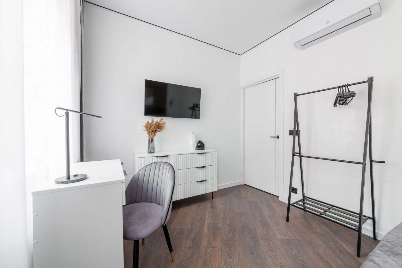 Внутри вы обнаружите две больших и удобных кровати с мягким изголовьем, прикроватные светильники, плотные шторы, телевизор, письменный стол, вместительный шкаф, а также полноценную ванну, стиральную машину и другую необходимую сантехнику.