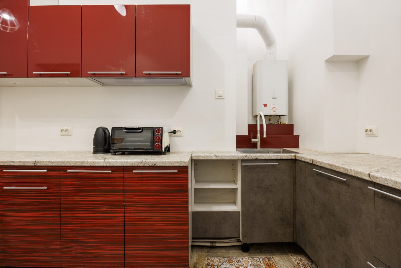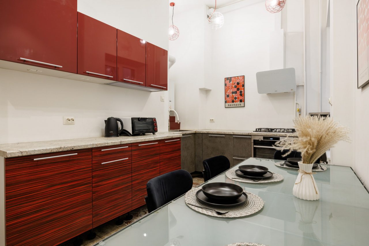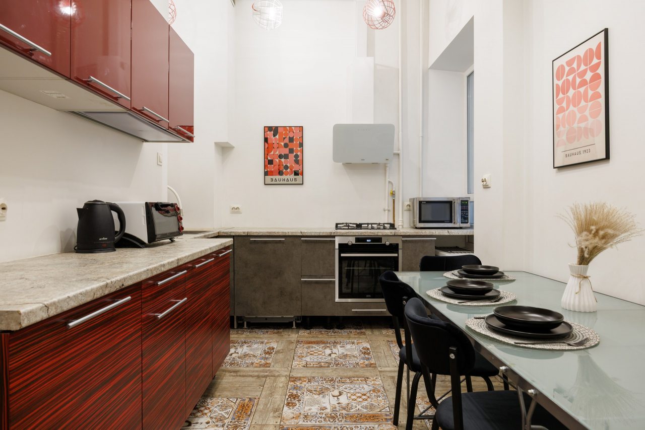 Зона кухни укомплектована всем необходимым для приготовления любимых напитков и блюд, включая плиту, духовой шкаф, вытяжку, чайник.