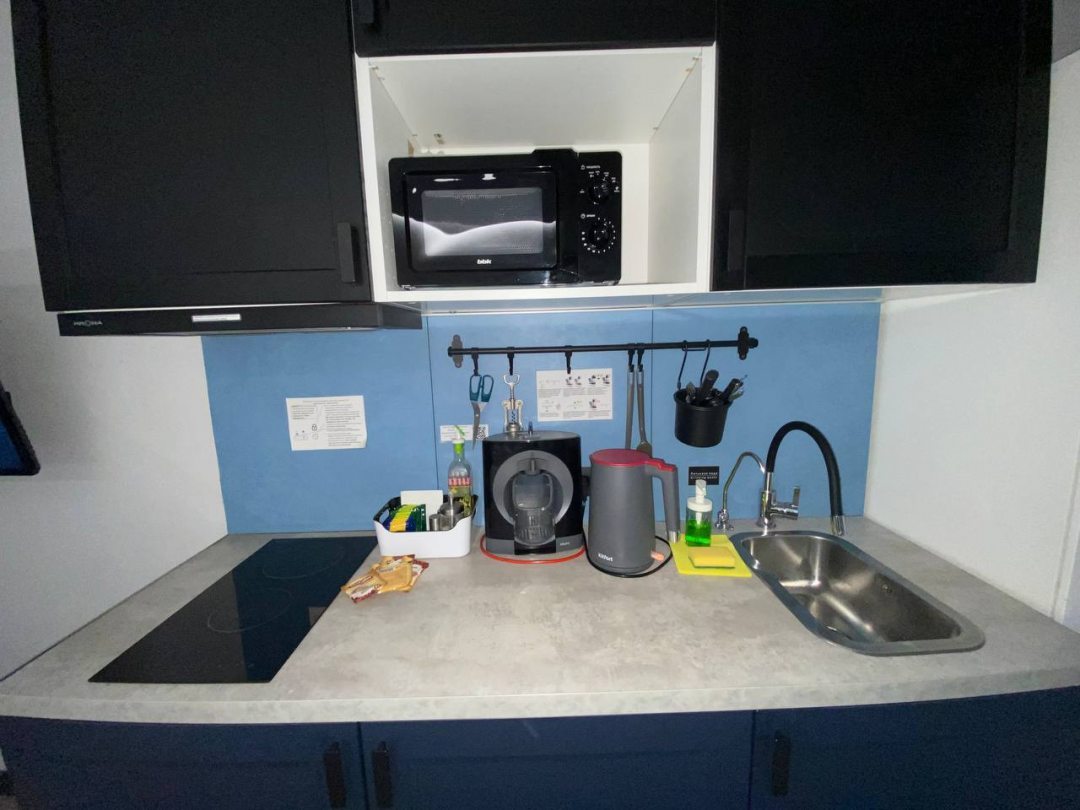 Кухонная зона оснащена современной техникой, с помощью которой легко готовить себе полноценные блюда. Из техники: электрический чайник, плита, холодильник, микроволновая печь.