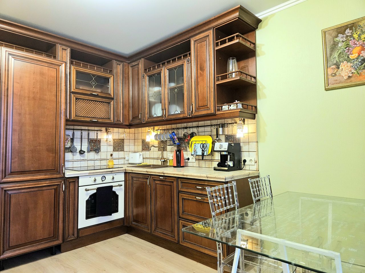 На кухне имеется посудомоечная машина, плита, духовой шкаф, кофемашина, тостер, электрический чайник, микроволновка, холодильник, а также столовые приборы и посуда.