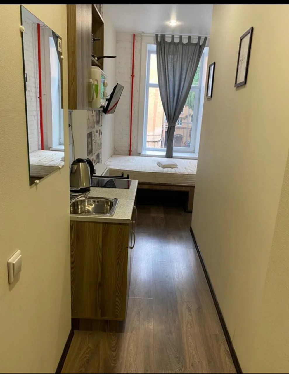 Небольшая студия с мини-кухней и санузлом. Есть все удобства для жизни. Чисто. Выдали свежее постельное белье и полотенца. Расположение просто идеальное в самом центре. Явных минусов не встретила.