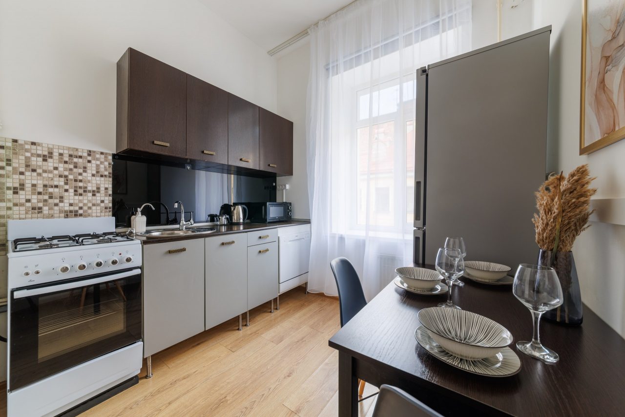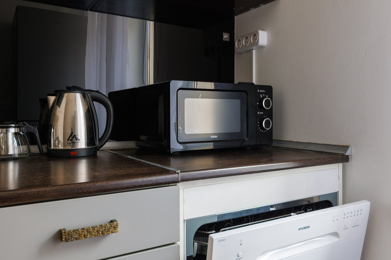Современная кухня, оснащенная газовой плитой, микроволновой печью, электрочайником и посудомоечной машиной, гармонично сочетает функциональность и стиль, предлагая уютное пространство с обеденным столом и бокалами для вина, где каждая деталь, от кухонного гарнитура до вытяжки, создает атмосферу домашнего уюта.