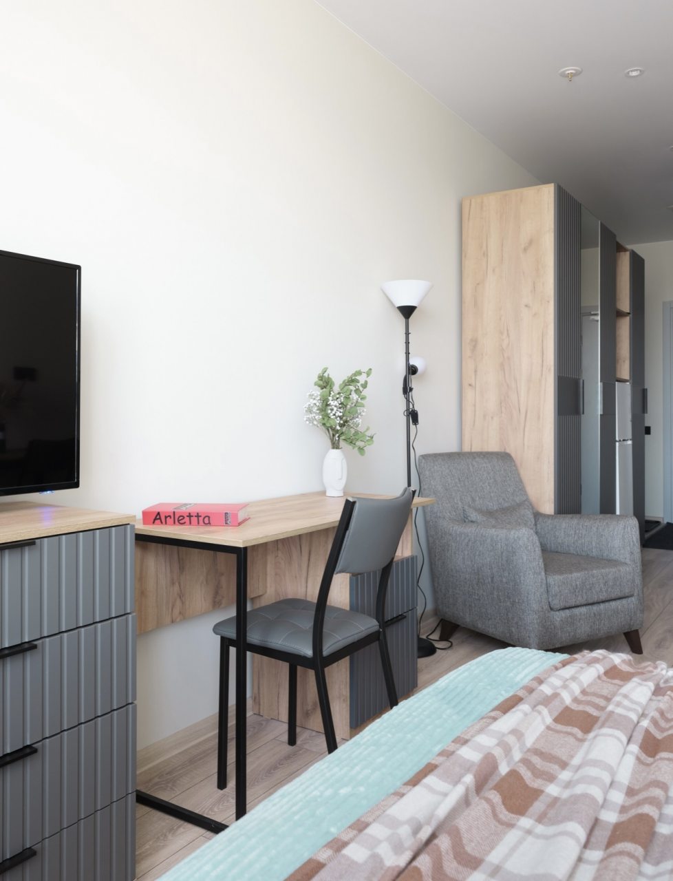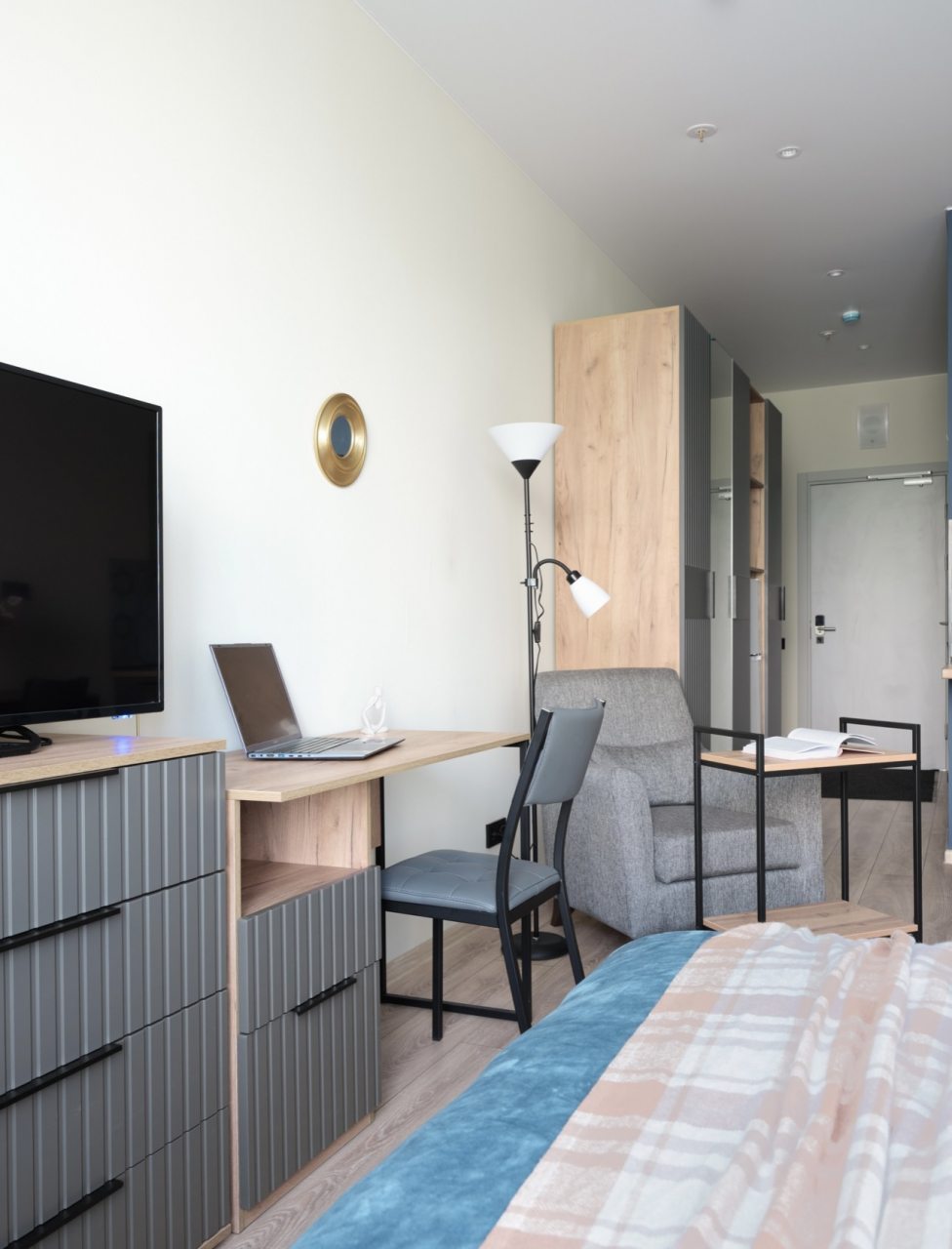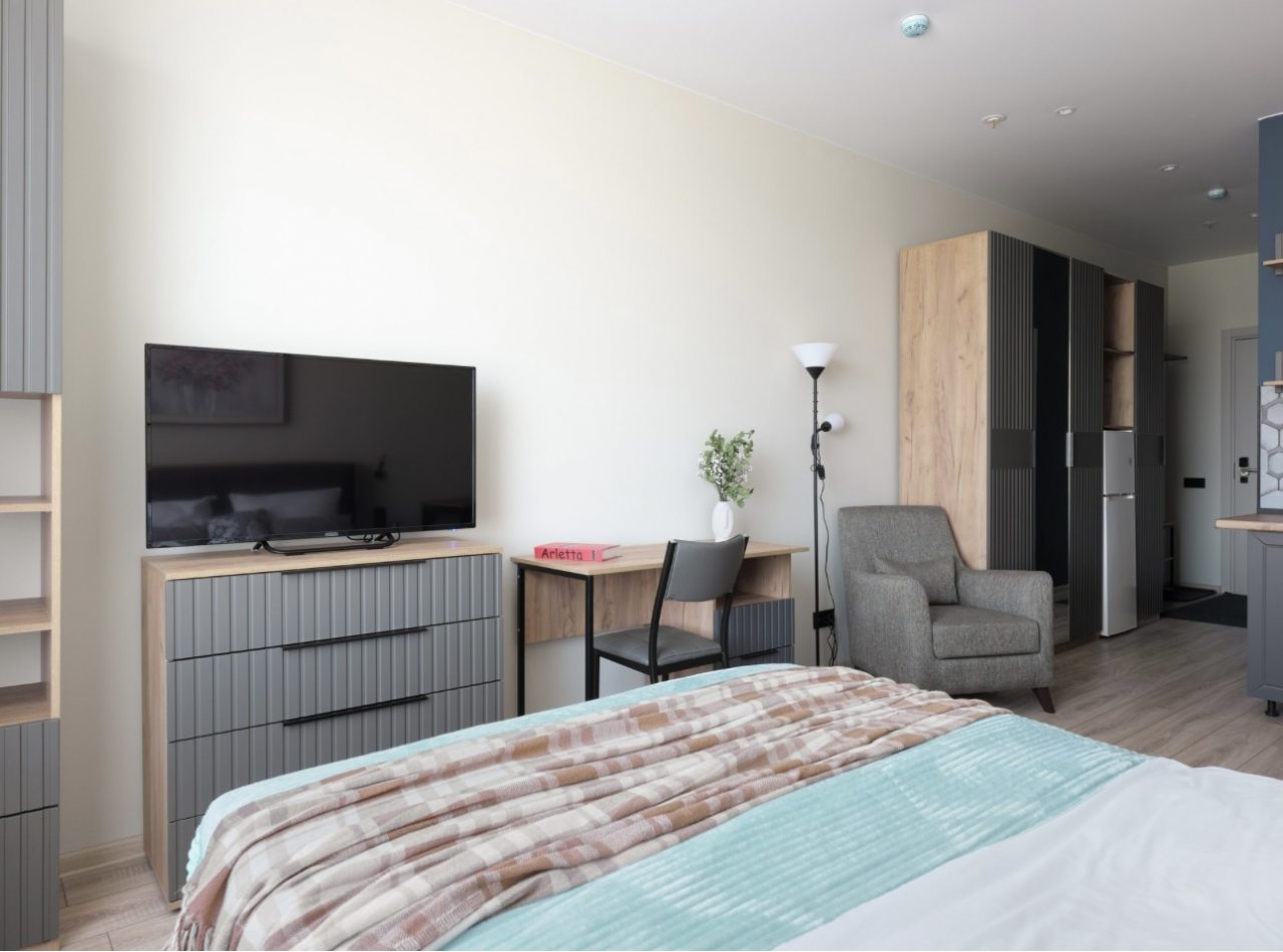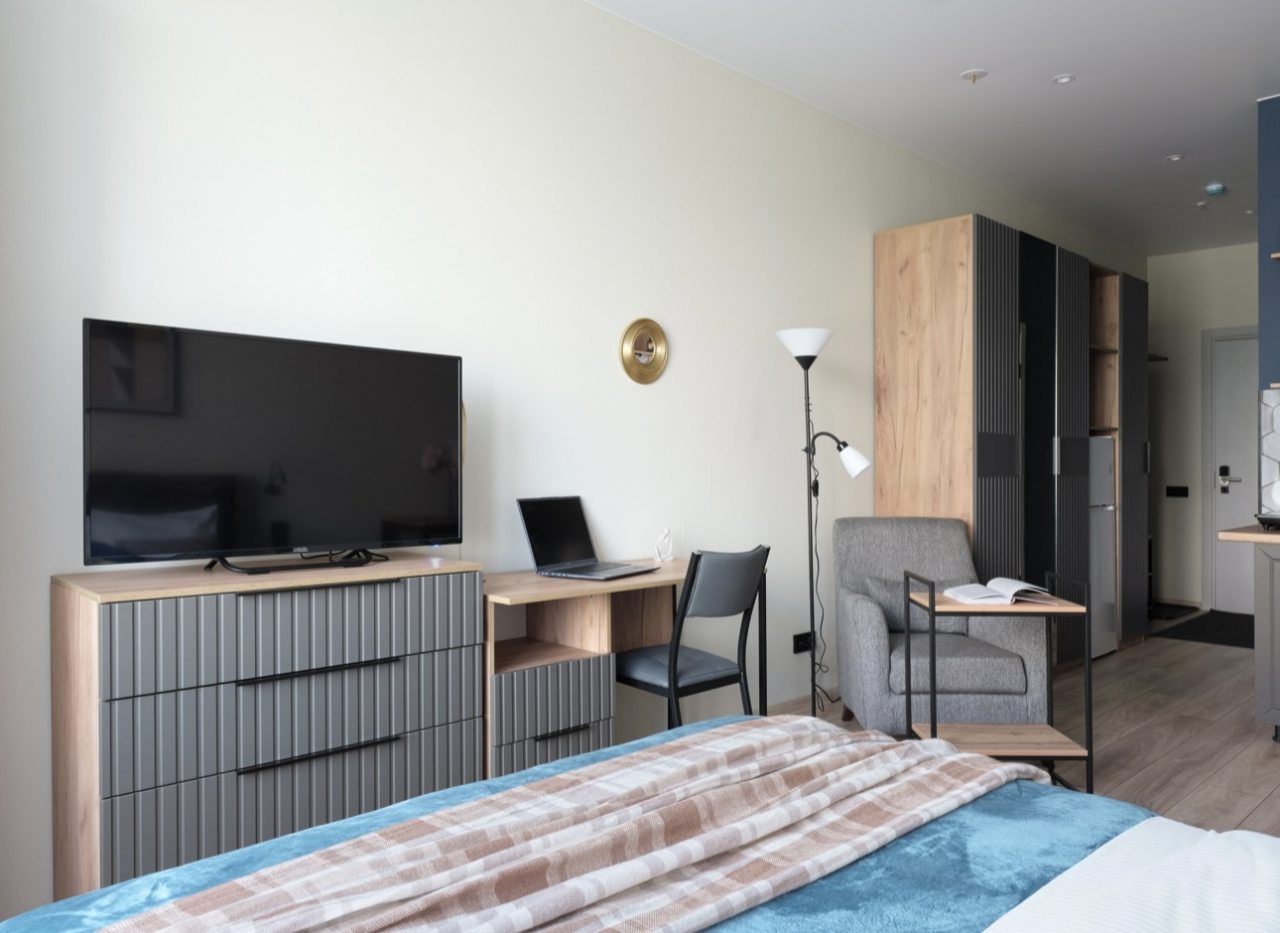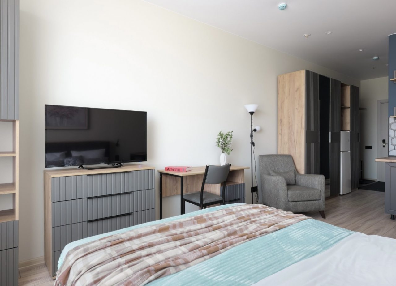 На площади в 25 квадратных метров есть всё для комфортного проживания и отдыха, а именно: двуспальная кровать с мягким изголовьем и настенными светильниками, вместительный шкаф и комод, ЖК-телевизор и рабочий стол. В ванной комнате продумана каждая деталь, включая фен, полотенца, стиральную машину и туалетно-косметические средства.