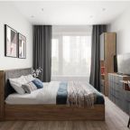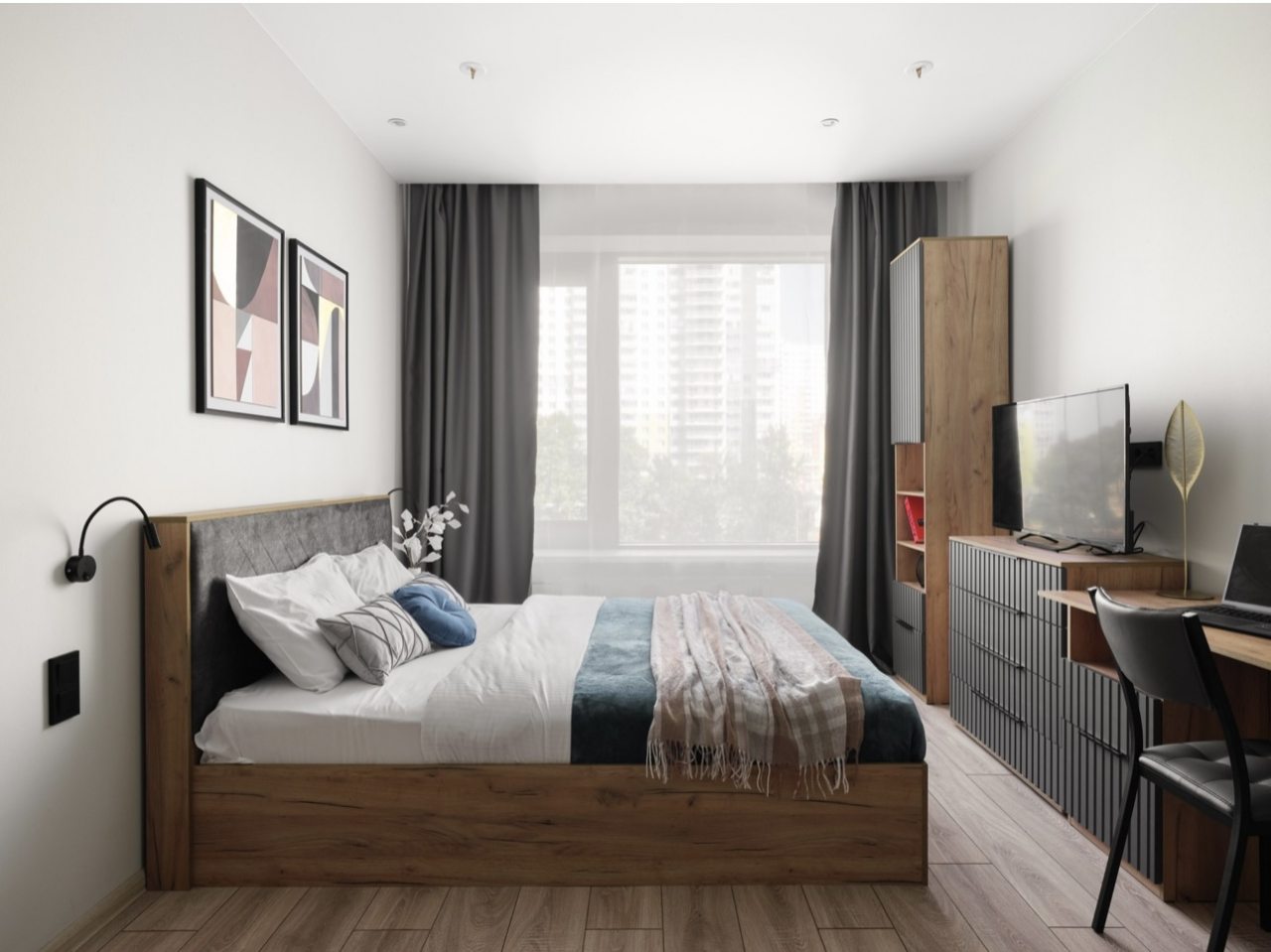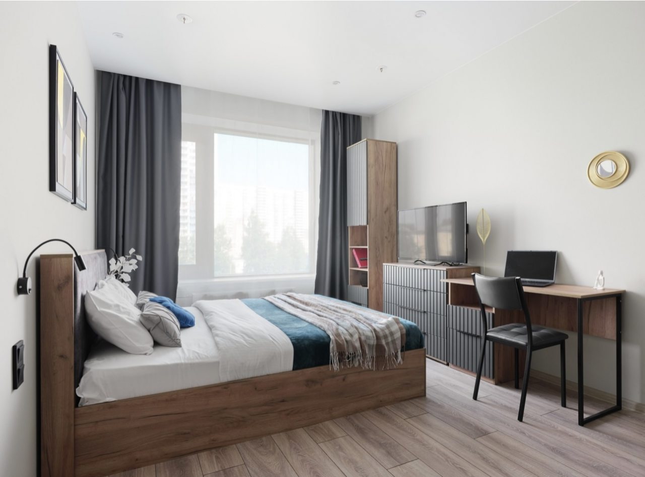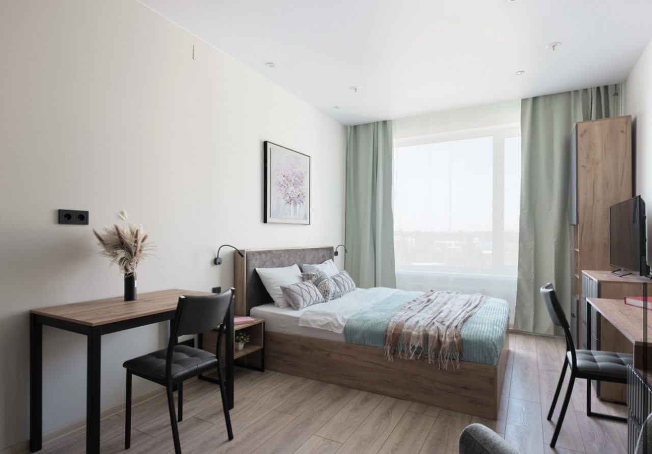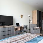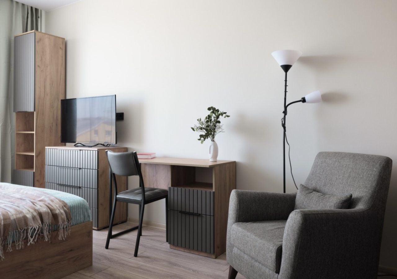 На площади в 25 квадратных метров есть всё для комфортного проживания и отдыха, а именно: двуспальная кровать с мягким изголовьем и настенными светильниками, вместительный шкаф и комод, ЖК-телевизор и рабочий стол. В ванной комнате продумана каждая деталь, включая фен, полотенца, стиральную машину и туалетно-косметические средства.