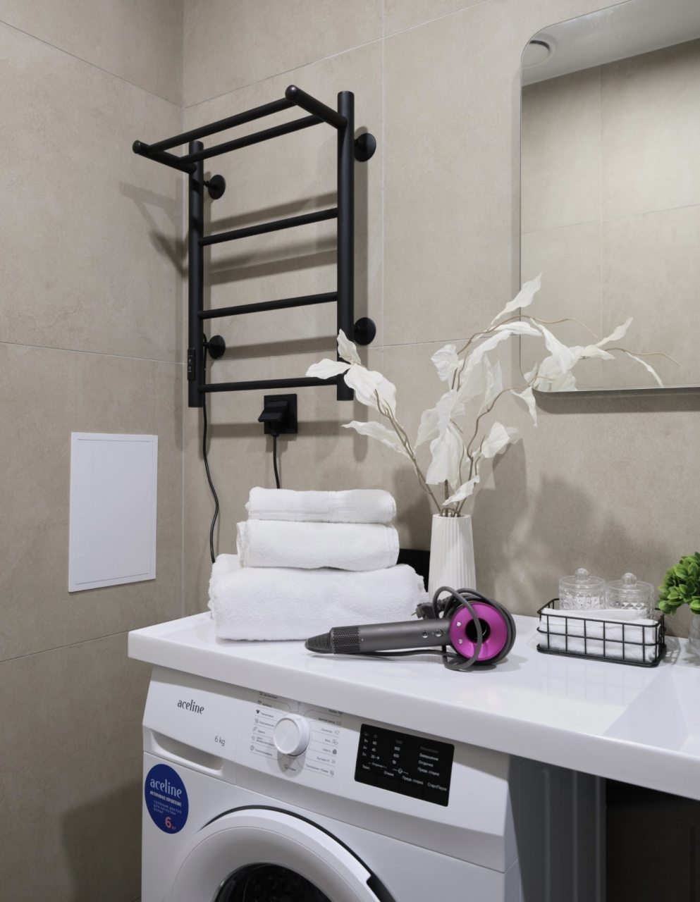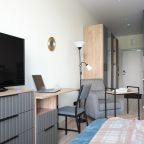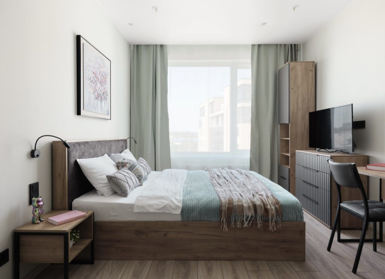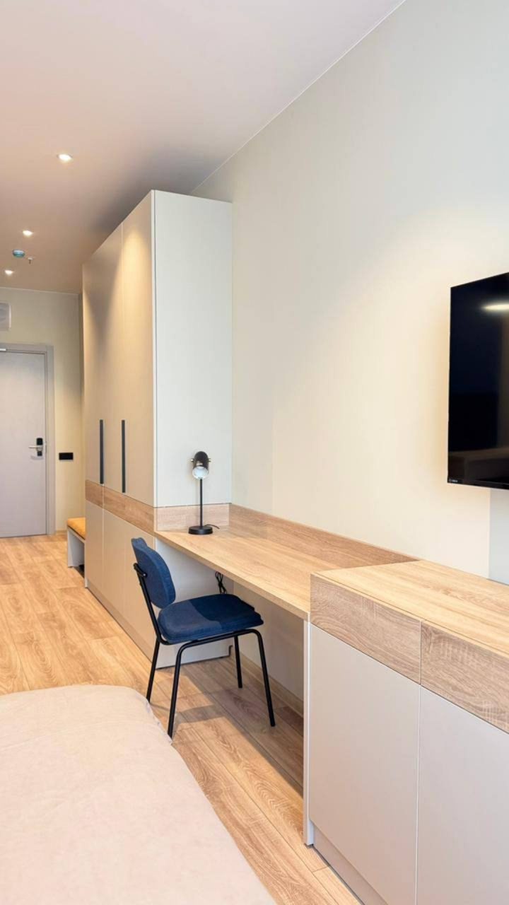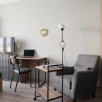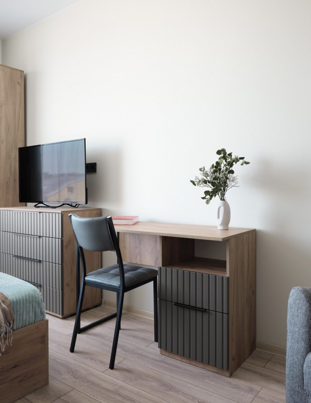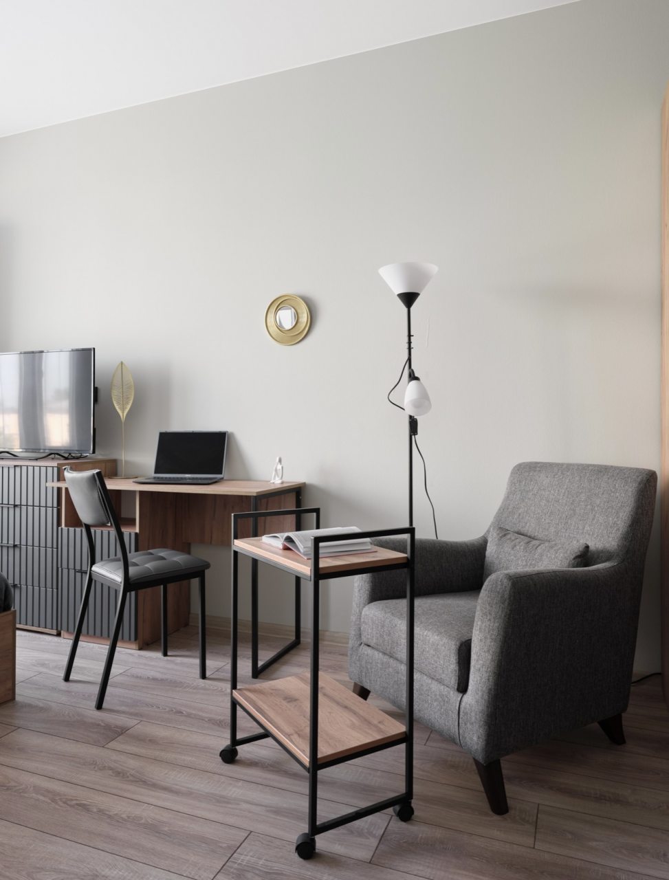 На площади в 25 квадратных метров есть всё для комфортного проживания и отдыха, а именно: двуспальная кровать с мягким изголовьем и настенными светильниками, вместительный шкаф и комод, ЖК-телевизор и рабочий стол. В ванной комнате продумана каждая деталь, включая фен, полотенца, стиральную машину и туалетно-косметические средства.