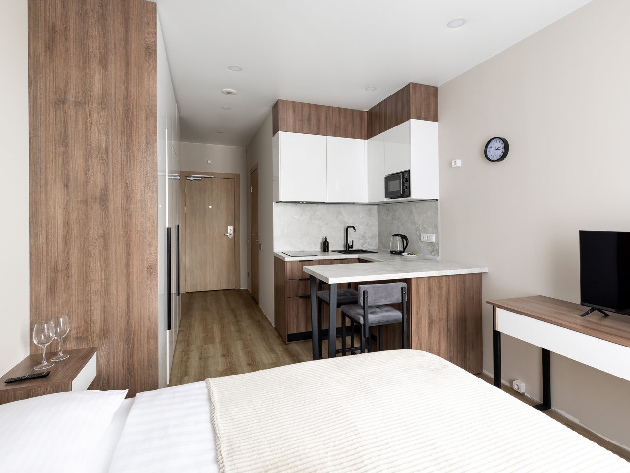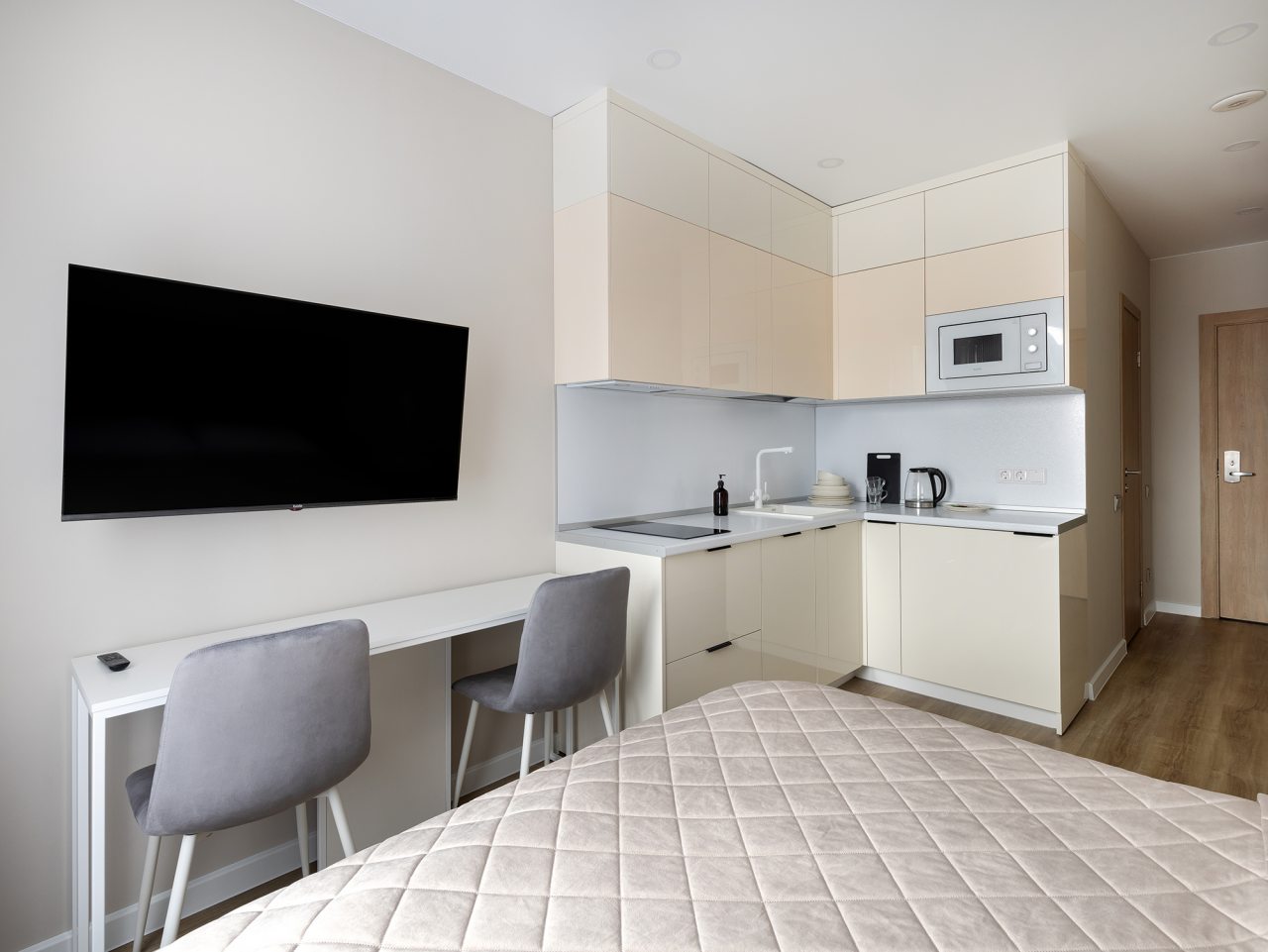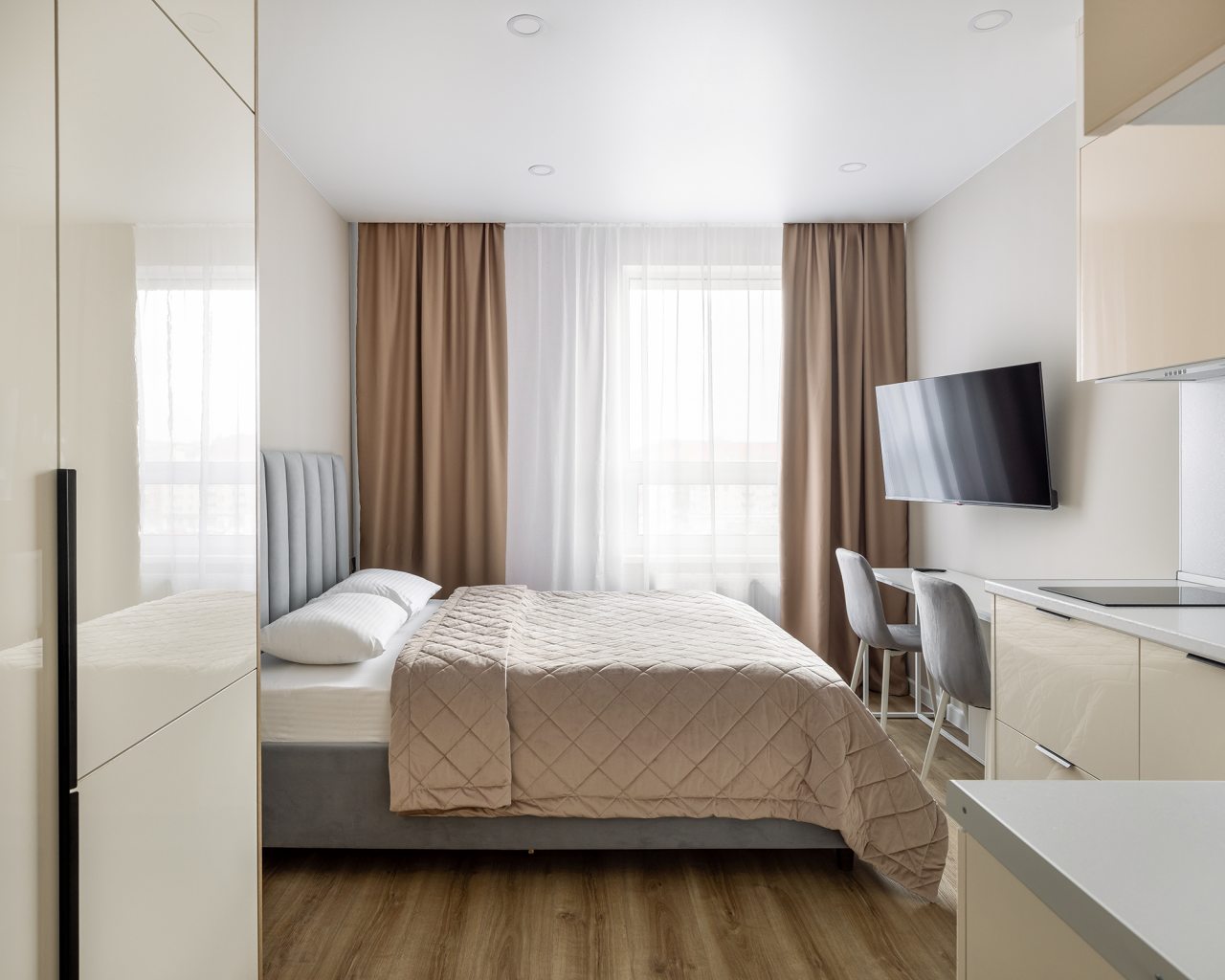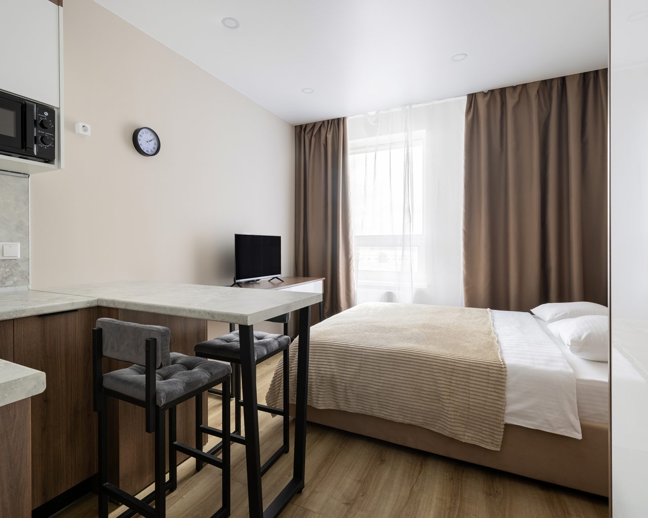 К проживанию предлагаются три квартиры-студио и одна однокомнатная квартира, вам нужно лишь выбрать тот вариант, который нравится больше. Вне зависимости от решения, каждая оборудована современной мебелью и техникой и вмещает в себя: удобные спальные места с комплектом свежего белья, шкаф, утюг, телевизор. Быть в новостной ленте поможет скоростной интернет. Санузел оснащён сантехникой, феном, набором полотенец, косметическими средствами.