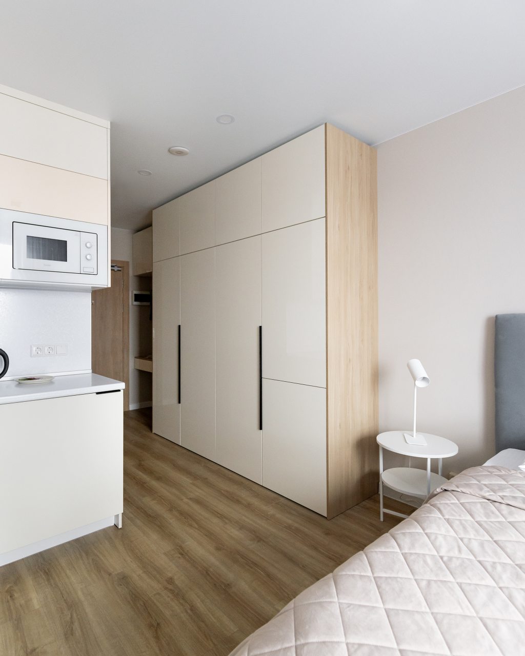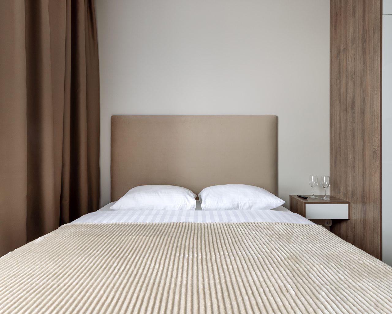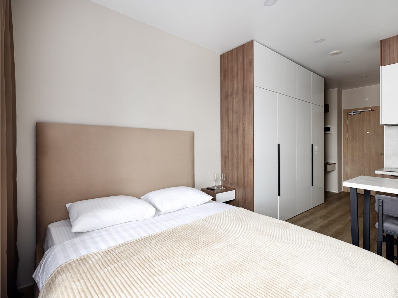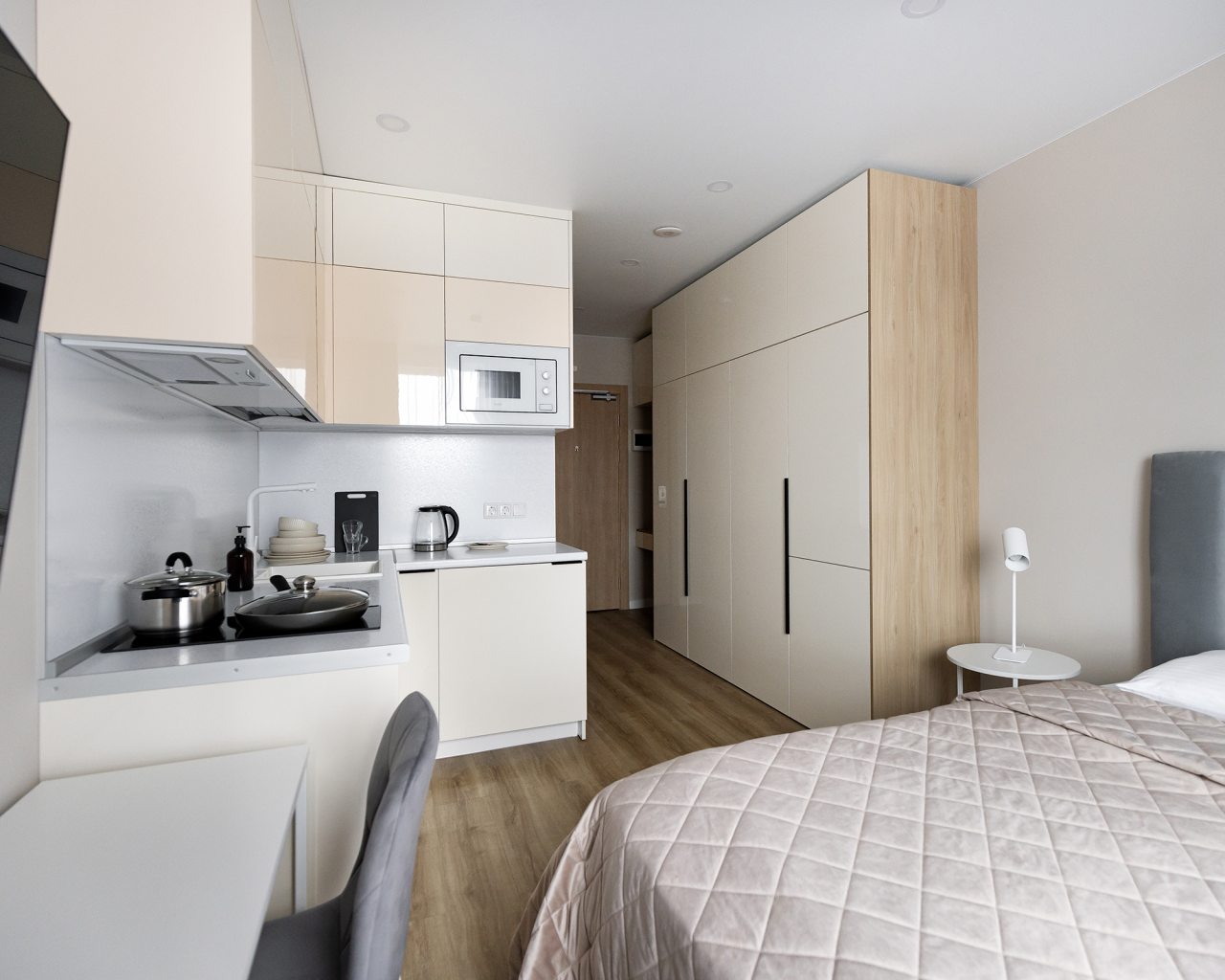 К проживанию предлагаются три квартиры-студио и одна однокомнатная квартира, вам нужно лишь выбрать тот вариант, который нравится больше. Вне зависимости от решения, каждая оборудована современной мебелью и техникой и вмещает в себя: удобные спальные места с комплектом свежего белья, шкаф, утюг, телевизор. Быть в новостной ленте поможет скоростной интернет. Санузел оснащён сантехникой, феном, набором полотенец, косметическими средствами.
