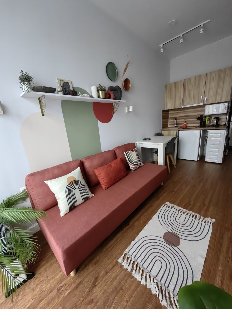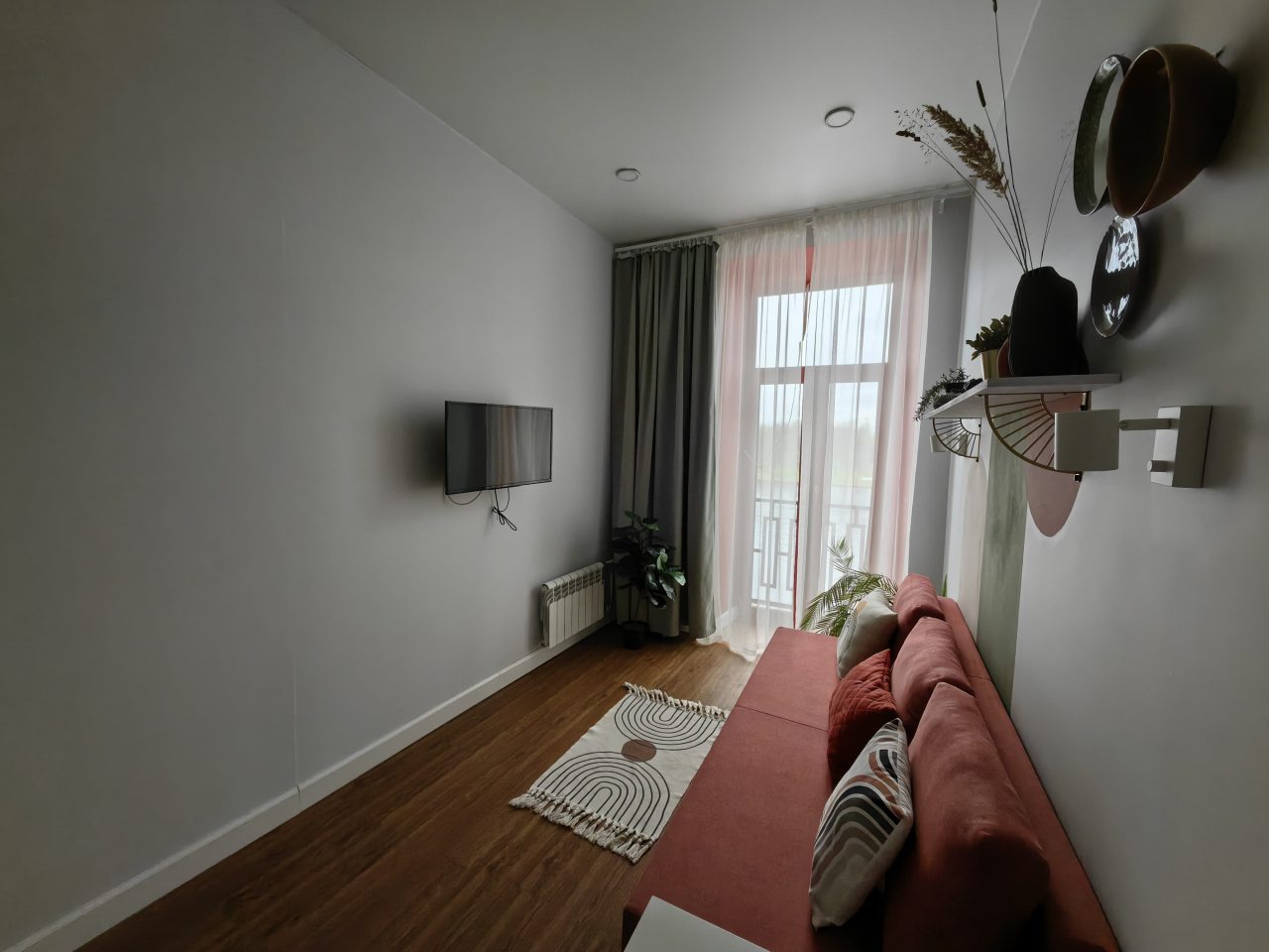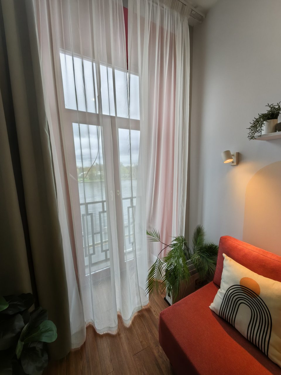 Для долгосрочного и краткосрочного проживания предлагаются уютные апартаменты, оснащенные удобными спальными местами, письменным столом, телевизором. Благодаря стильным элементам декора, таким, как цветы в горшках, затемненные шторы и зеркало, царит атмосфера уюта и спокойствия. Санузел оснащен душем и стиральной машиной. Из панорамных окон открывается красивый вид на побережье и реку.