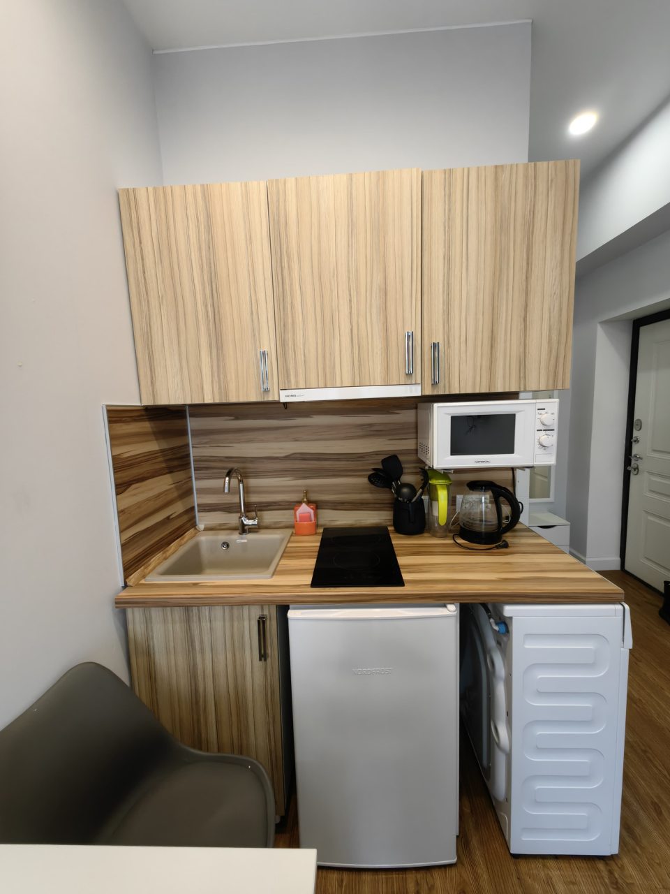 На кухне, где гости могут готовить свои любимые блюда, установлена бытовая техника: варочная панель, микроволновая печь, плита, электрический чайник. Недалеко от объекта работает ресторан аутентичной китайской кухни — «Шикэ».