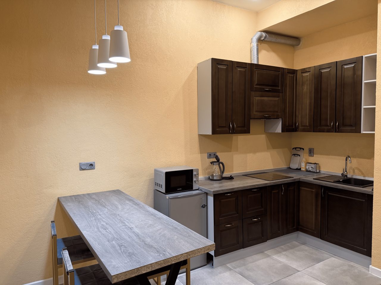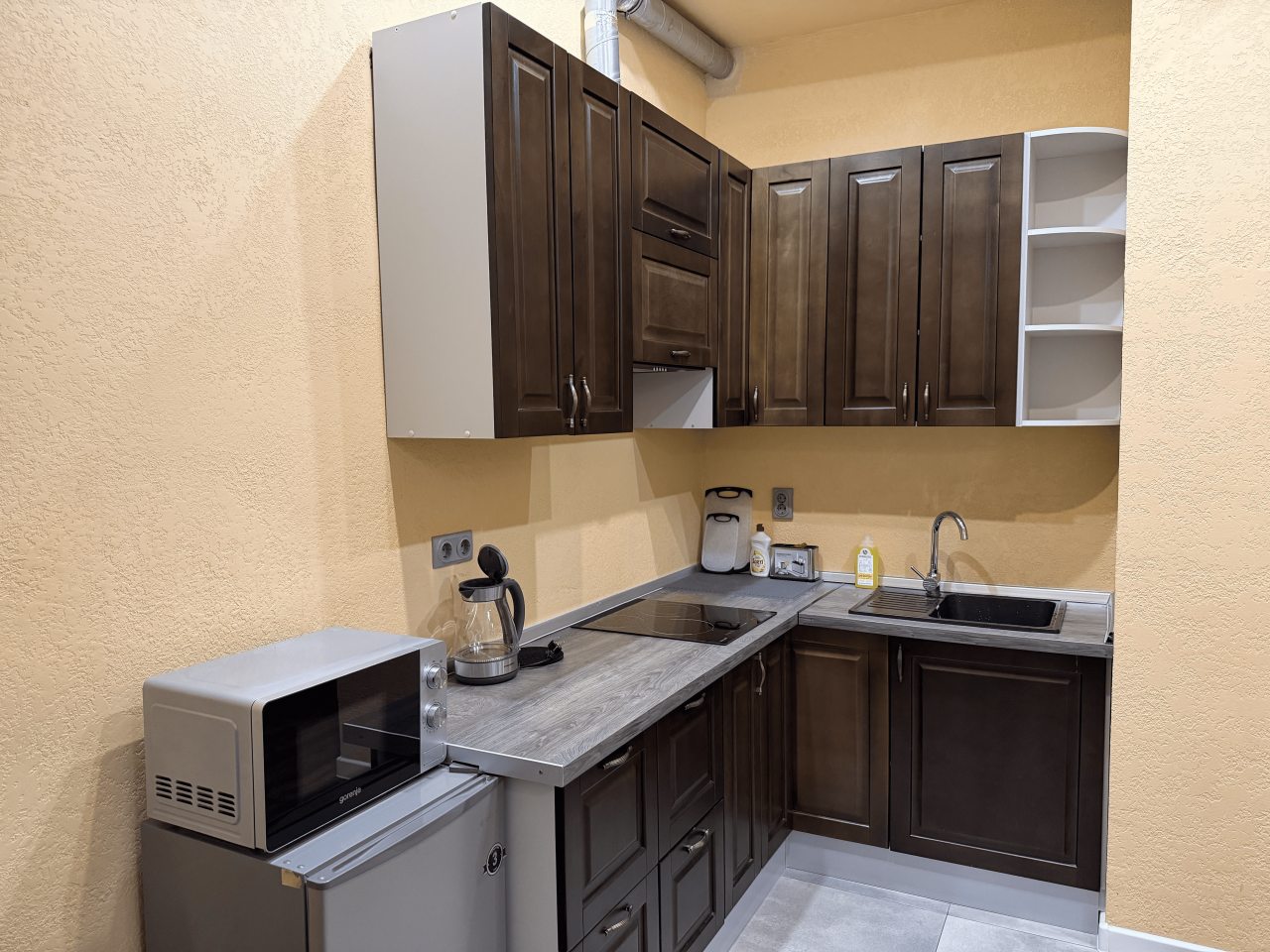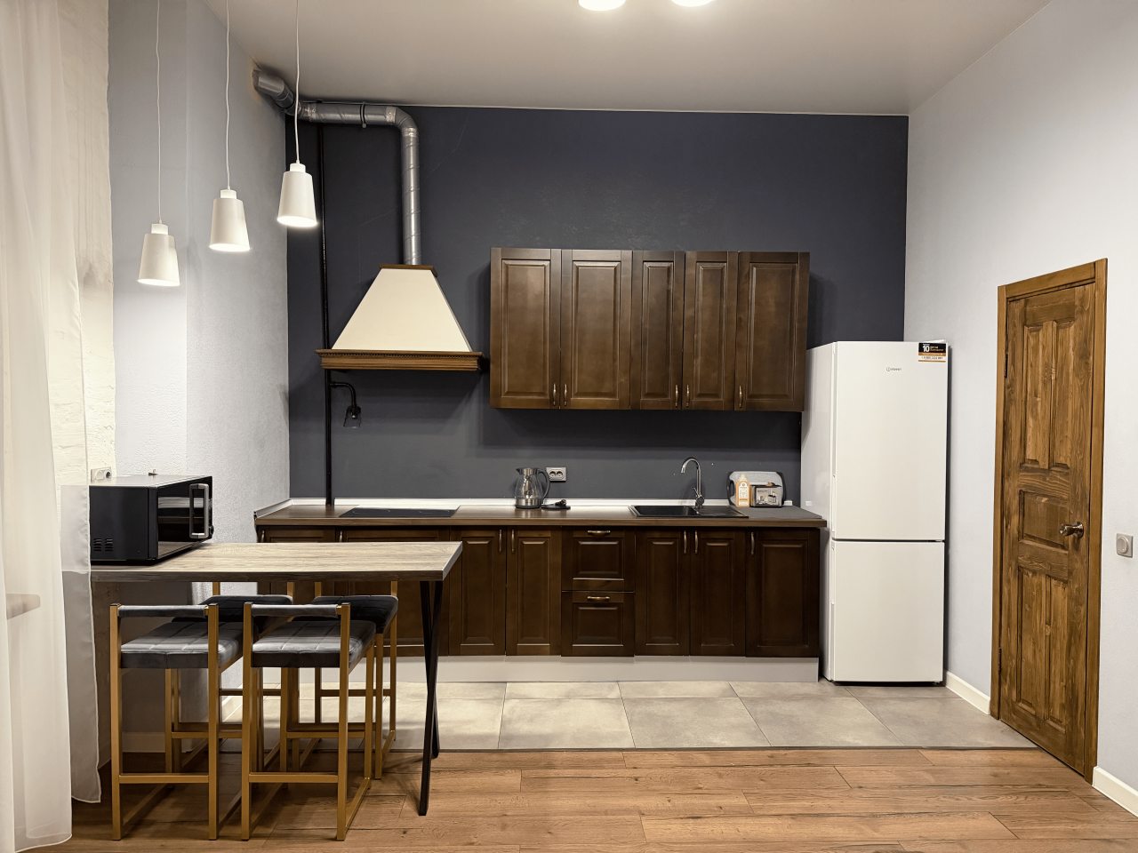 Готовить домашние блюда можно на кухне, которая оснащена плитой, вытяжкой, холодильником и микроволновой печью.