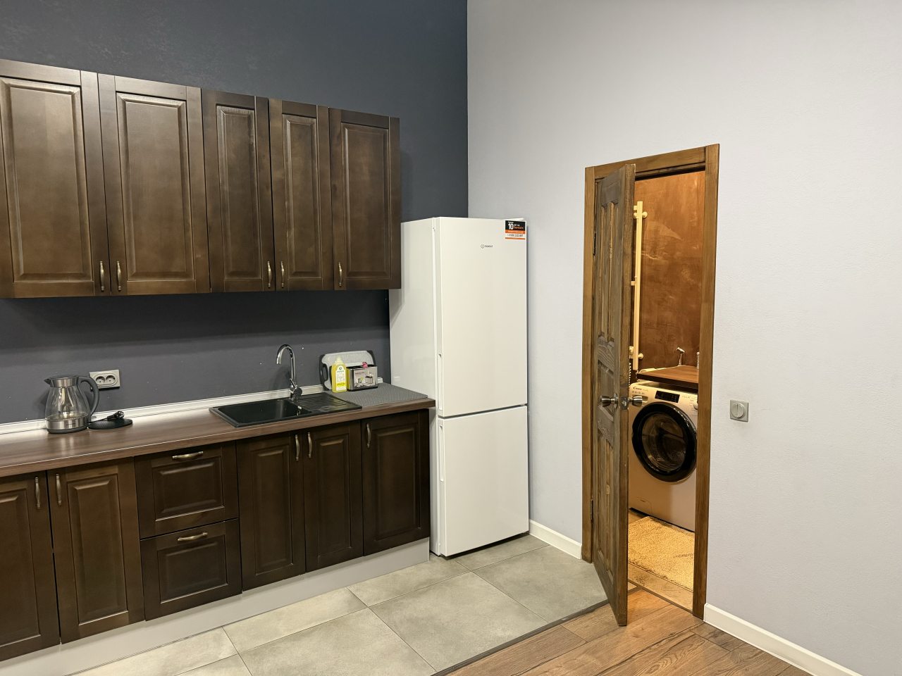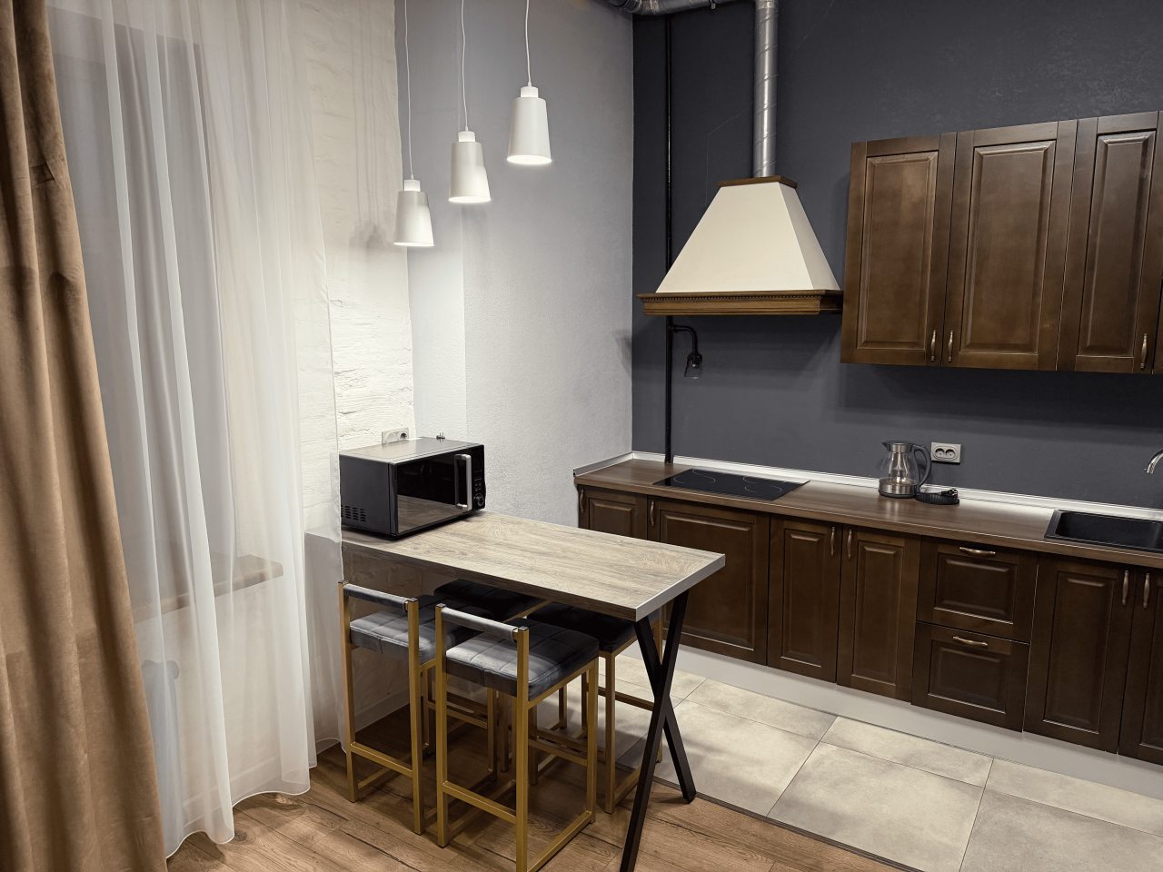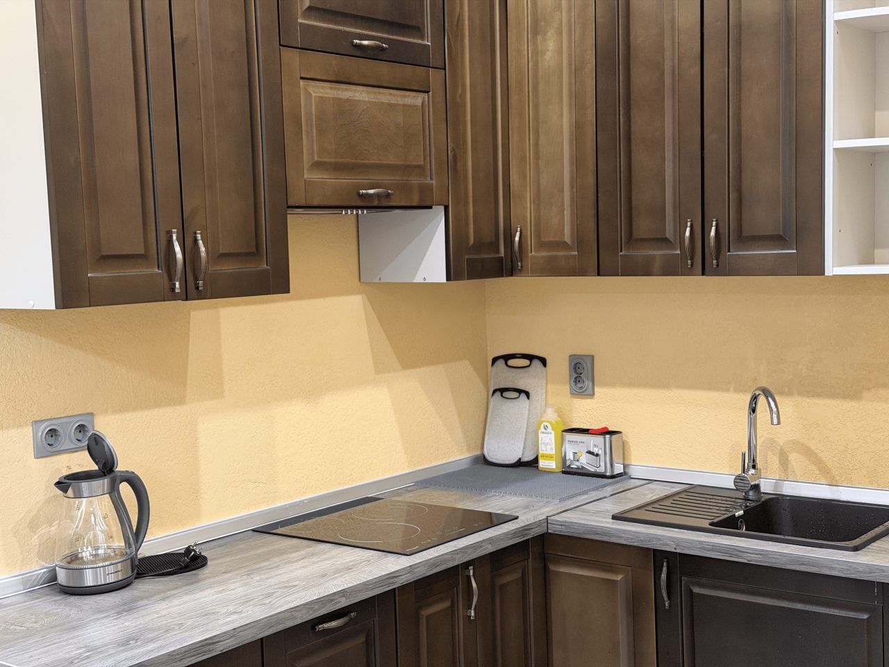 Готовить домашние блюда можно на кухне, которая оснащена плитой, вытяжкой, холодильником и микроволновой печью.