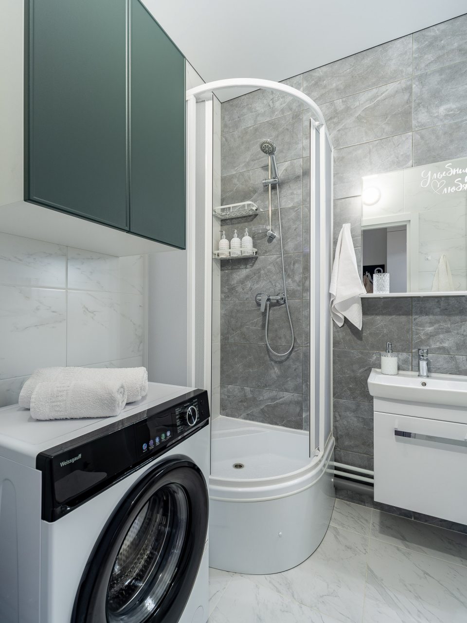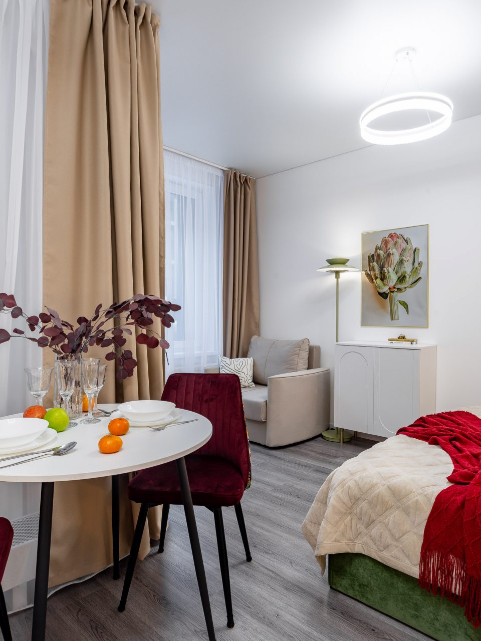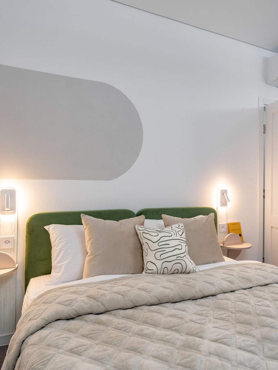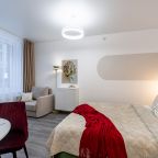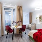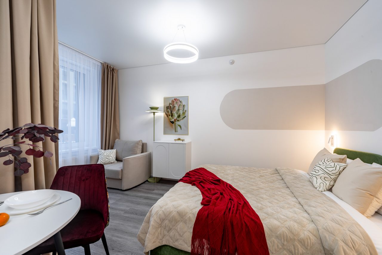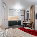 Дизайн интерьера оформлен в современном стиле и приятных цветовых решениях. К услугам гостей: двуспальная кровать, мягкое кресло, телевизор для просмотра любимых телепередач, комод, сплит-система. В санузле есть средства гигиены, набор белоснежных полотенец и установлена стиральная машинка.