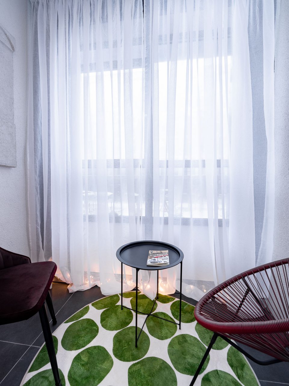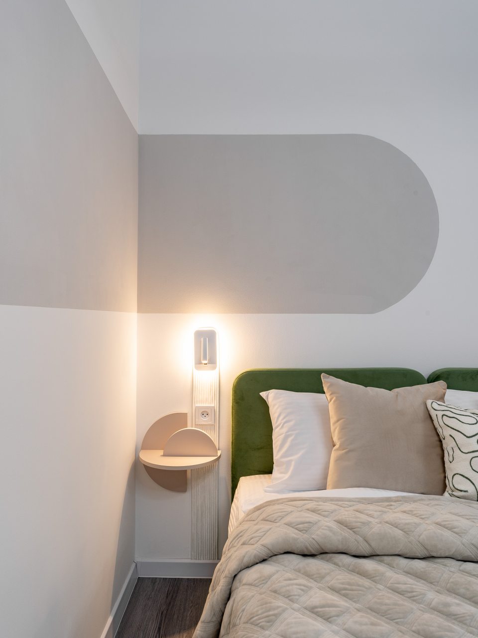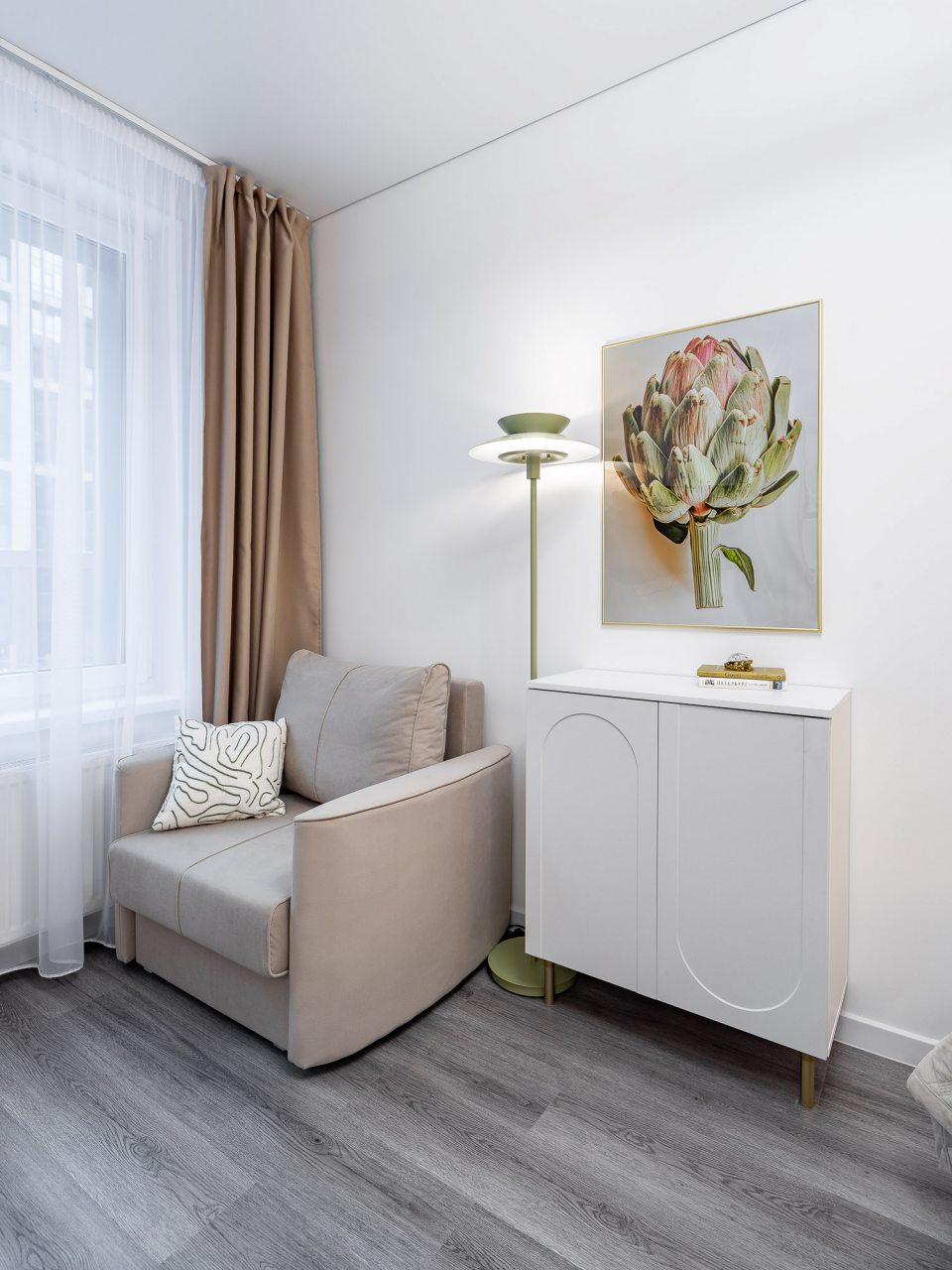 Дизайн интерьера оформлен в современном стиле и приятных цветовых решениях. К услугам гостей: двуспальная кровать, мягкое кресло, телевизор для просмотра любимых телепередач, комод, сплит-система. В санузле есть средства гигиены, набор белоснежных полотенец и установлена стиральная машинка.