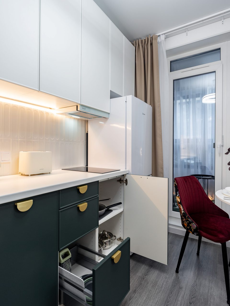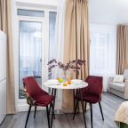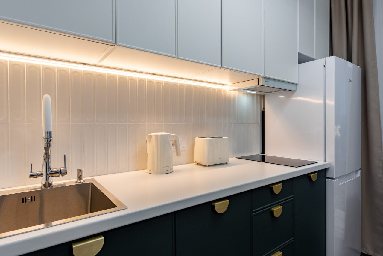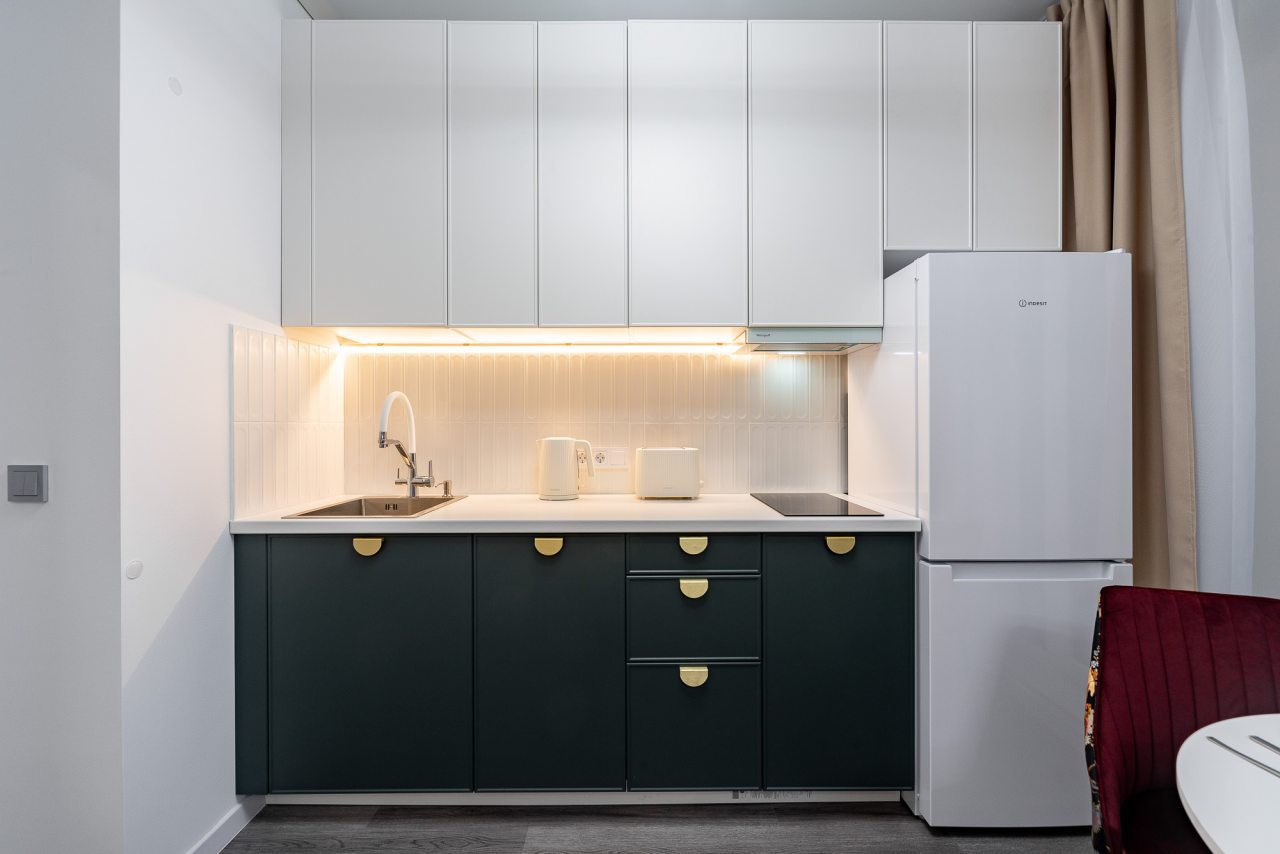 Небольшая кухня укомплектована обеденной зоной, посудой и необходимой техникой: электрический чайник, тостер, варочная панель, холодильник. Неподалеку работает пекарня и супермаркет.