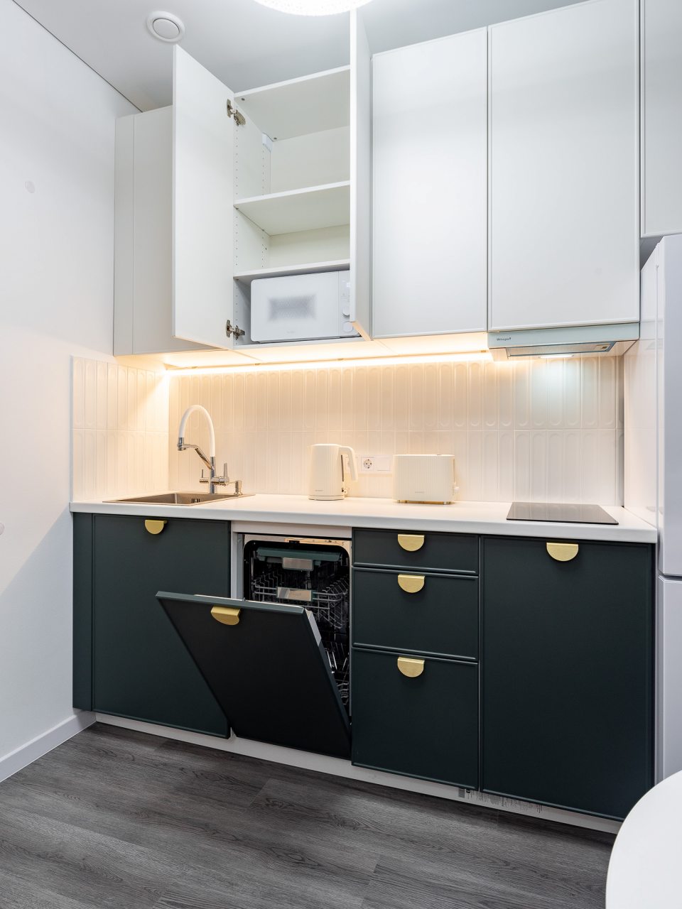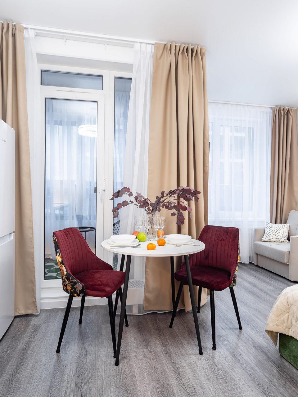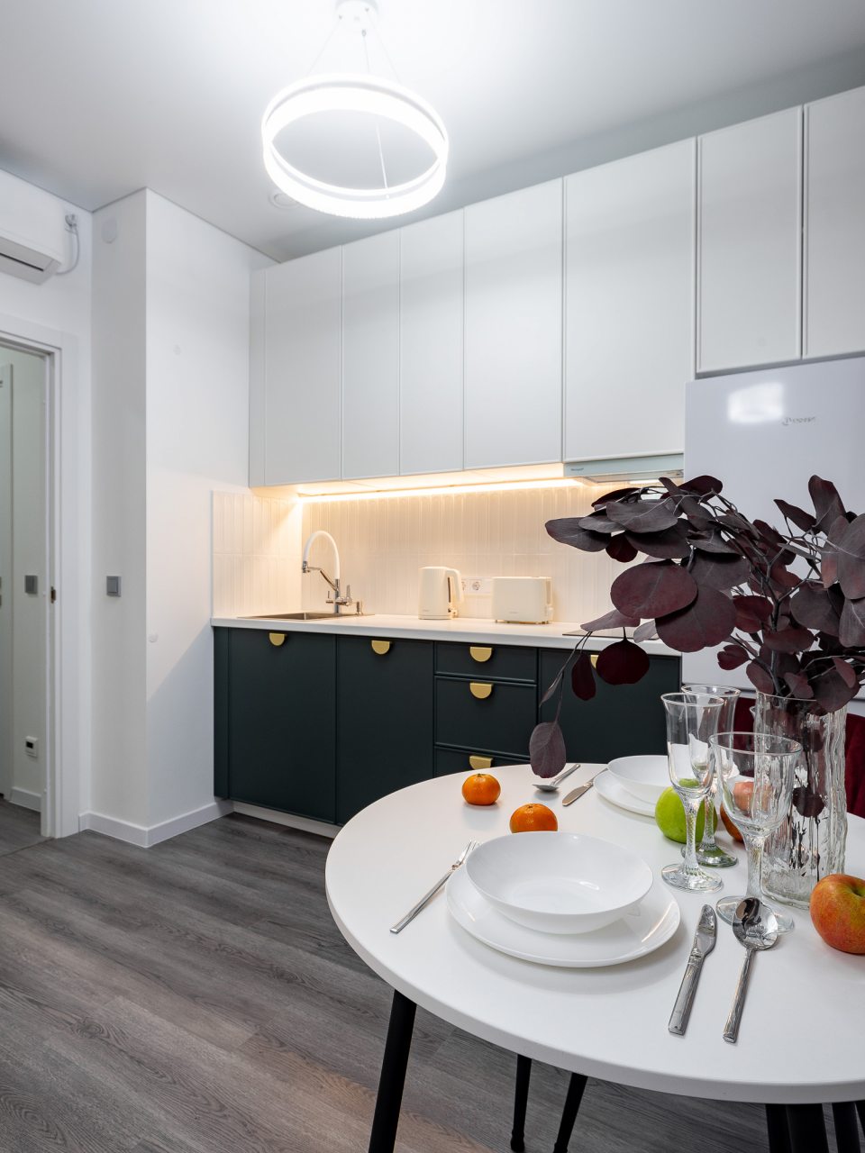 Небольшая кухня укомплектована обеденной зоной, посудой и необходимой техникой: электрический чайник, тостер, варочная панель, холодильник. Неподалеку работает пекарня и супермаркет.