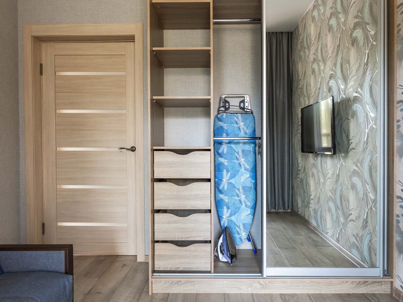 Уютная квартира обустроена комфортабельной мебелью, стиральной машиной, шкафом для вещей, телевизором, Wi-Fi, балконом. Из удобств также имеется набор полотенец, гигиенические средства, гладильные принадлежности.