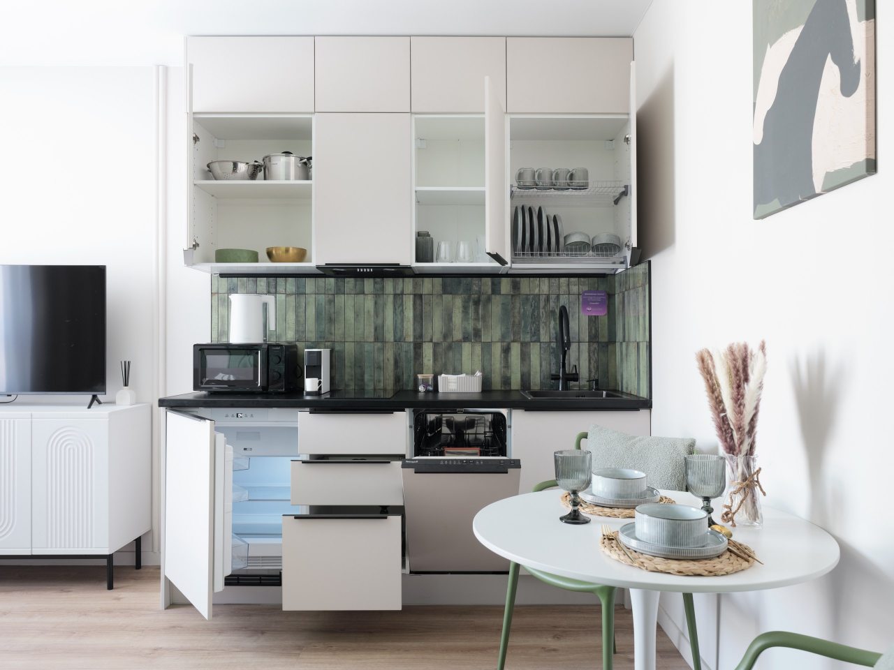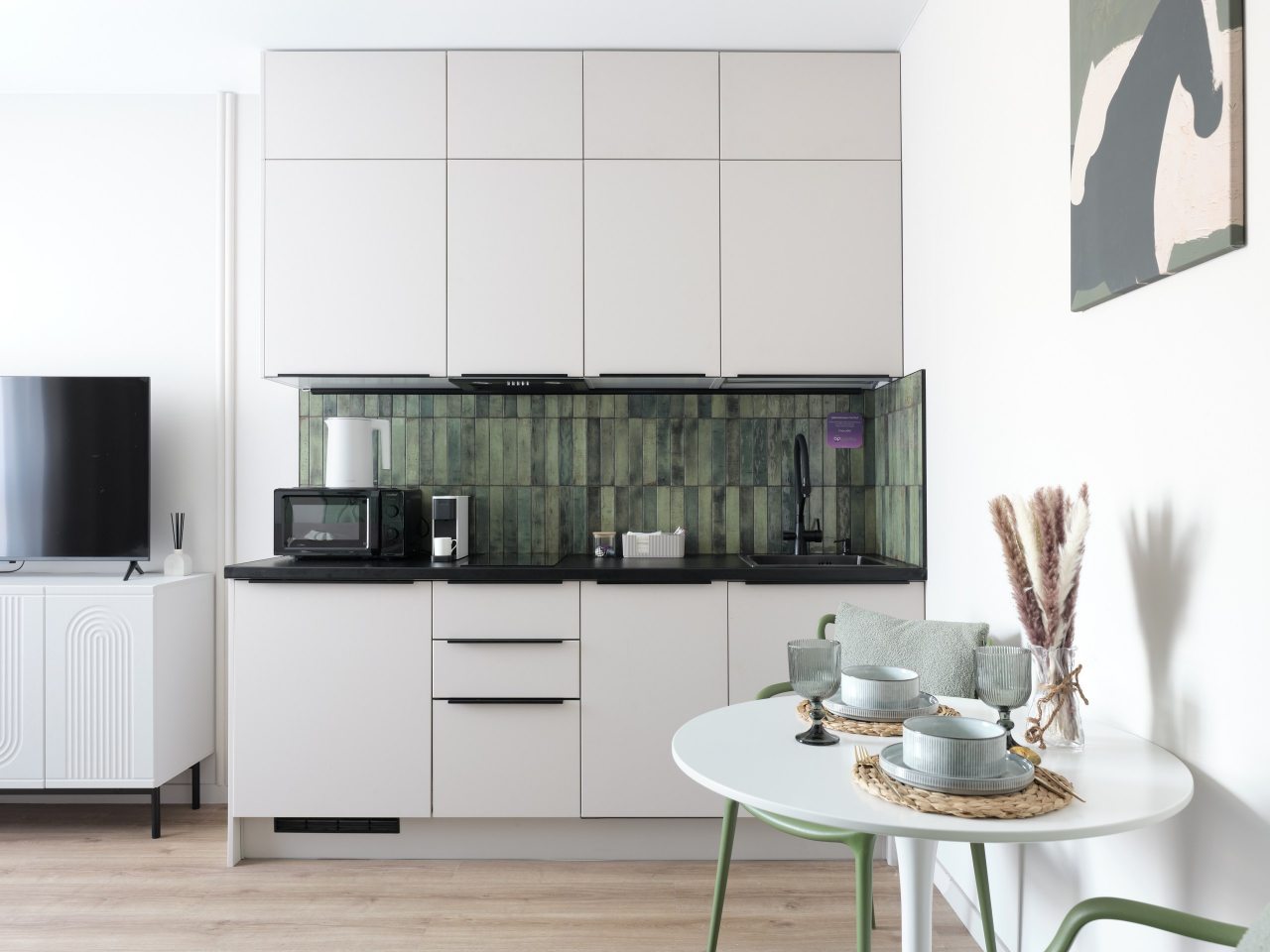 На мини-кухне установлена бытовая техника, имеется барная стойка, посуда и кухонные принадлежности. Поблизости работает популярный фудмолл, где можно посетить разнообразные кафе и рестораны.