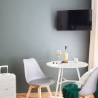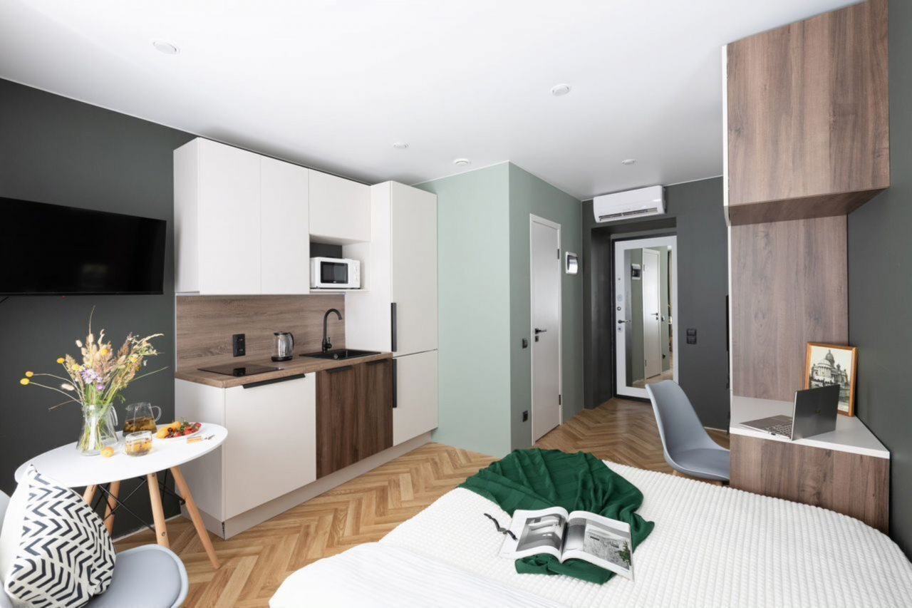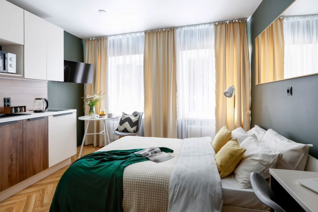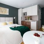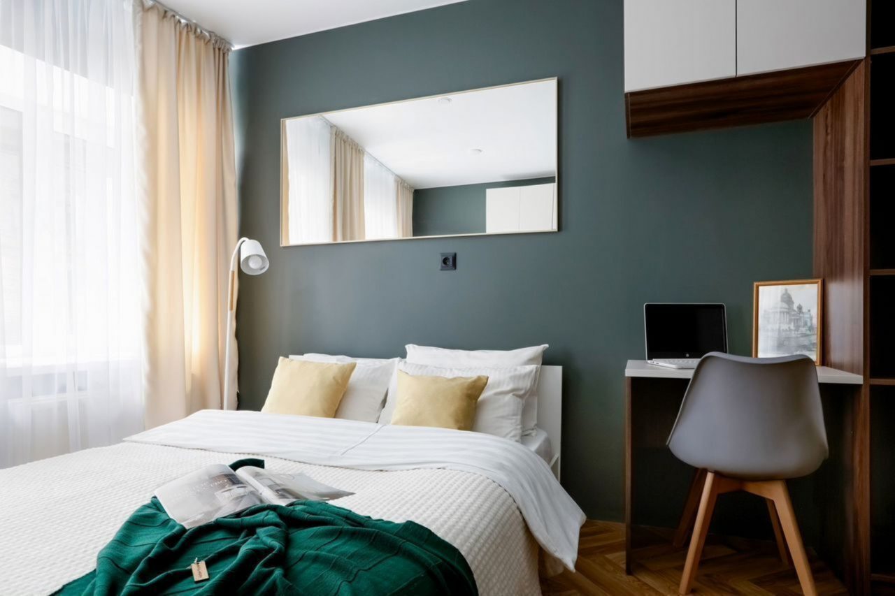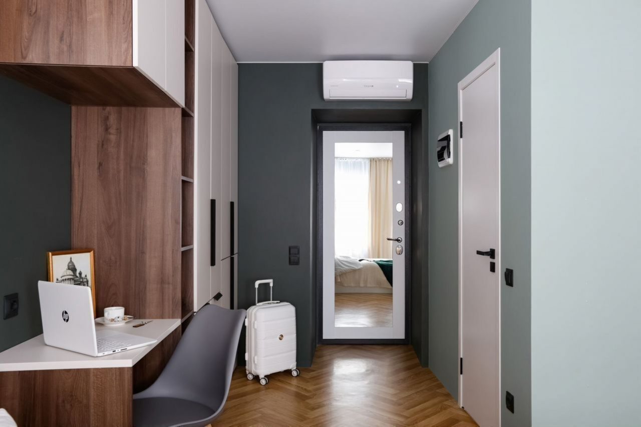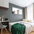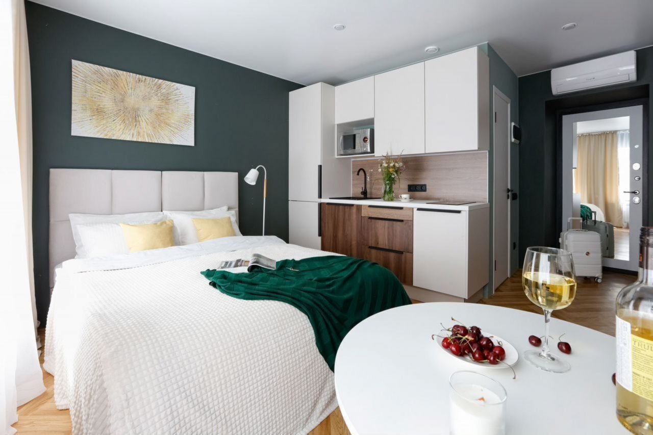 Для проживания и отдыха гостей предоставляются комфортабельные апартаменты со стильным и современным дизайном. Из удобств установлены: сплит-система, зеркало, телевизор и удобная кровать.