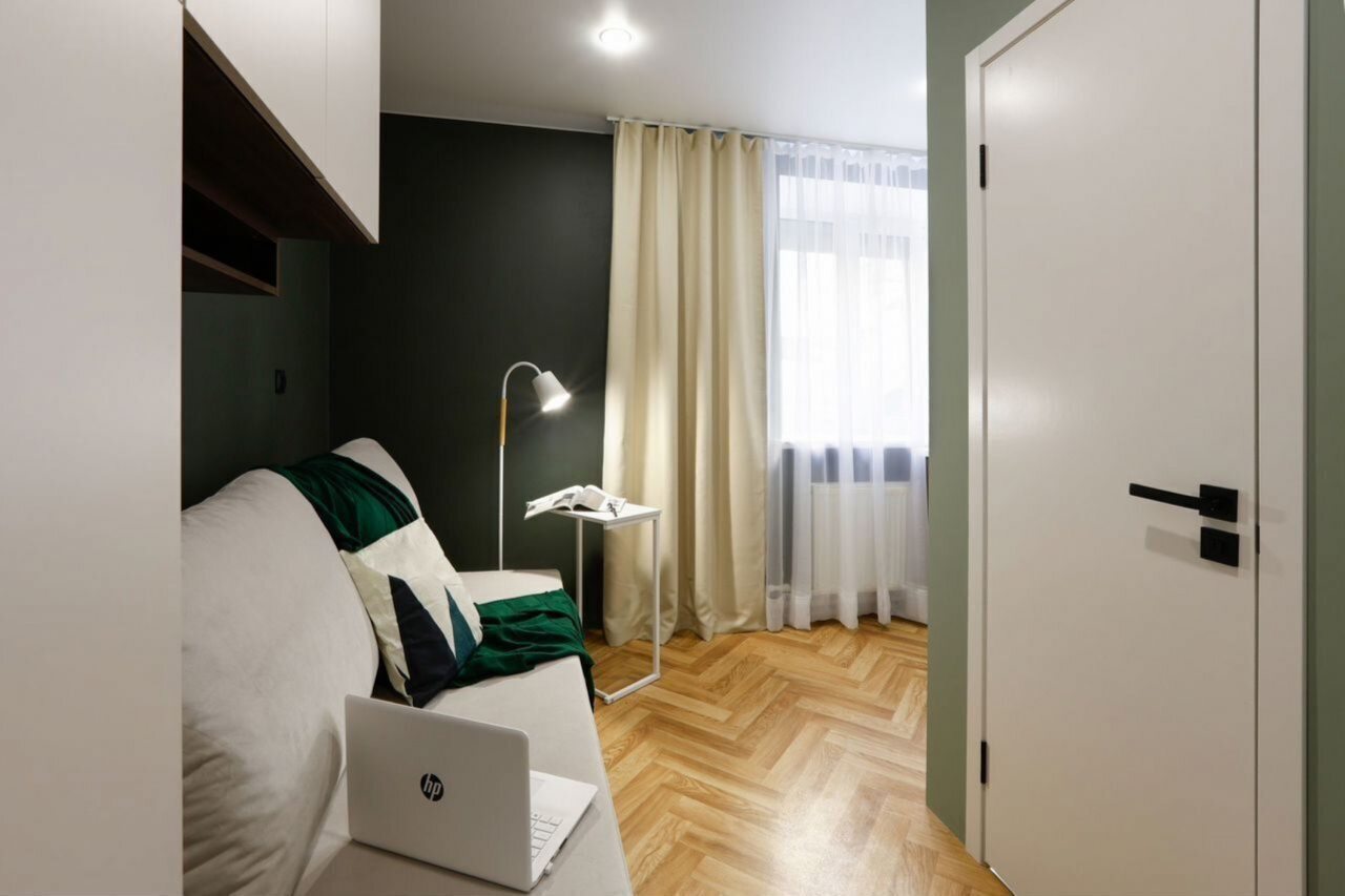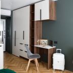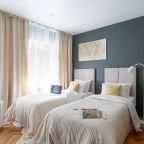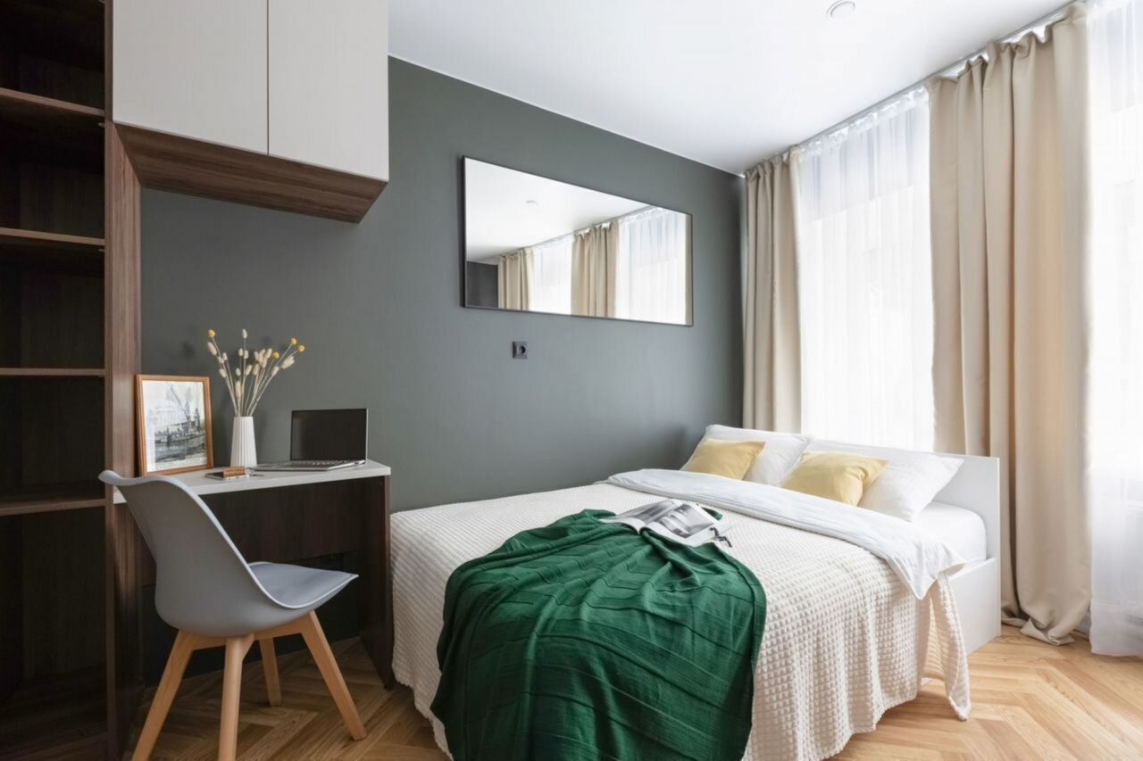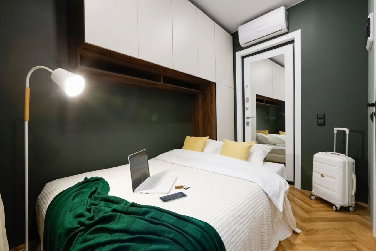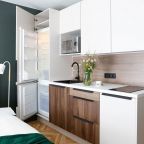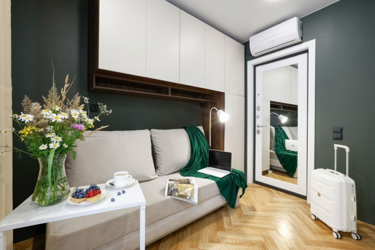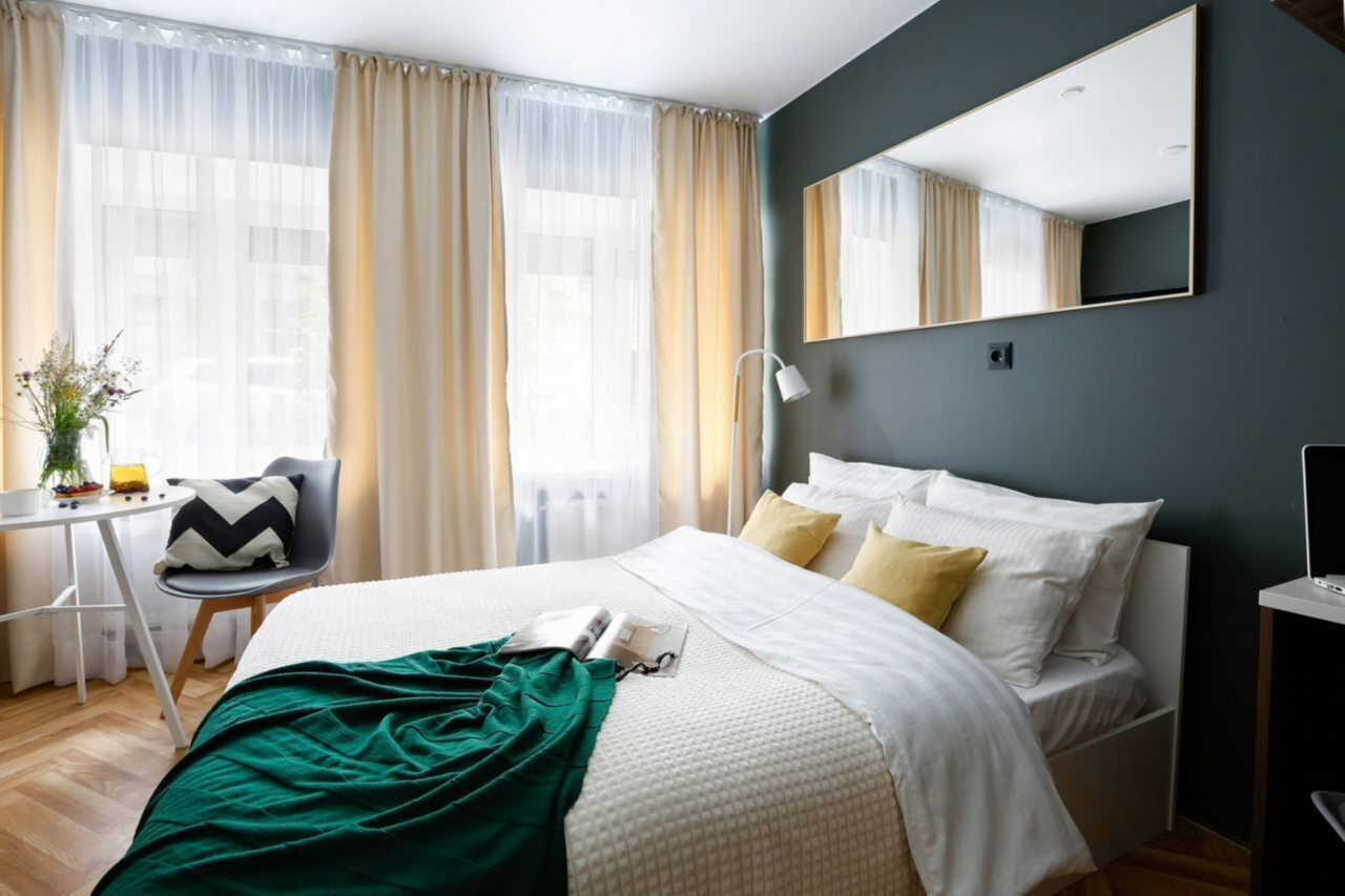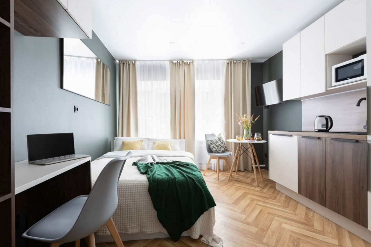 Для проживания и отдыха гостей предоставляются комфортабельные апартаменты со стильным и современным дизайном. Из удобств установлены: сплит-система, зеркало, телевизор и удобная кровать.