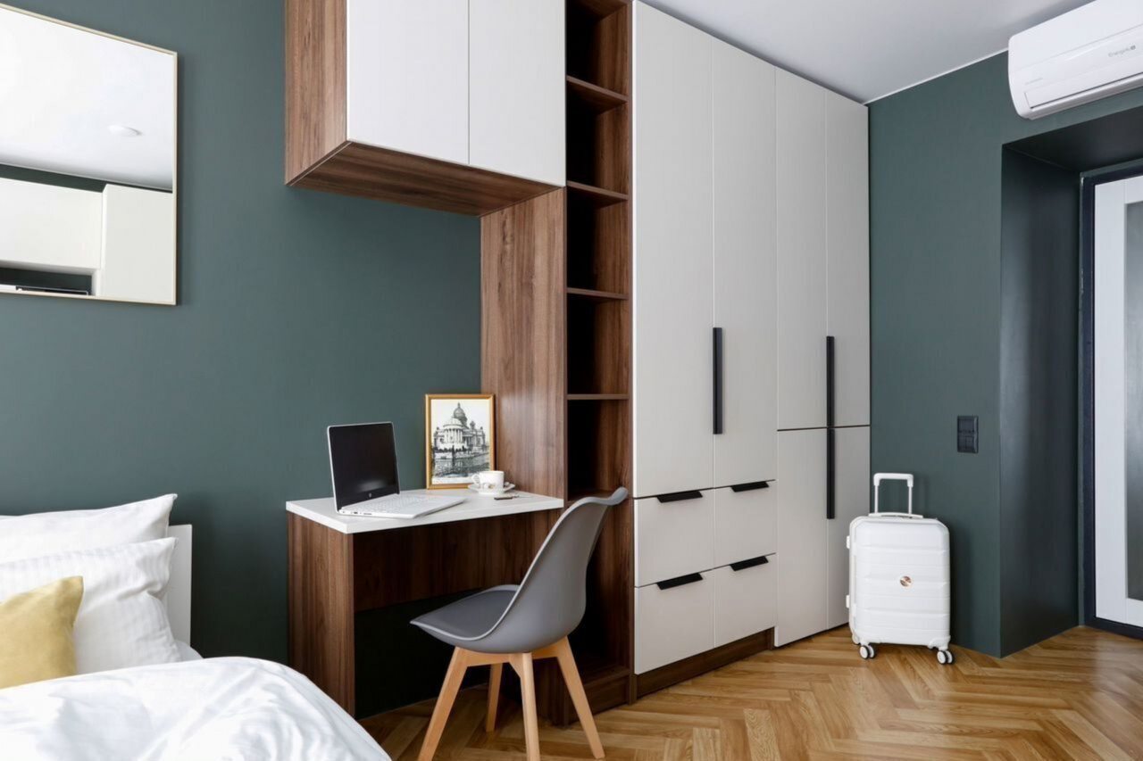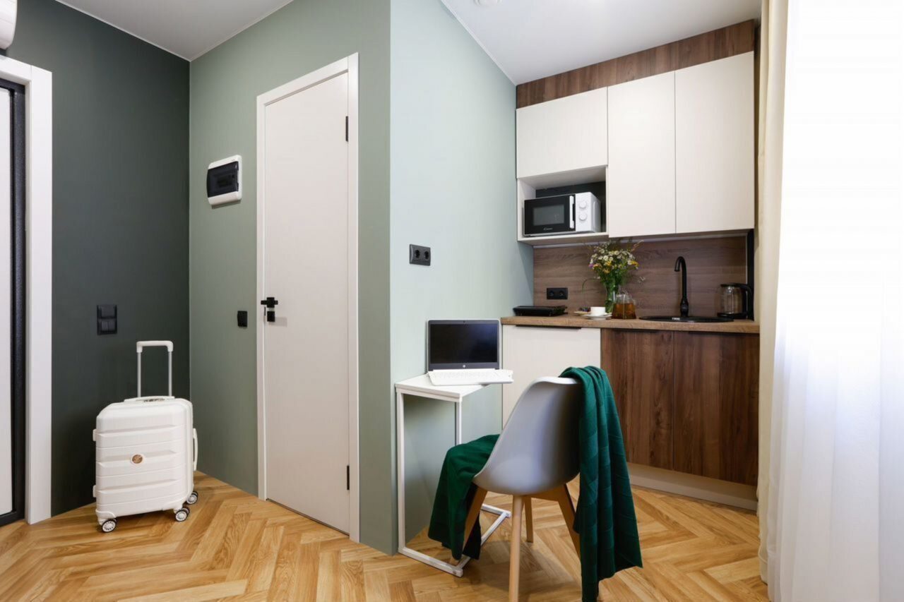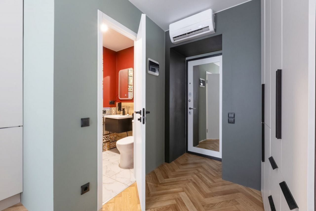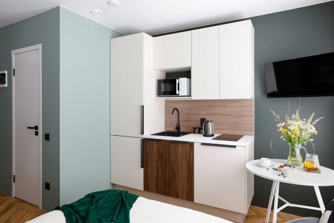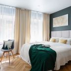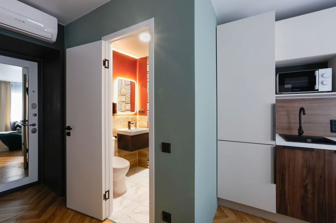 Для проживания и отдыха гостей предоставляются комфортабельные апартаменты со стильным и современным дизайном. Из удобств установлены: сплит-система, зеркало, телевизор и удобная кровать.