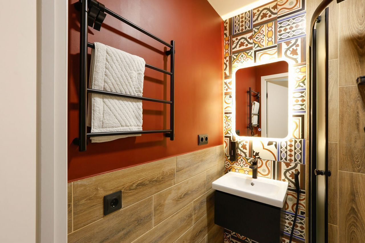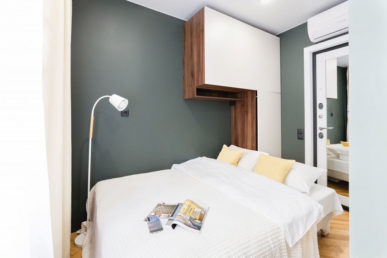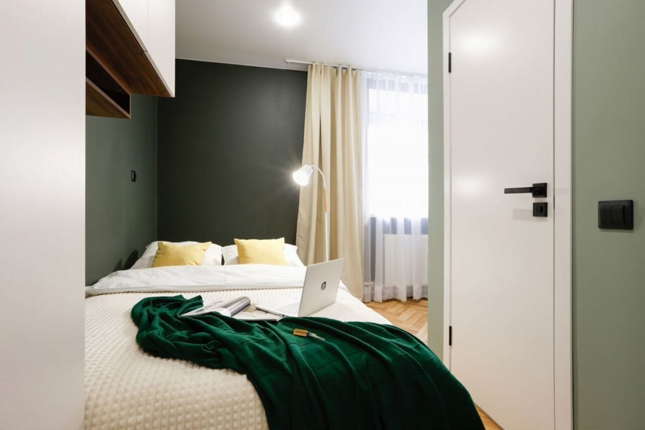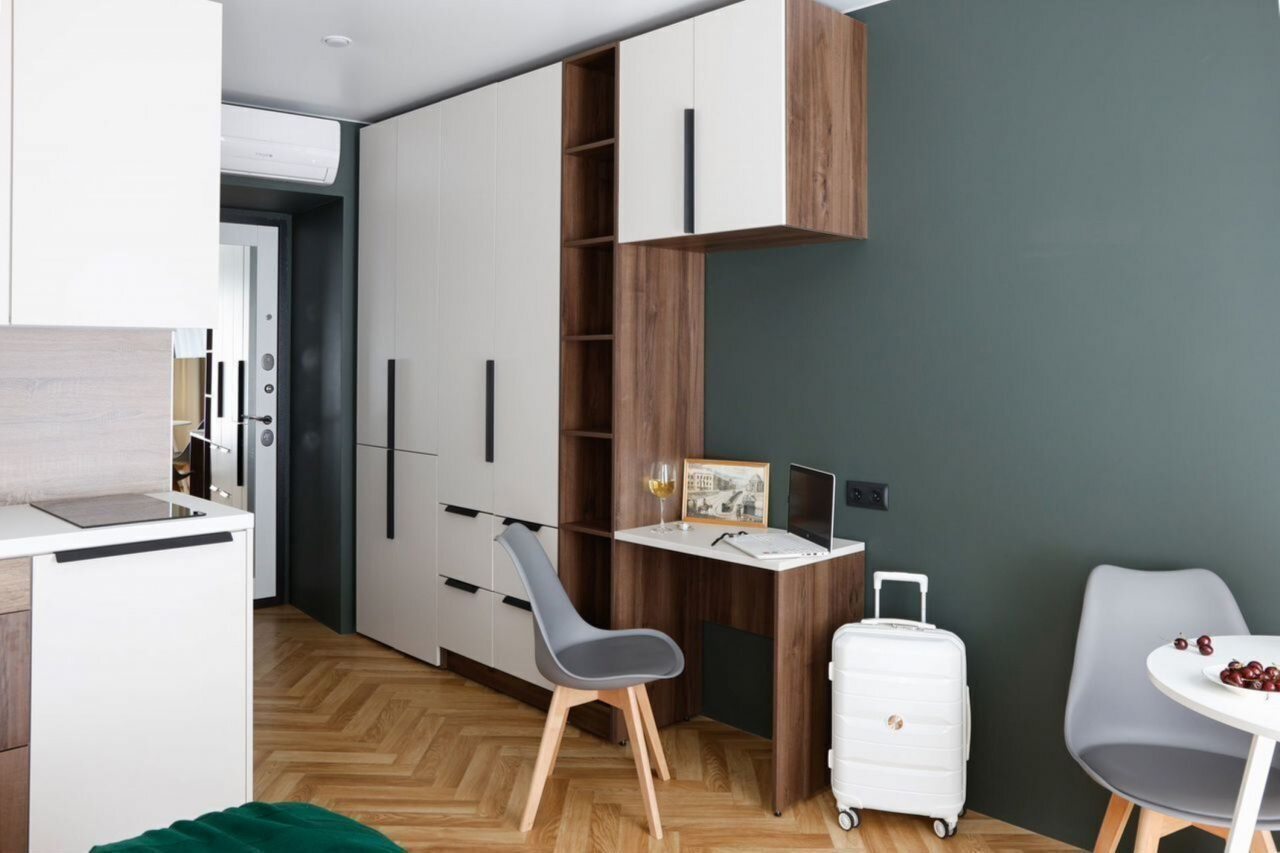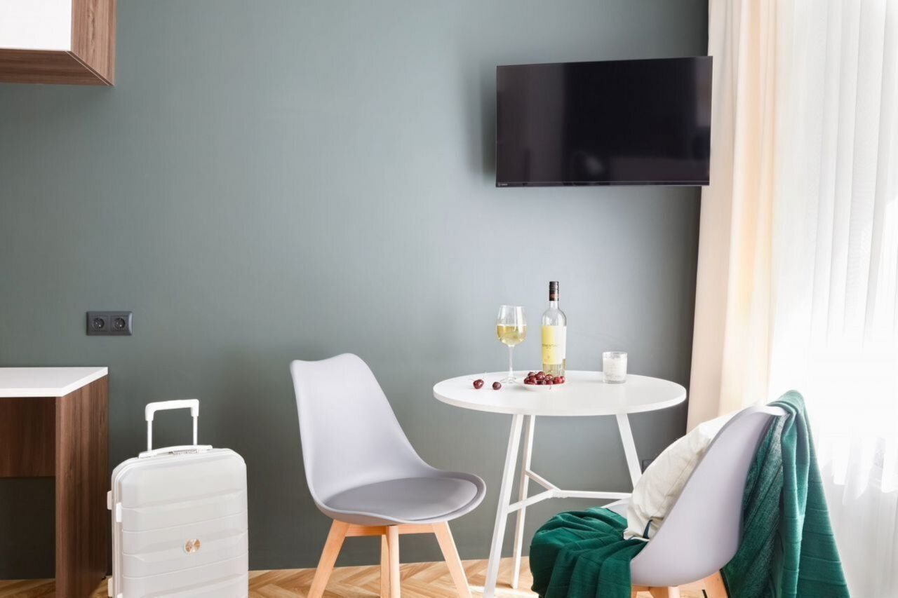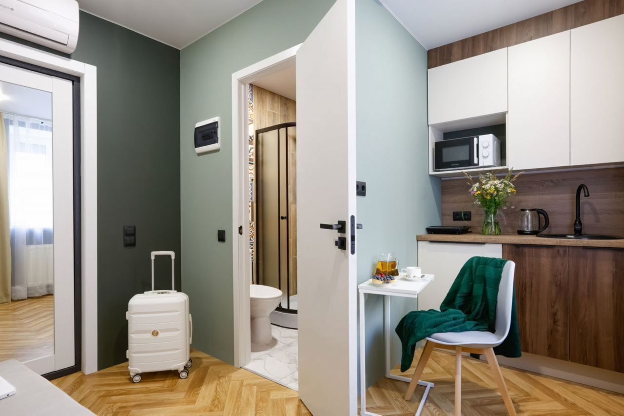 Для проживания и отдыха гостей предоставляются комфортабельные апартаменты со стильным и современным дизайном. Из удобств установлены: сплит-система, зеркало, телевизор и удобная кровать.
