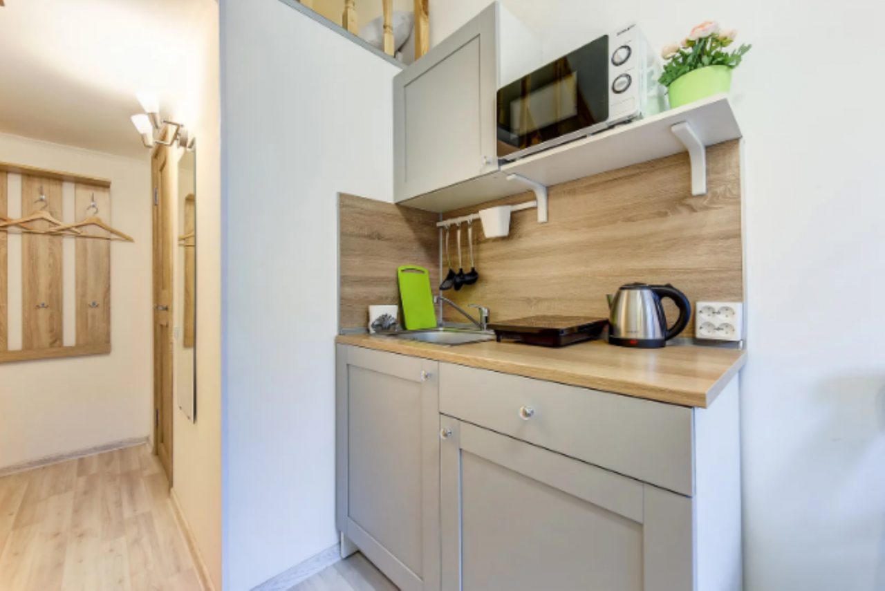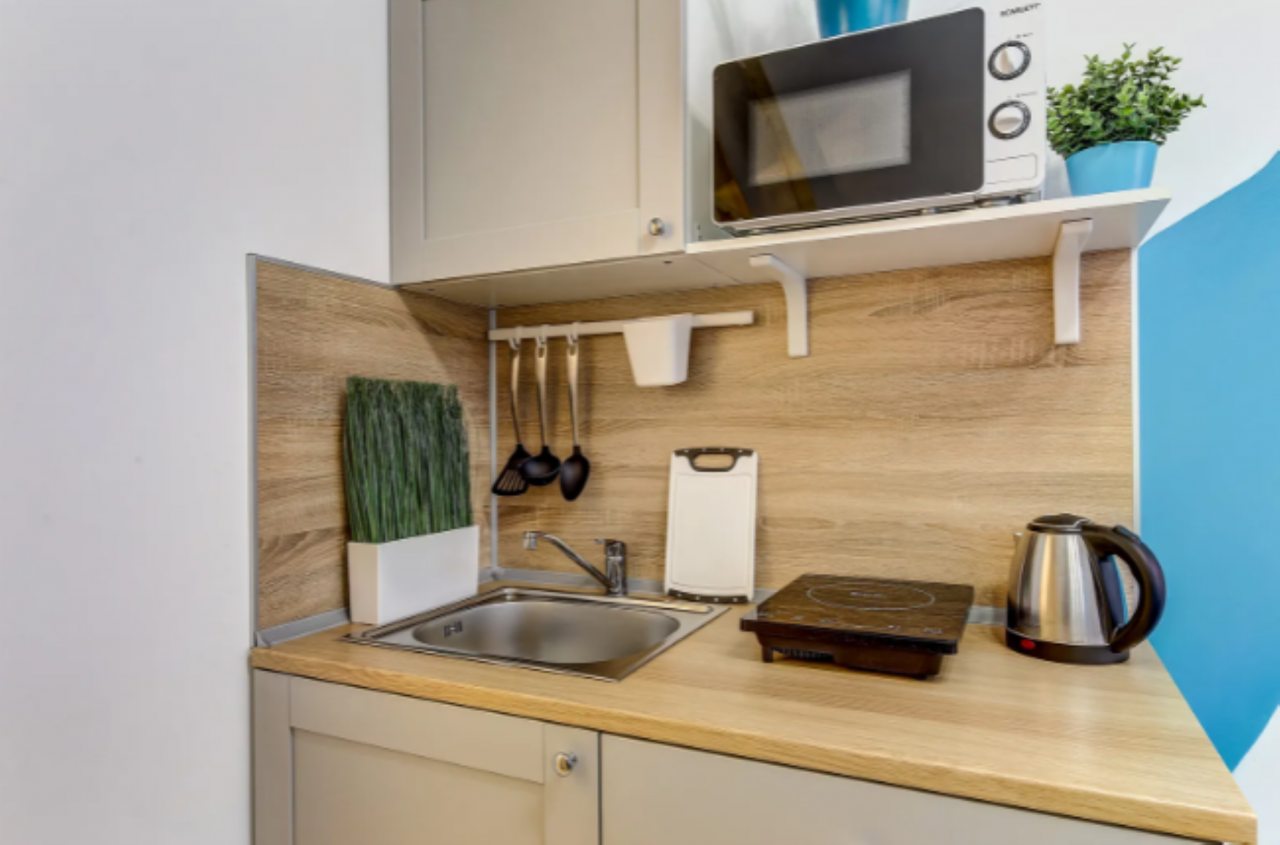 Комплектация кухонной бытовой техники может варьироваться в зависимости от категории. В большинстве имеется чайник, варочная панель, холодильник, СВЧ-печь, уютная обеденная зона.
