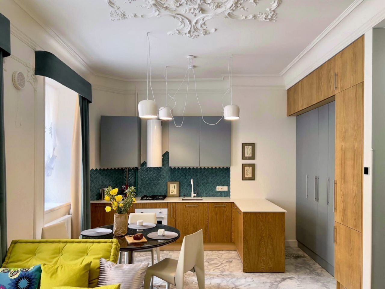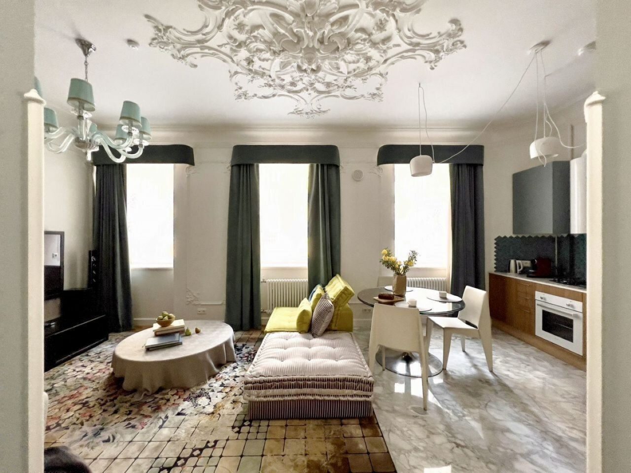 Апартаменты выполнены в сочетании современного стиля интерьера и «Ар-деко». Они оформлены удобной и качественной мебелью, техникой и всем самым необходимым для отдыха: удобная кровать с набором мягкого постельного белья, телевизор, мягкое кресло, обеденная зона на несколько гостей. В ванной комнате есть средства гигиены и полотенца.