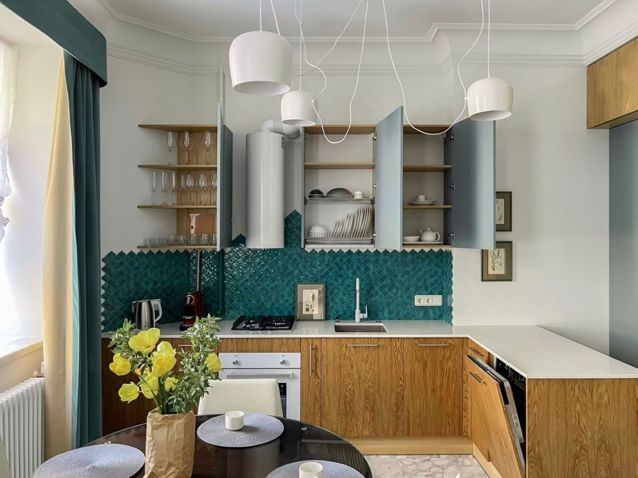 Кухня оснащена посудой и бытовой техникой для организации питания: электрический чайник, газовая плита, духовой шкаф, холодильник. Рядом есть несколько заведений питания, где можно вкусно и сытно пообедать.