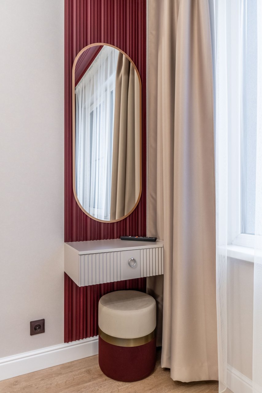 На выбор будущим постояльцам предлагаются просторная однокомнатная квартира, роскошный 4-х комнатный пентхаус с шикарным видом из окна и собственной террасой, а также жилье с тремя комнатами, одна из которых оформлена в уникальном стиле - купе вагона поезда. Гостям также будут предложены комфортные спальные места и гипоаллергенными подушками, шкаф-купе, журнальные столики, диваны, телевизор и WI-FI. В ванной комнате: душ и ванна и стиральные машины.