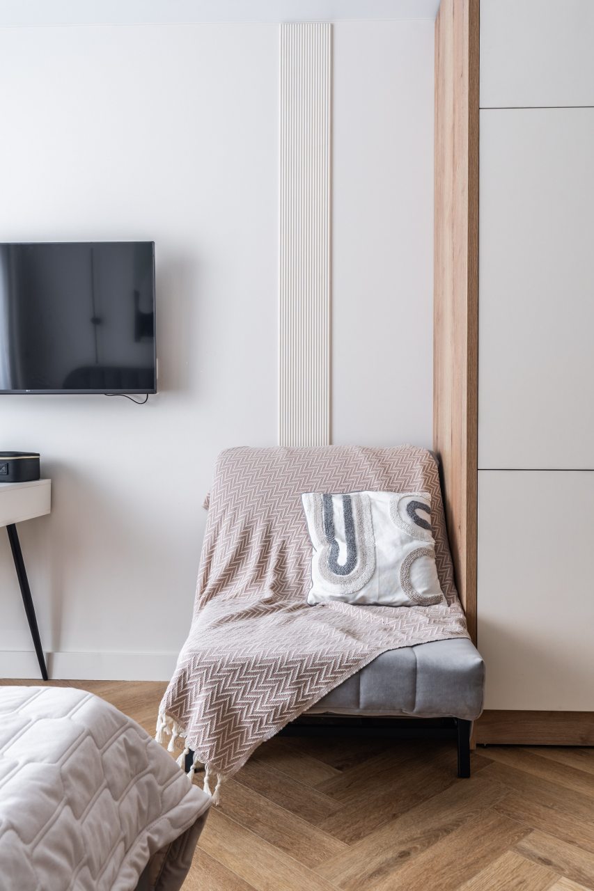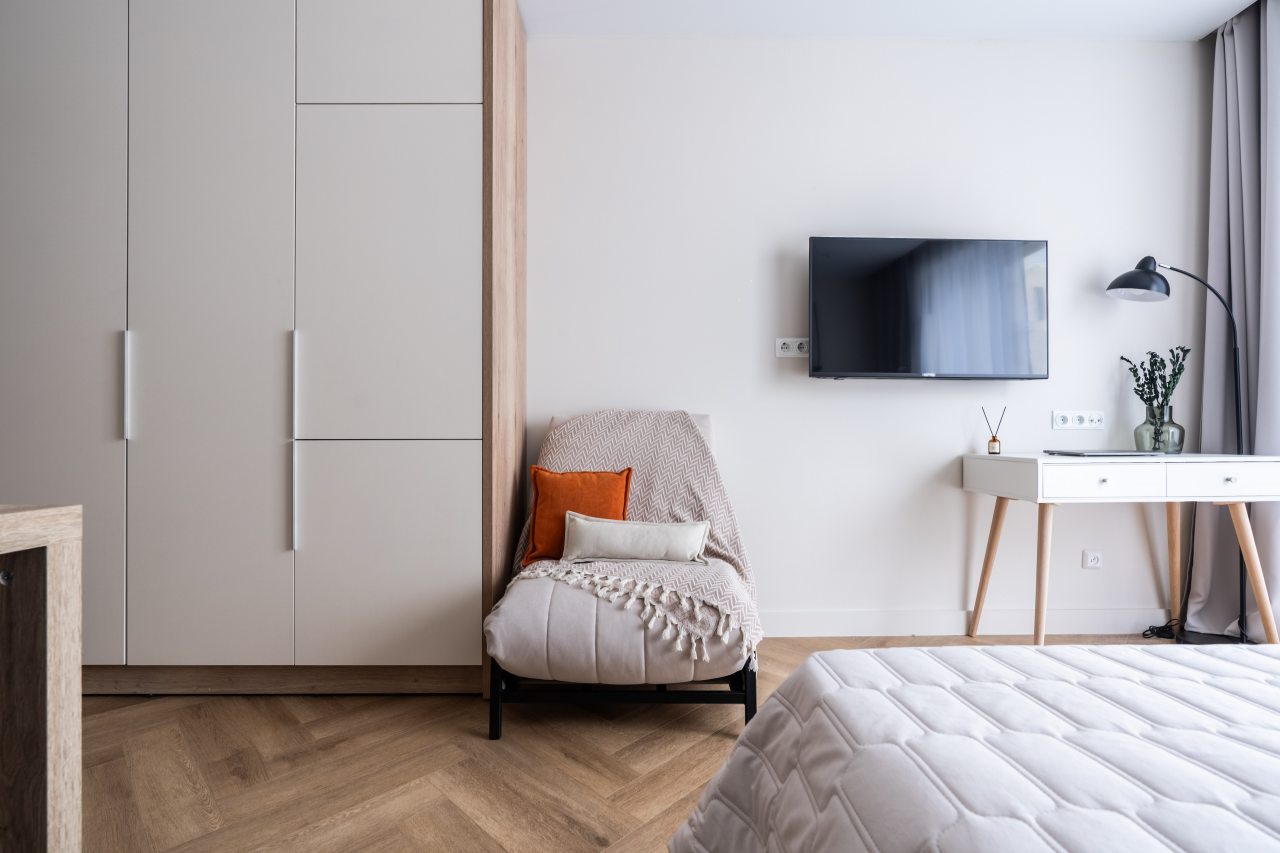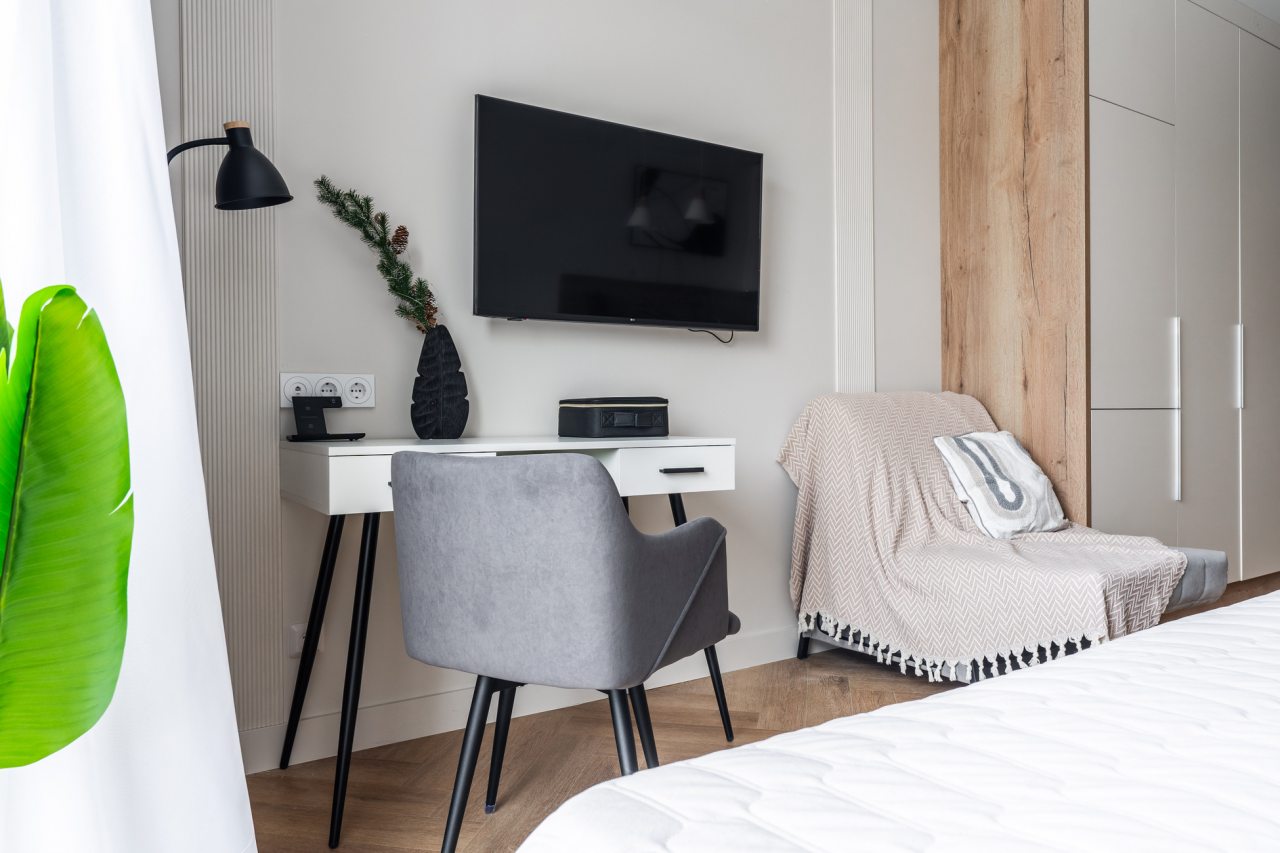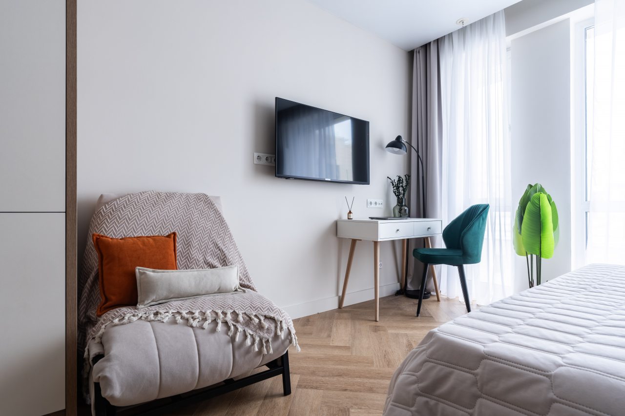 Уютное и комфортное жилье включает в себя: большую и удобную кровать, стол, полки, телевизор, отдельную ванную комнату с душевой кабиной.
