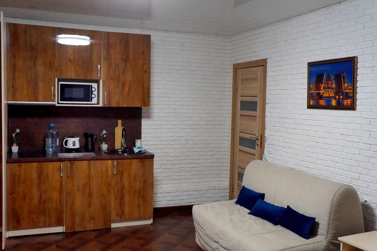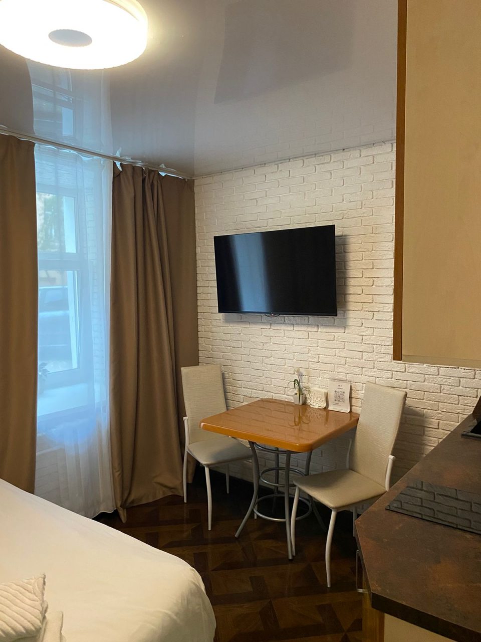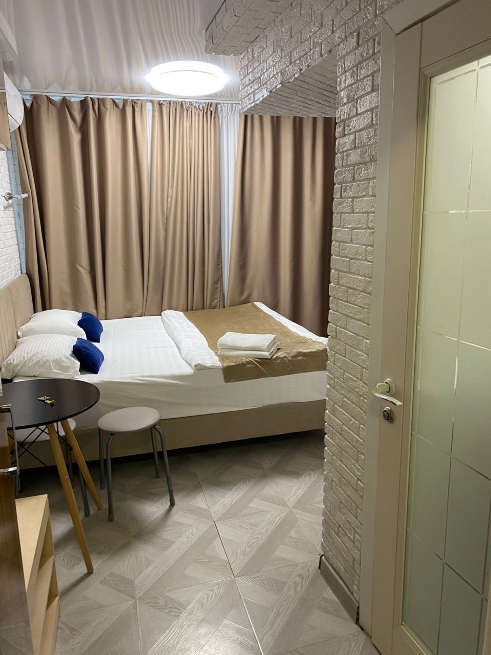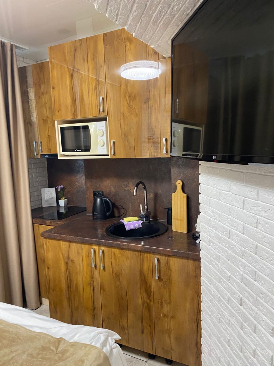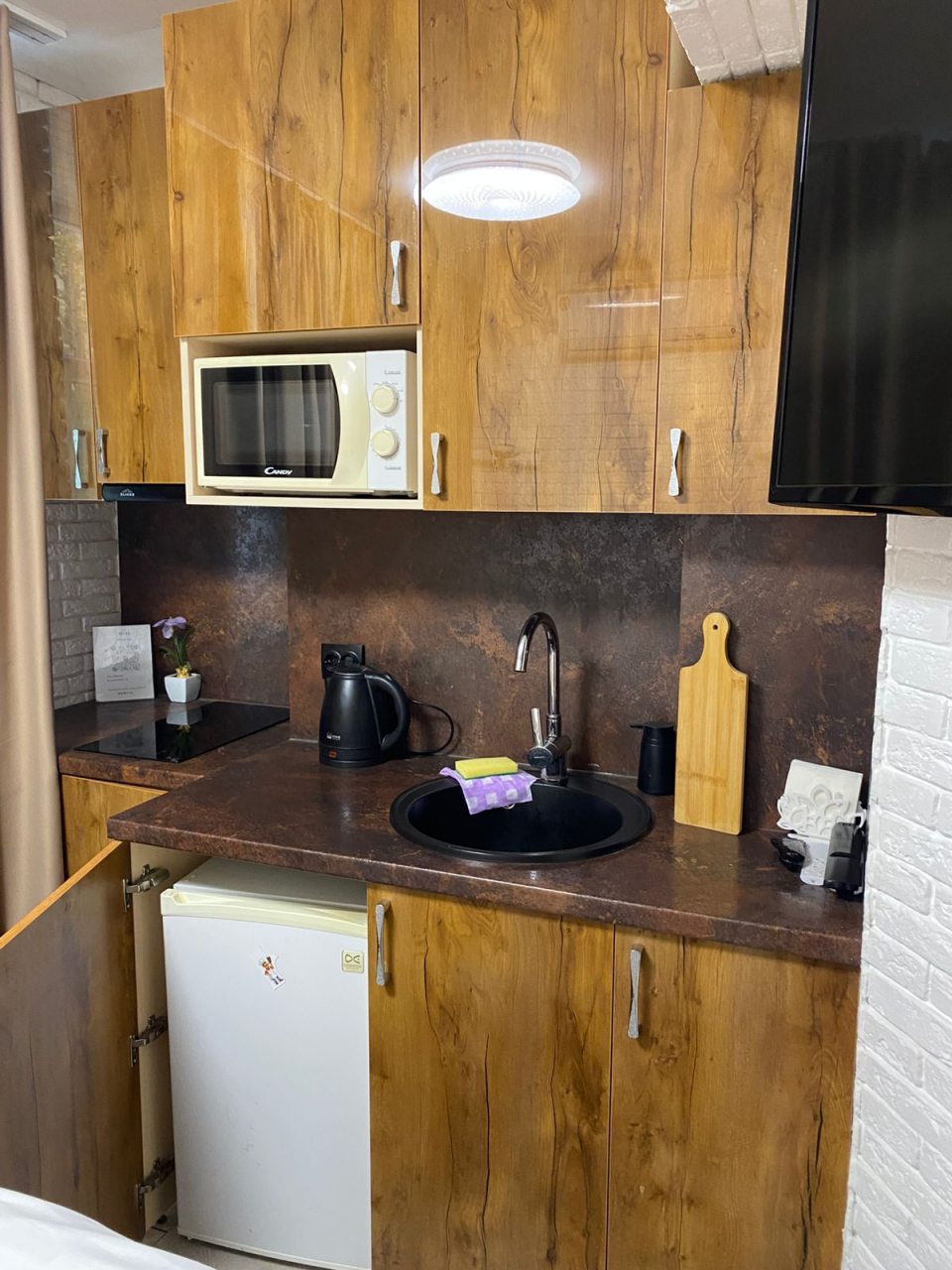 Местонахождение удобное, до достопримечательностей можно добраться пешком. Стоянка находится прямо под окнами гостиницы, на территории жилого комплекса, а ворота открывает администратор через пульт, так что постоянные поездки на автомобиле будут затруднены. Магазин "Пятерочка" располагается буквально за углом, всего в 20 метрах. Кухня оборудована индукционной плитой, встроенным мини-холодильником и стиральной машиной. В наличии электрический чайник, микроволновая печь и посуда для двоих. Также предоставляются утюг и компактная гладильная доска.