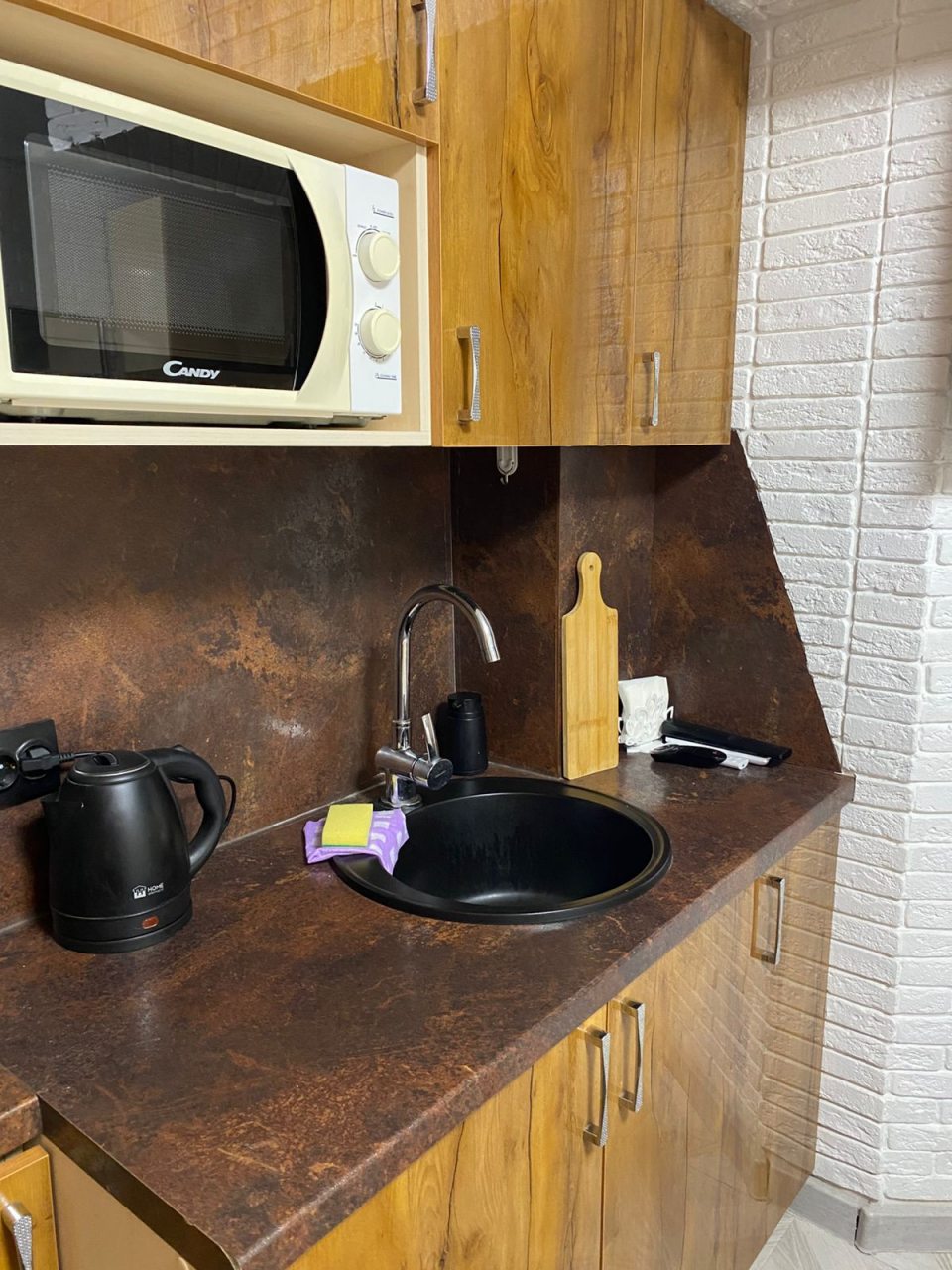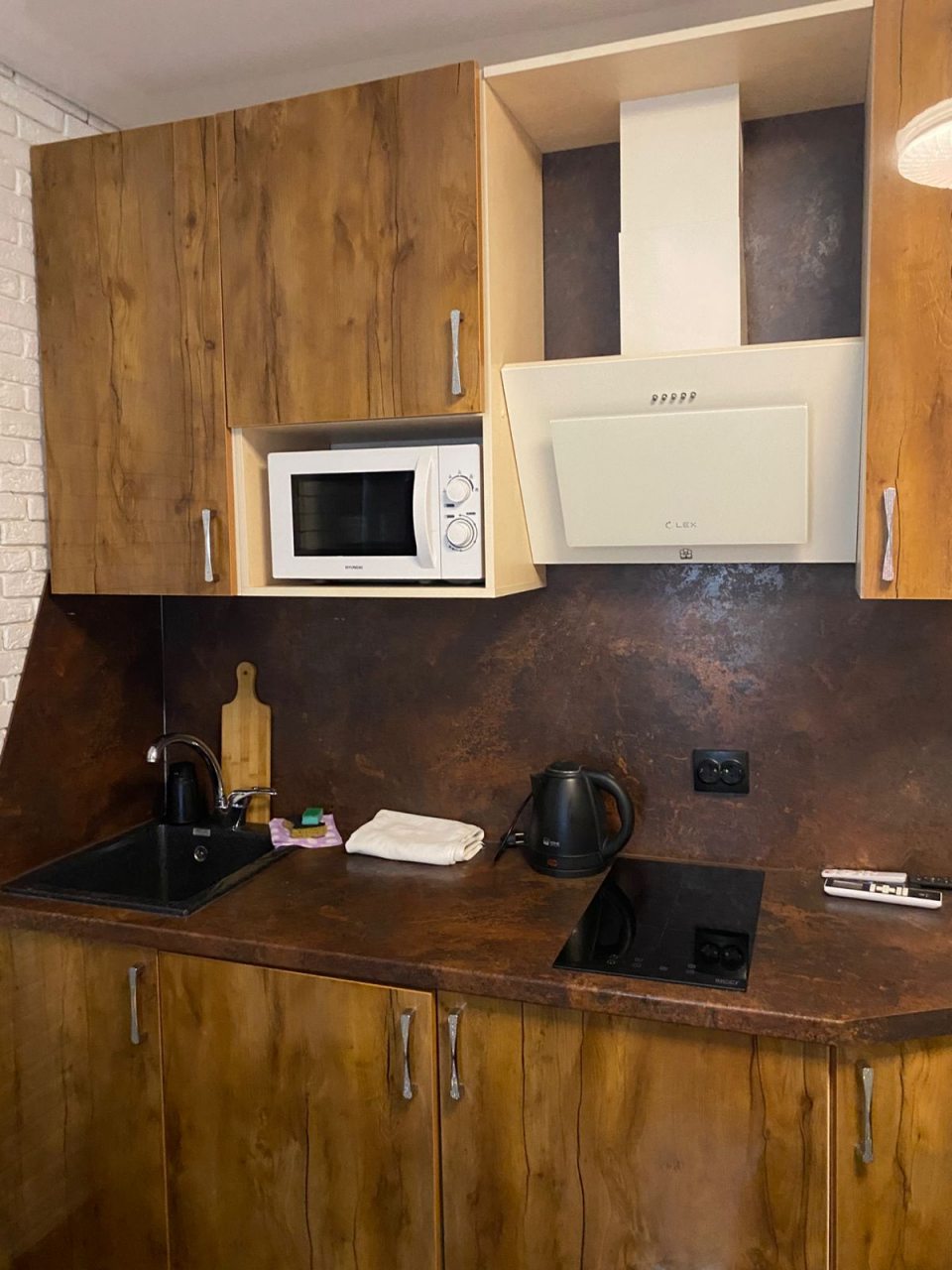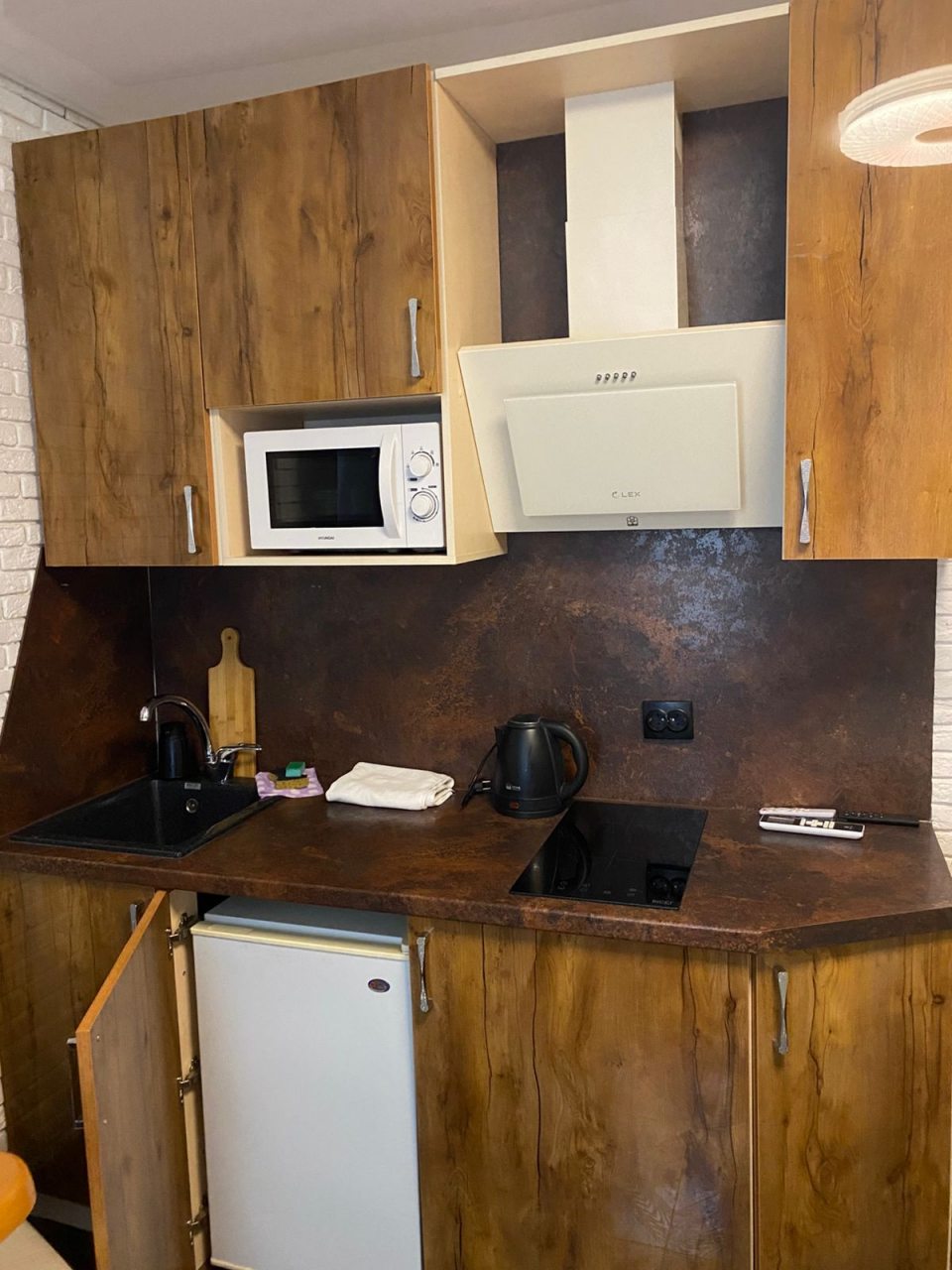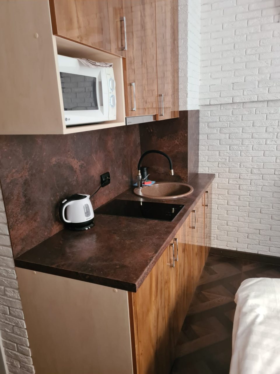 Местонахождение удобное, до достопримечательностей можно добраться пешком. Стоянка находится прямо под окнами гостиницы, на территории жилого комплекса, а ворота открывает администратор через пульт, так что постоянные поездки на автомобиле будут затруднены. Магазин "Пятерочка" располагается буквально за углом, всего в 20 метрах. Кухня оборудована индукционной плитой, встроенным мини-холодильником и стиральной машиной. В наличии электрический чайник, микроволновая печь и посуда для двоих. Также предоставляются утюг и компактная гладильная доска.