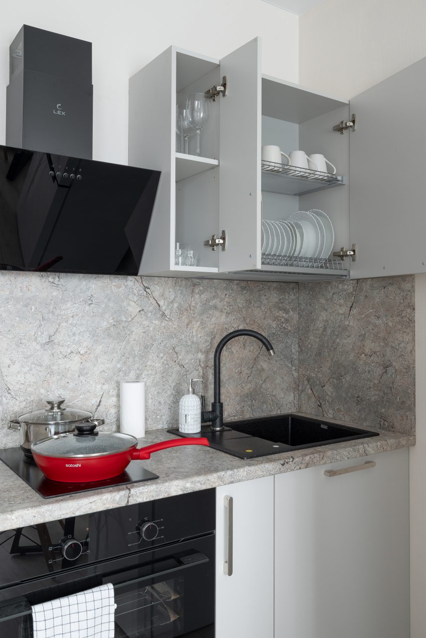 Стильная кухня укомплектована небольшим гарнитуром, духовым шкафом, вытяжкой, электрочайником, холодильником, микроволновой печью, варочной панелью. Вкусно пообедать можно в одном из ближайших кафе.