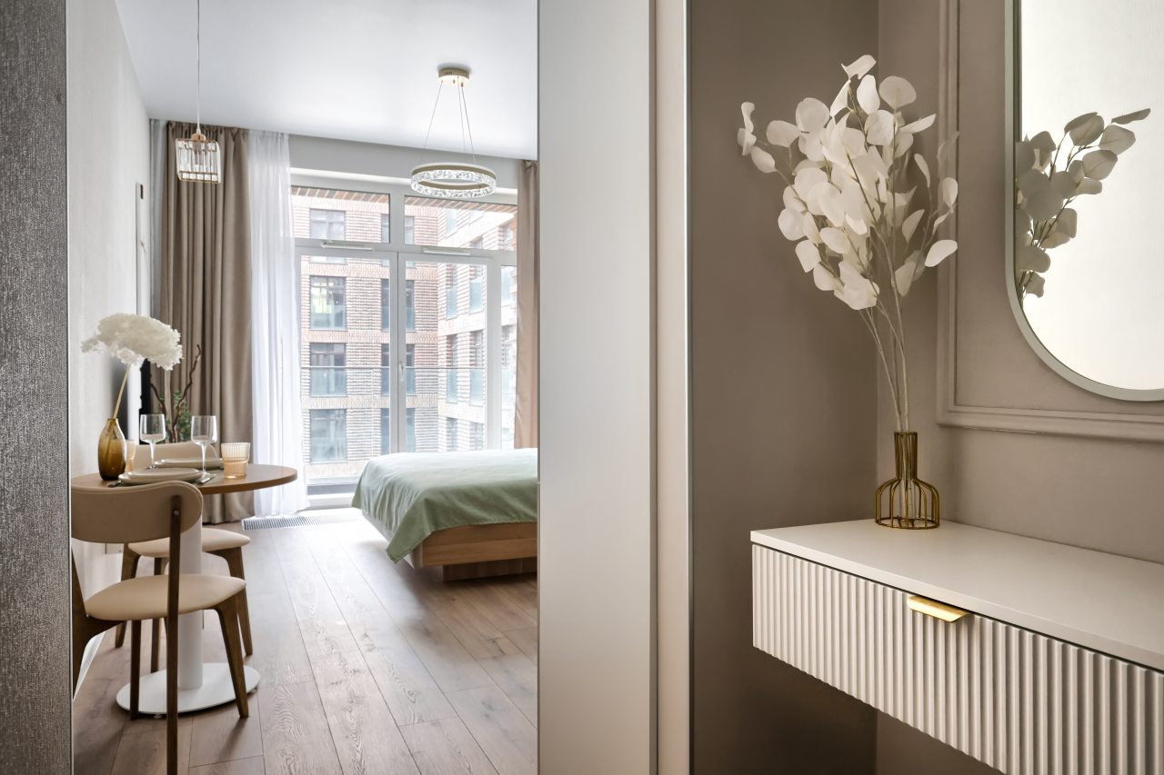 Для размещения гостей подготовлены апартаменты в современном стиле интерьера. Они оснащены качественной мебелью и техникой для приятного времяпровождения и отдыха: двуспальная кровать, телевизор с плоским экраном, зоны для хранения личных вещей. В ванной комнате установлена сантехника, есть средства гигиены и набор полотенец. Из панорамных окон открывается красивый вид.