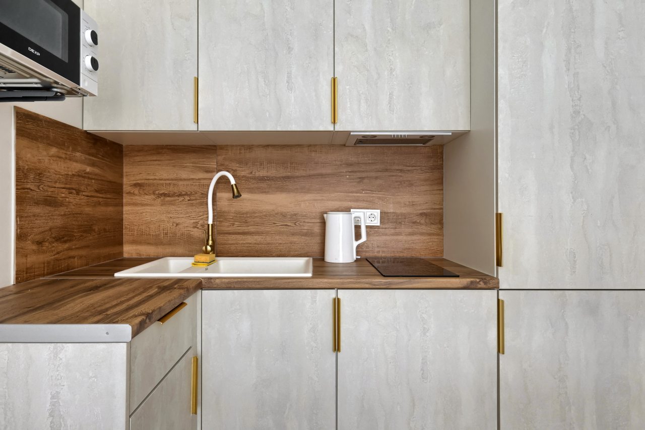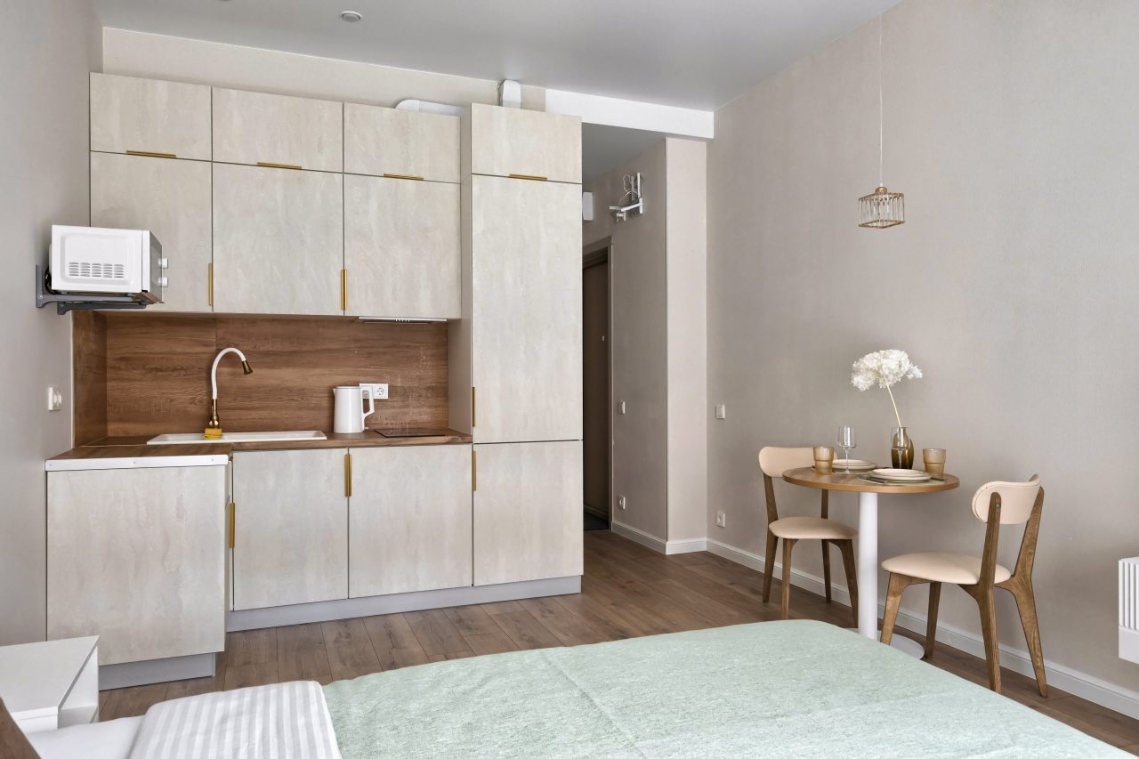 На кухне имеется вся необходимая техника для самостоятельной организации питания: варочная панель, электрический чайник, холодильник, СВЧ-печь. В шаговой доступности работают различные заведения питания, где можно как насладиться горячим кофе, так и полноценно пообедать.