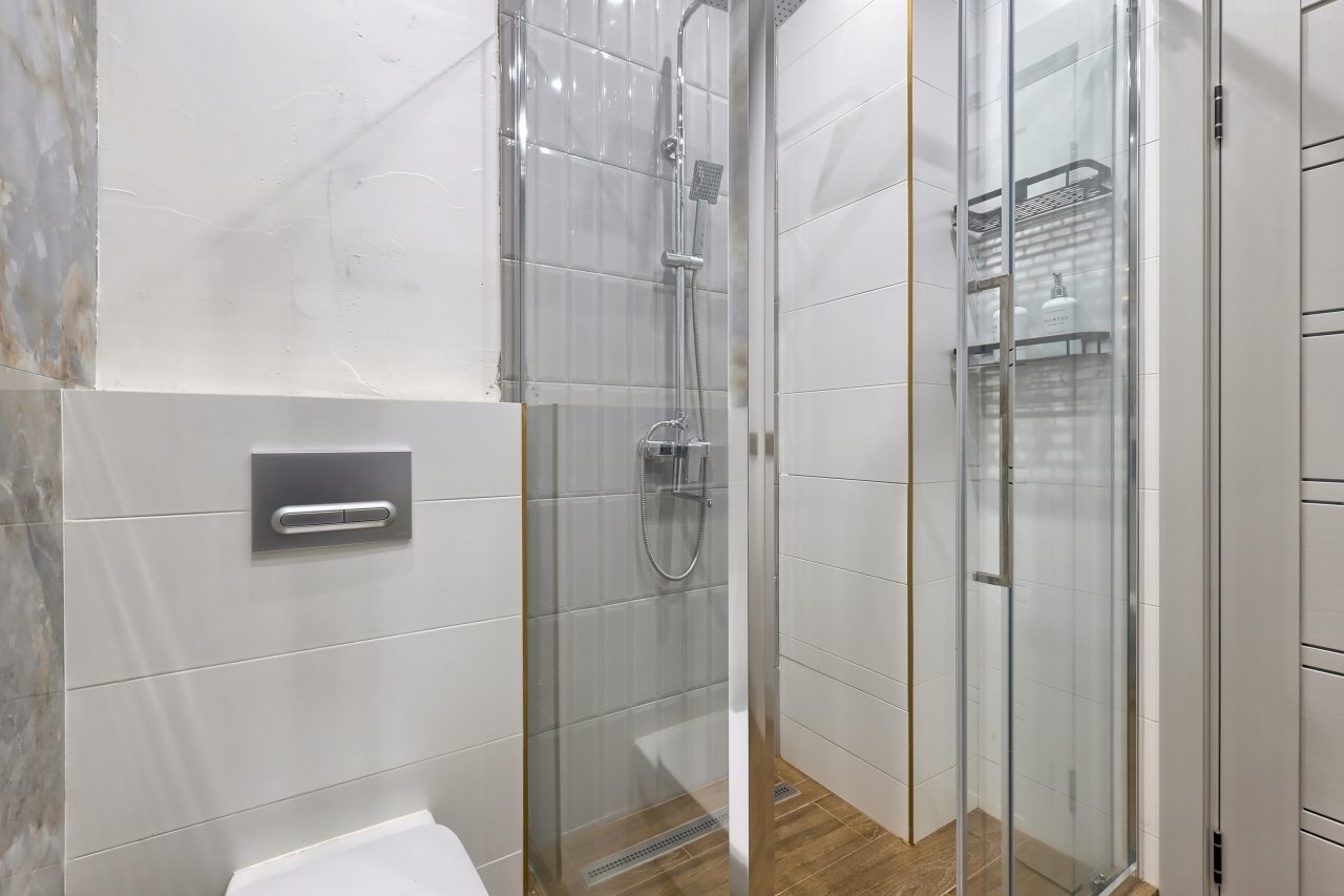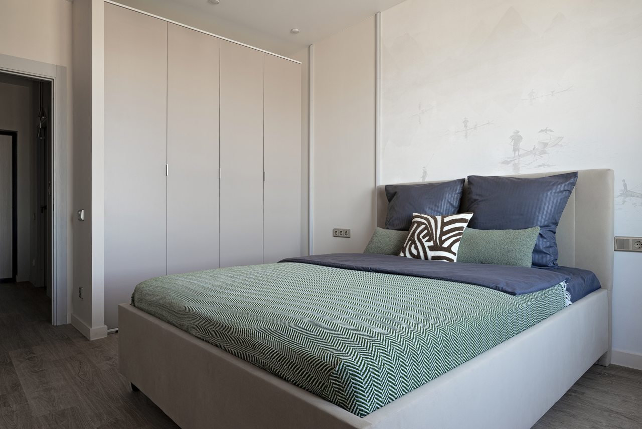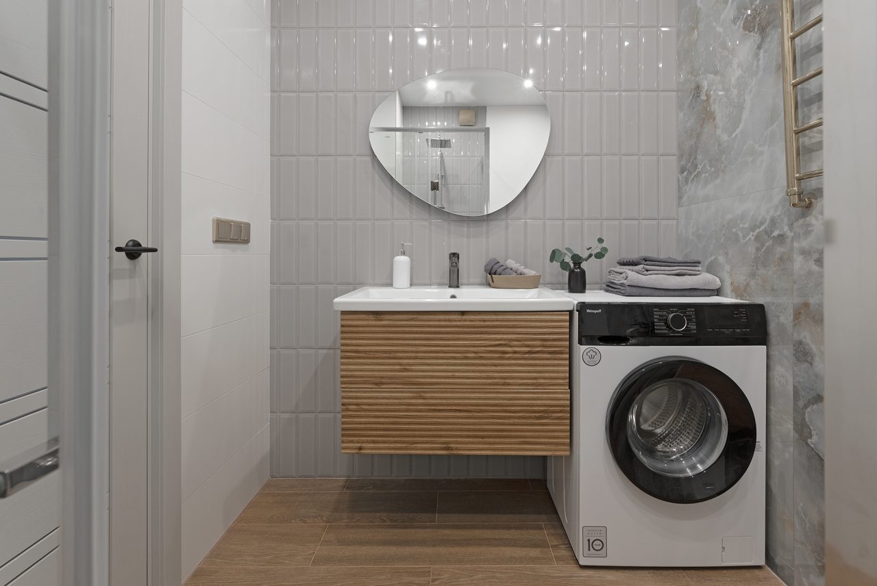 Внутри всё продумано для полноценного отдыха и проживания, включая двуспальную кровать с качественным матрасом, мягкий и удобный диван, вместительный шкаф, а также санузел со стиральной машиной и необходимой сантехникой.