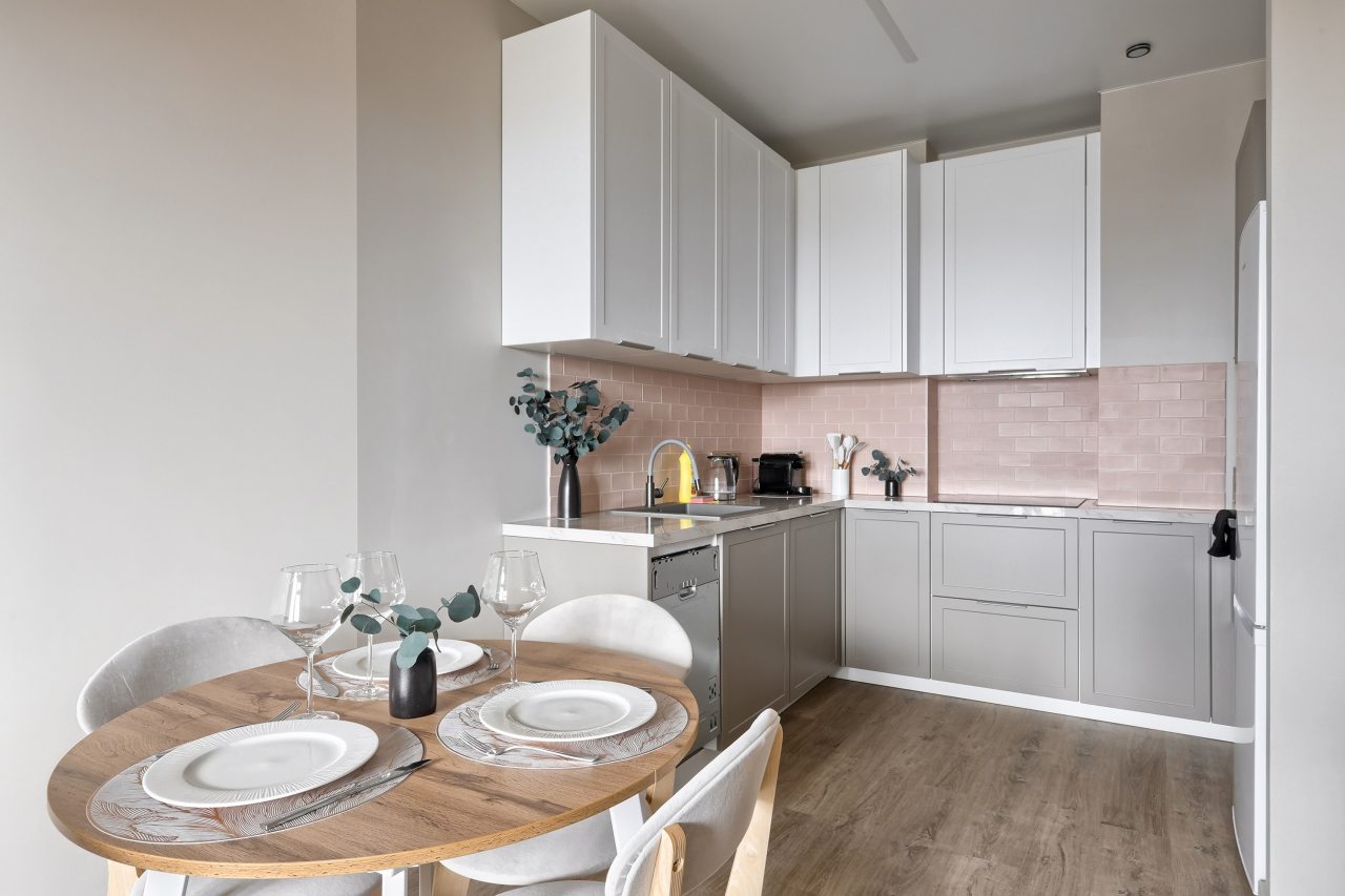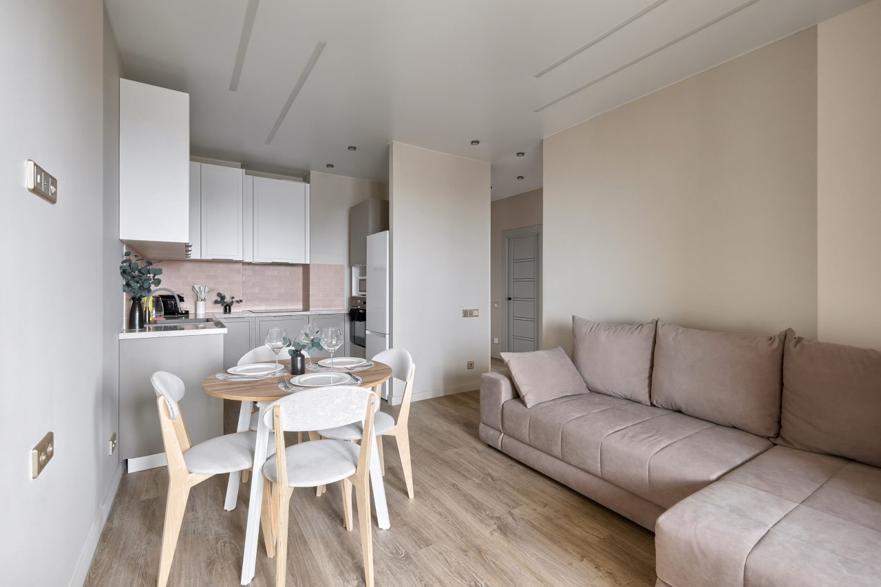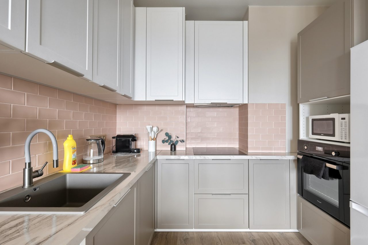 Кухня укомплектована чайником, варочной панелью, кофемашиной, холодильником, различной кухонной утварью, уютной обеденной зоной, чтобы вы в любой момент могли насладиться любимыми домашними напитками и блюдами.