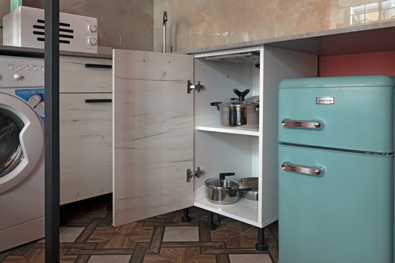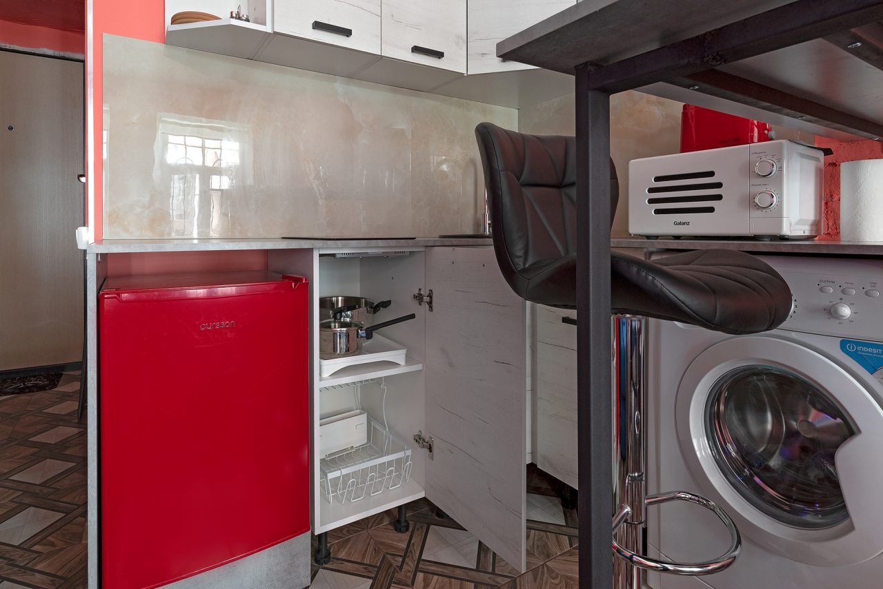 Кухонная зона укомплектована варочной панелью, холодильником, чайником, посудой, СВЧ, чтобы вы могли в любое время насладиться любимой едой и напитками.